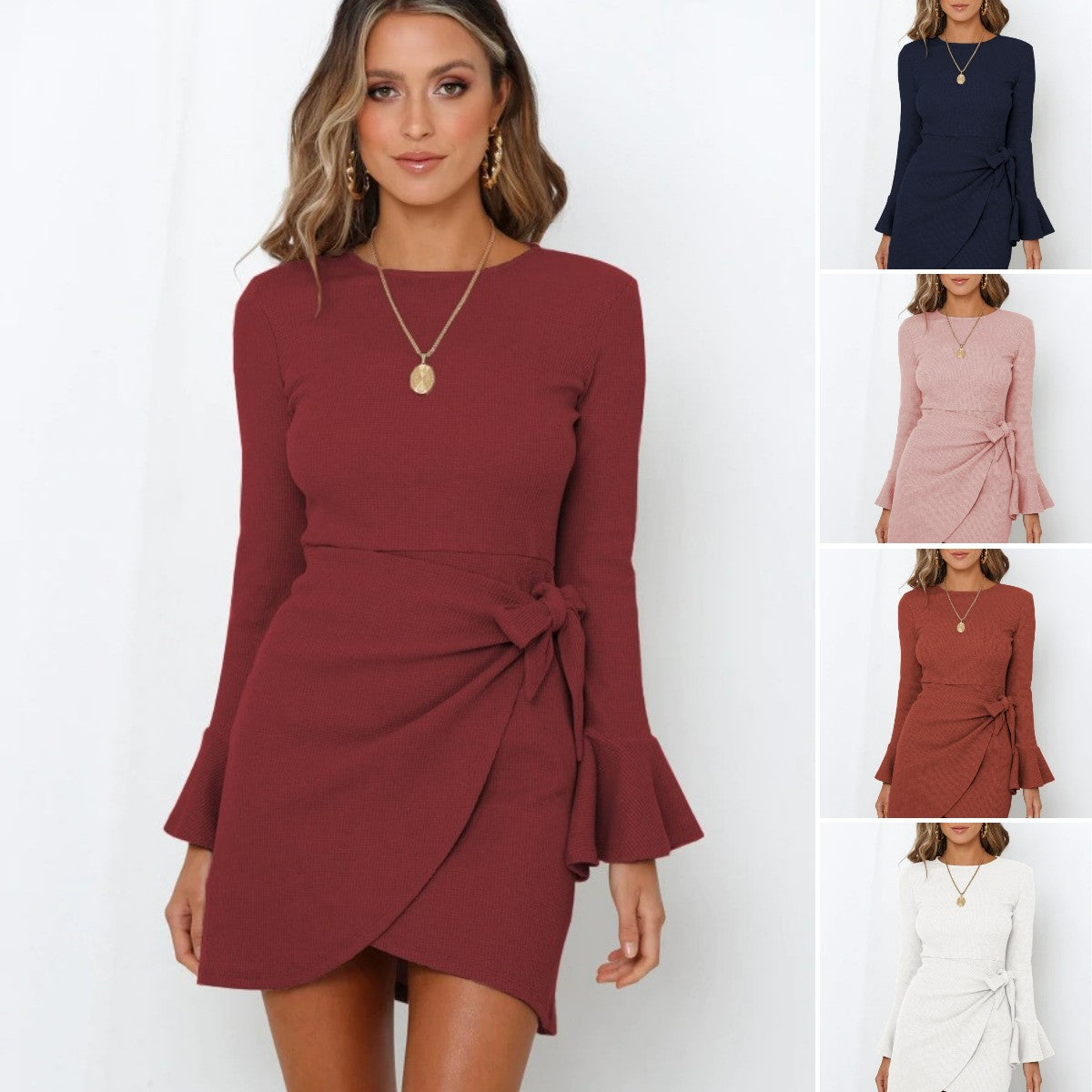 Ta elegancka sukienka z najwyższej półki, z małymi falbanami w kształcie trąbki, długimi rękawami i kokardą ozdobiona dopasowanym krojem, ukazuje niepowtarzalny kobiecy urok! 🌸👗