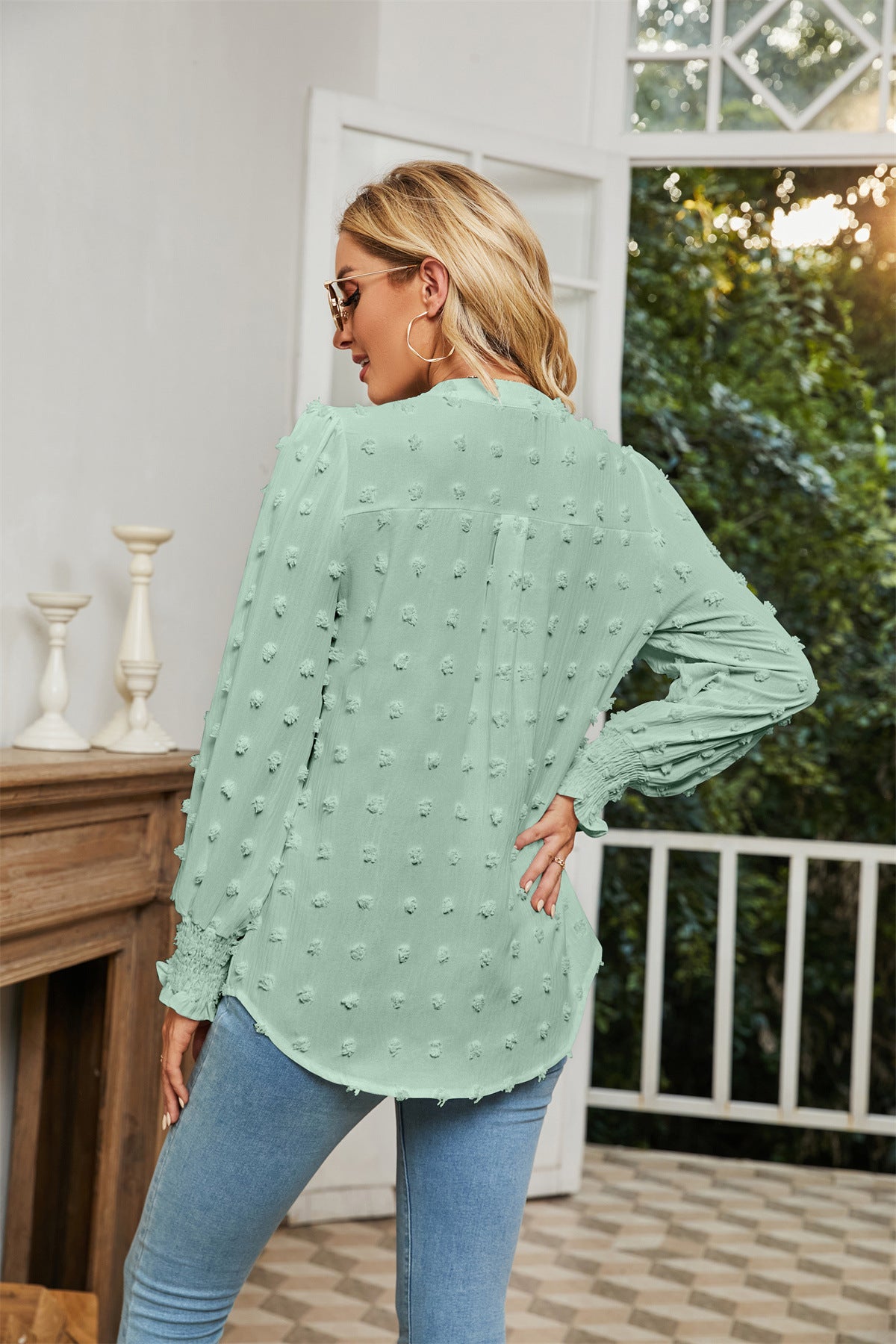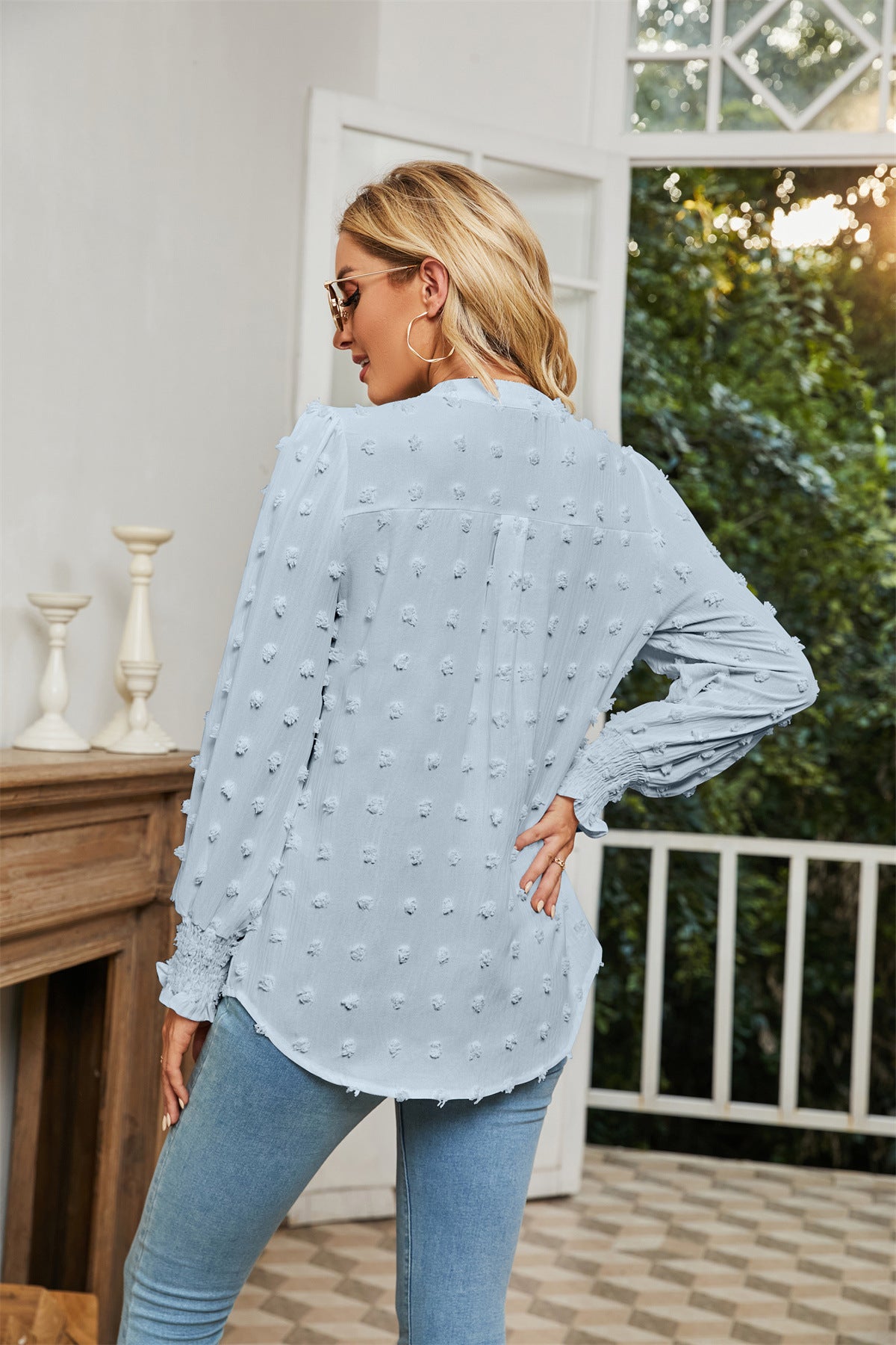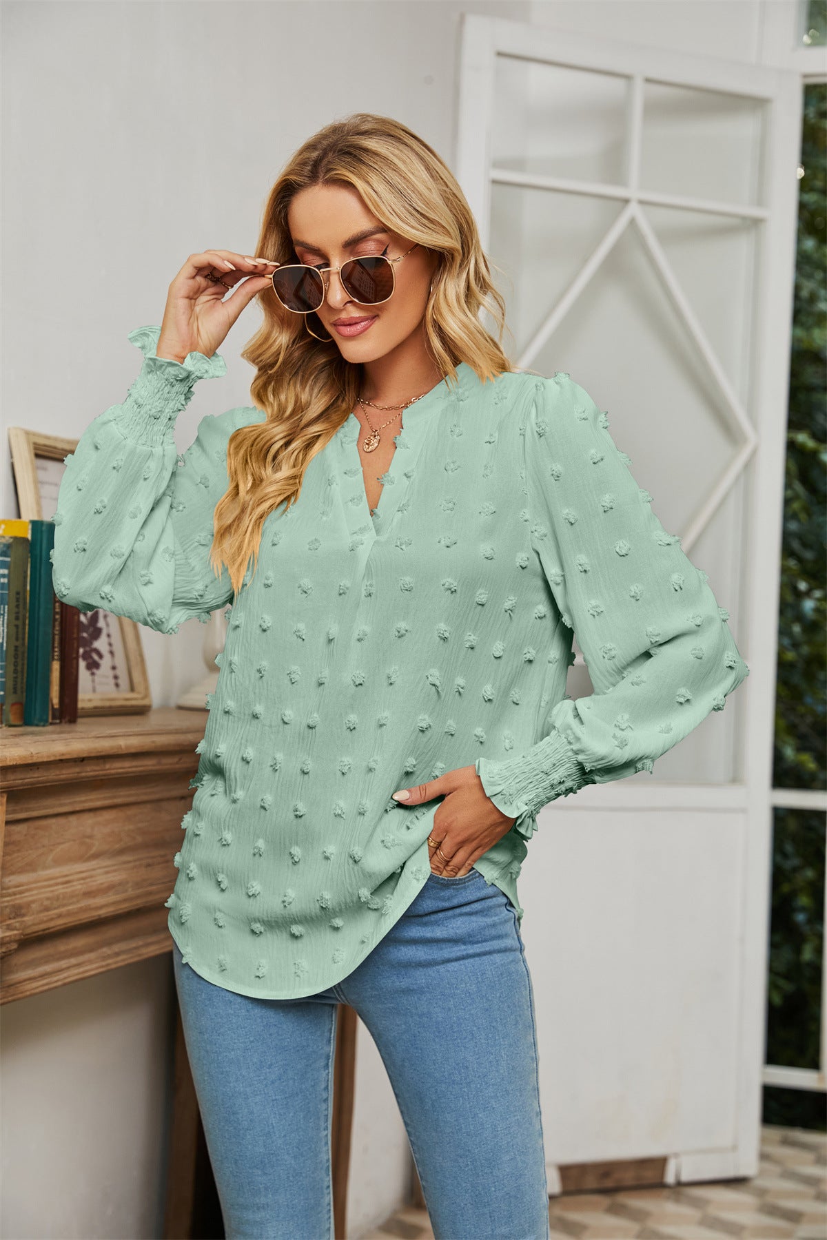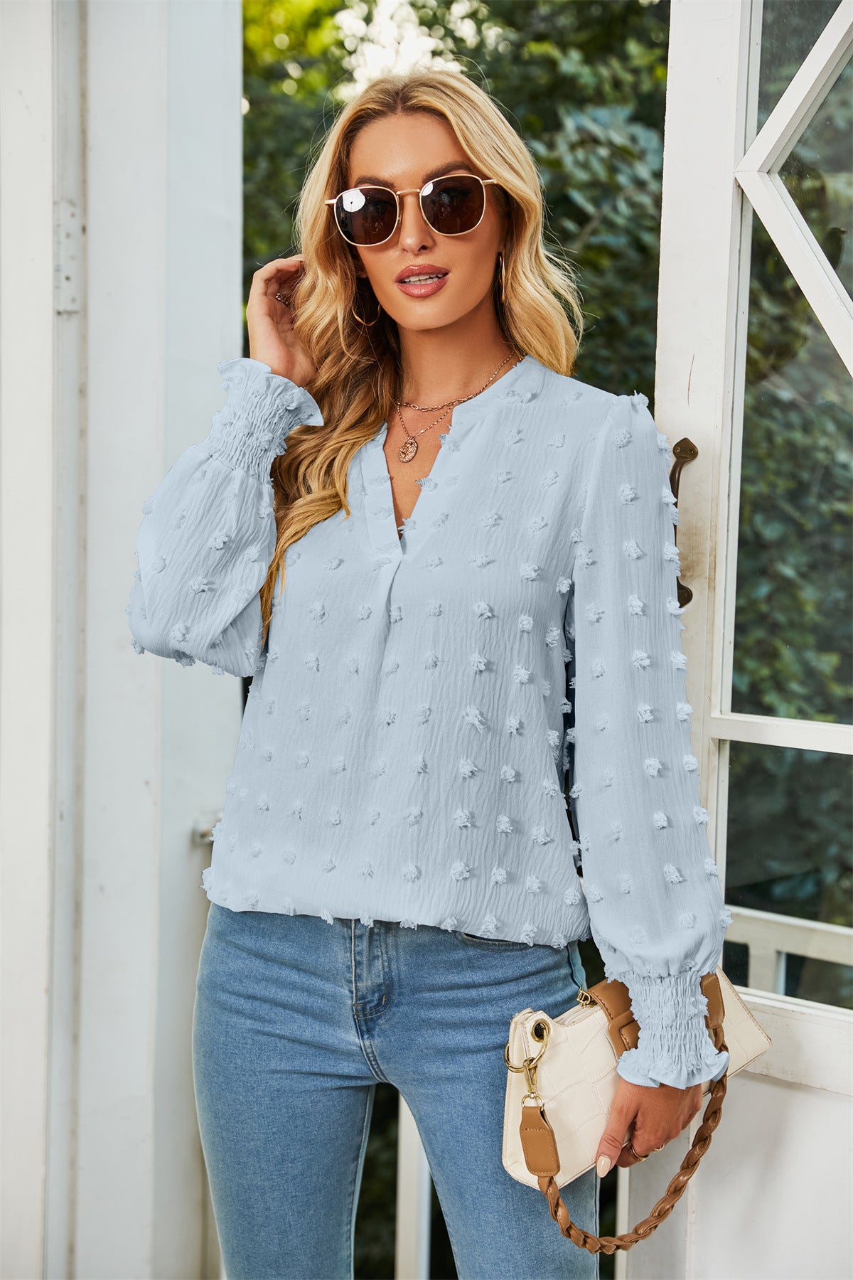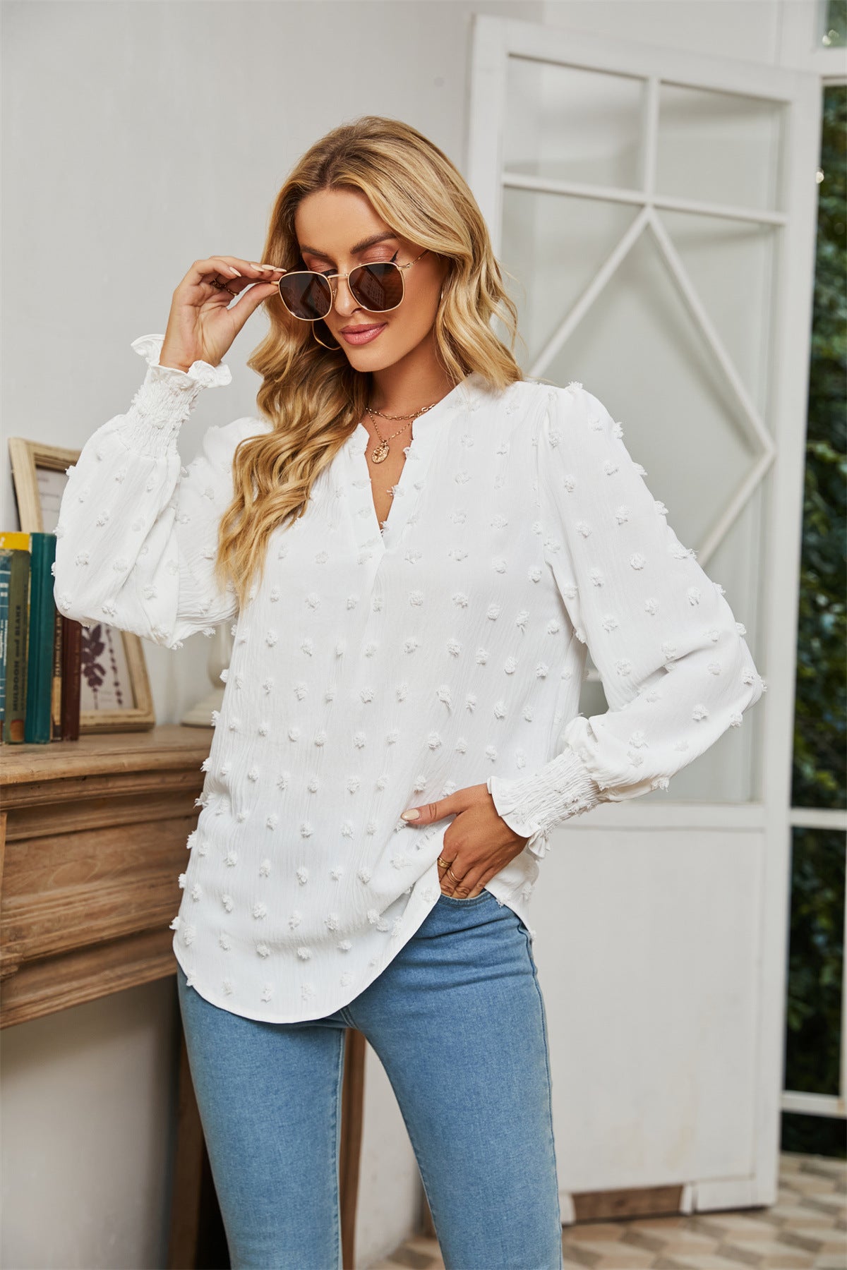👚 Ta koszula ma wyjątkowe bufiaste rękawy w kropki i elegancki dekolt w kształcie litery V, ukazujący urok łączenia słodyczy i modowego smaku, pozwalający odmłodzić się przy różnych okazjach! 💐✨