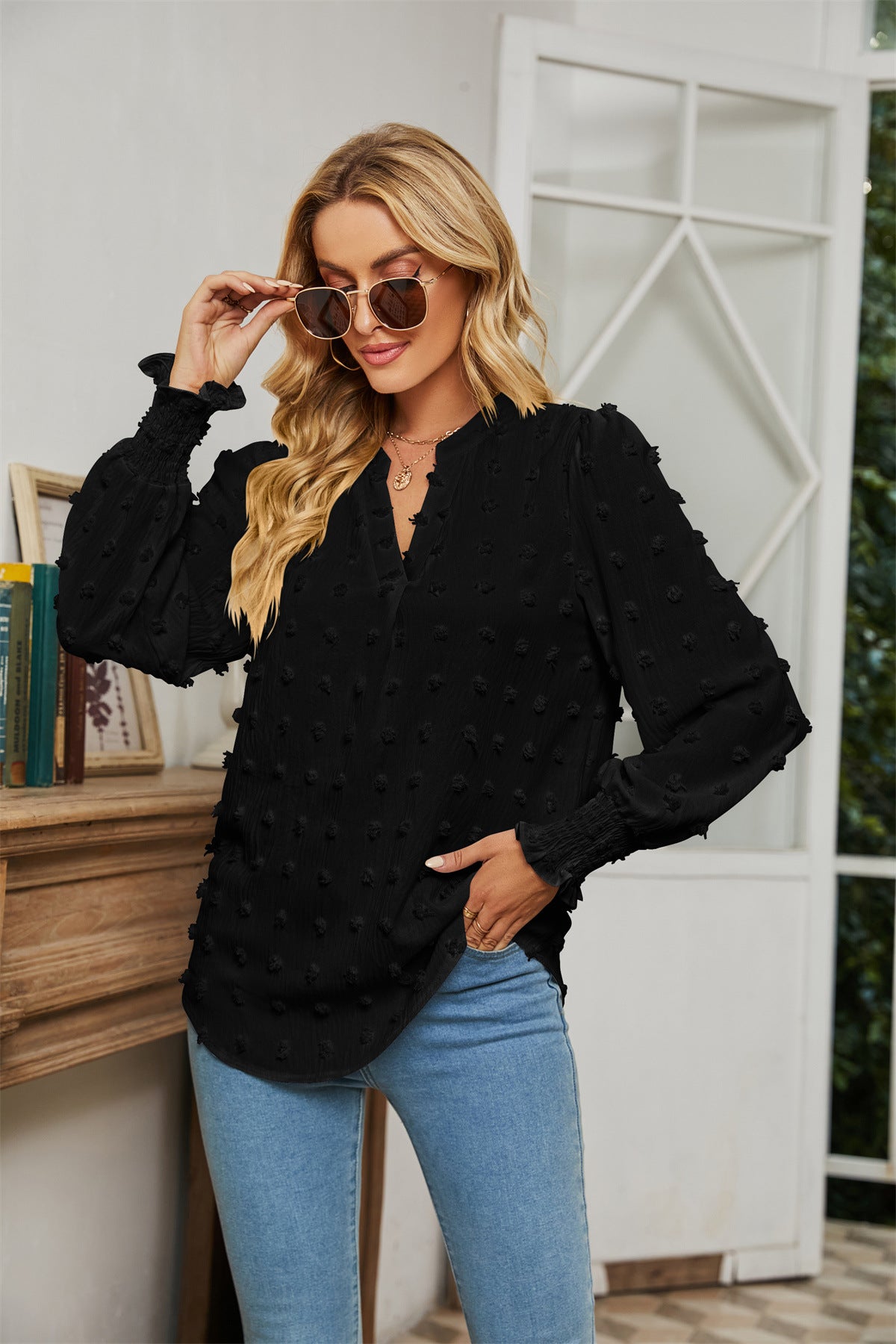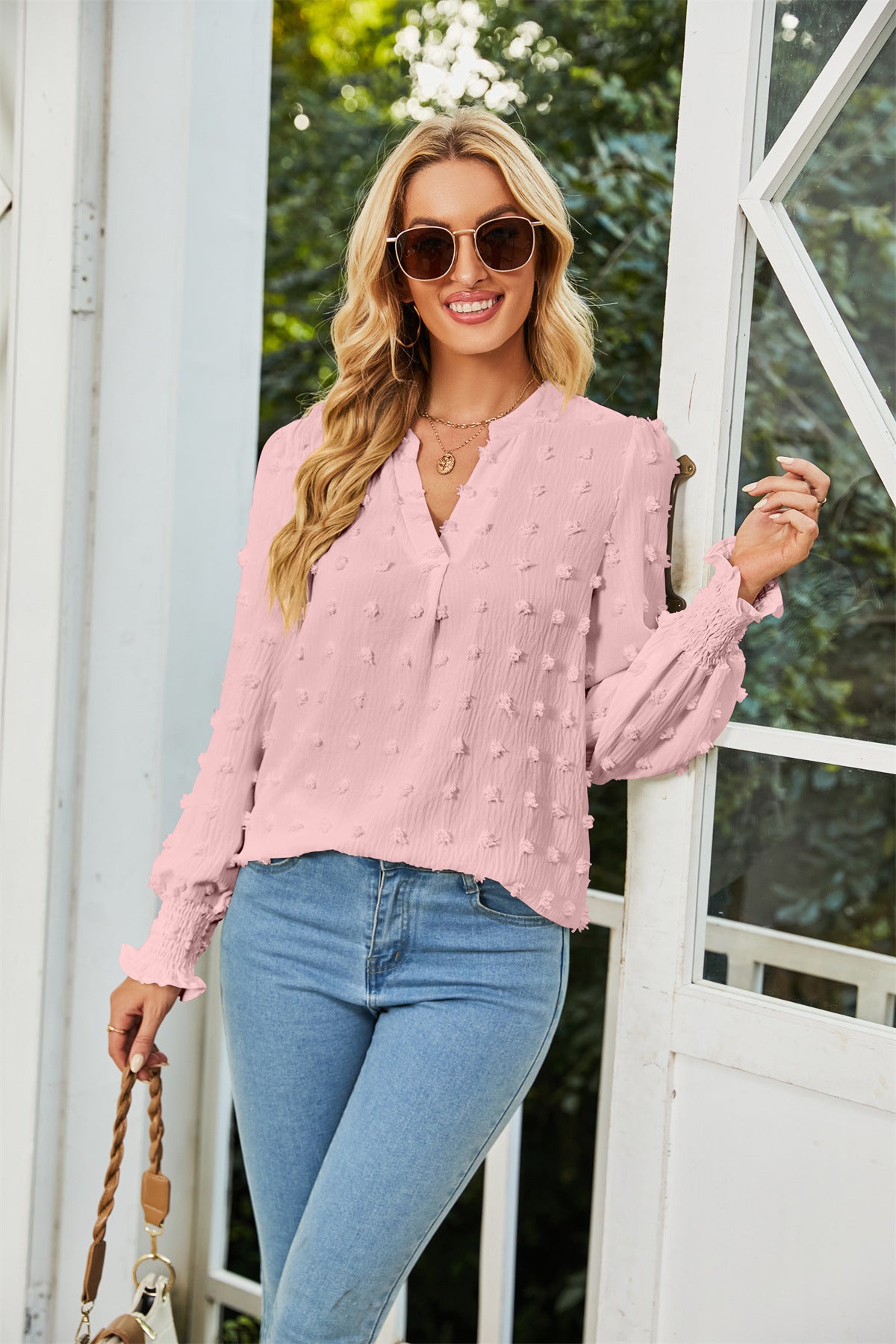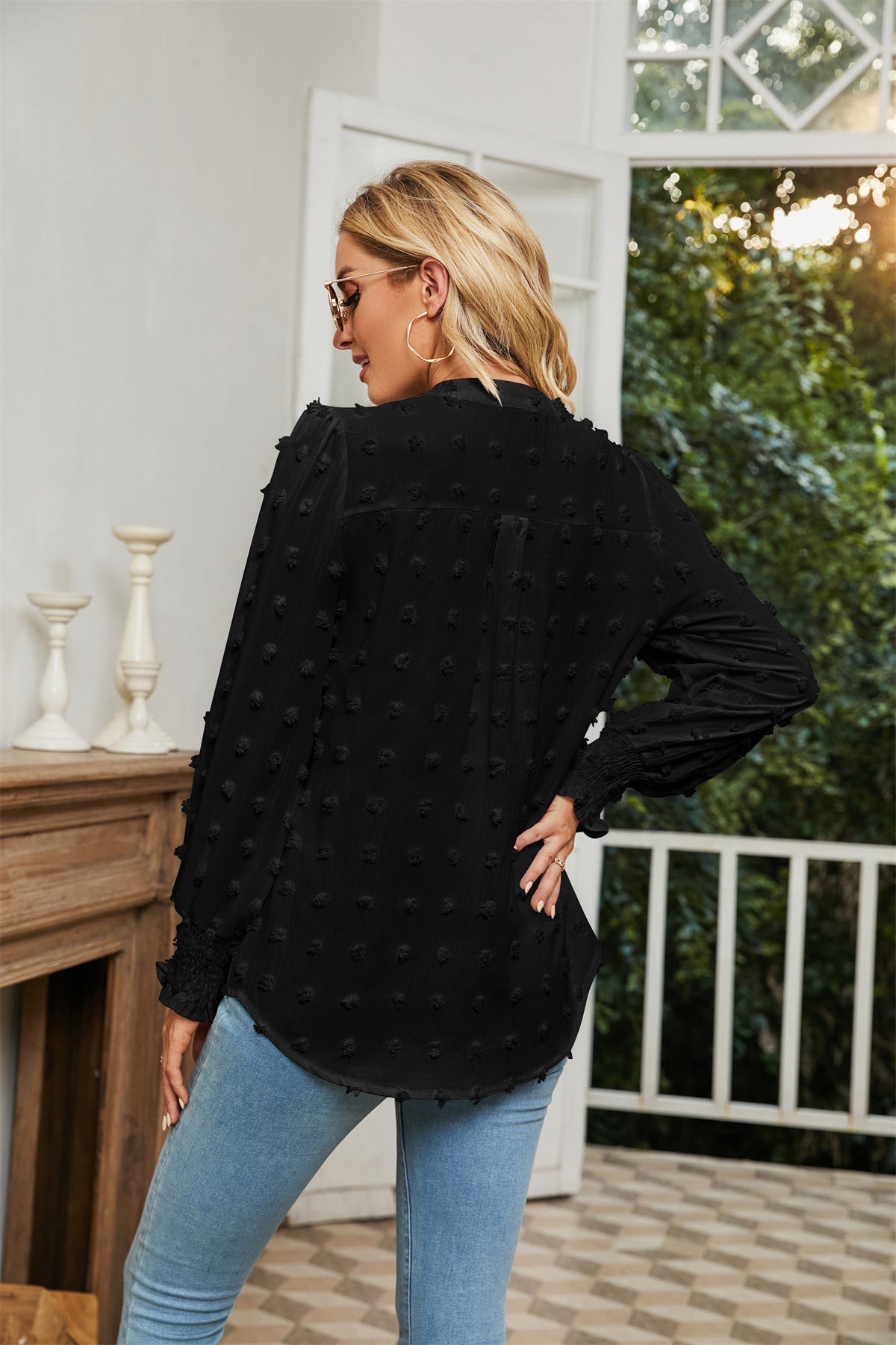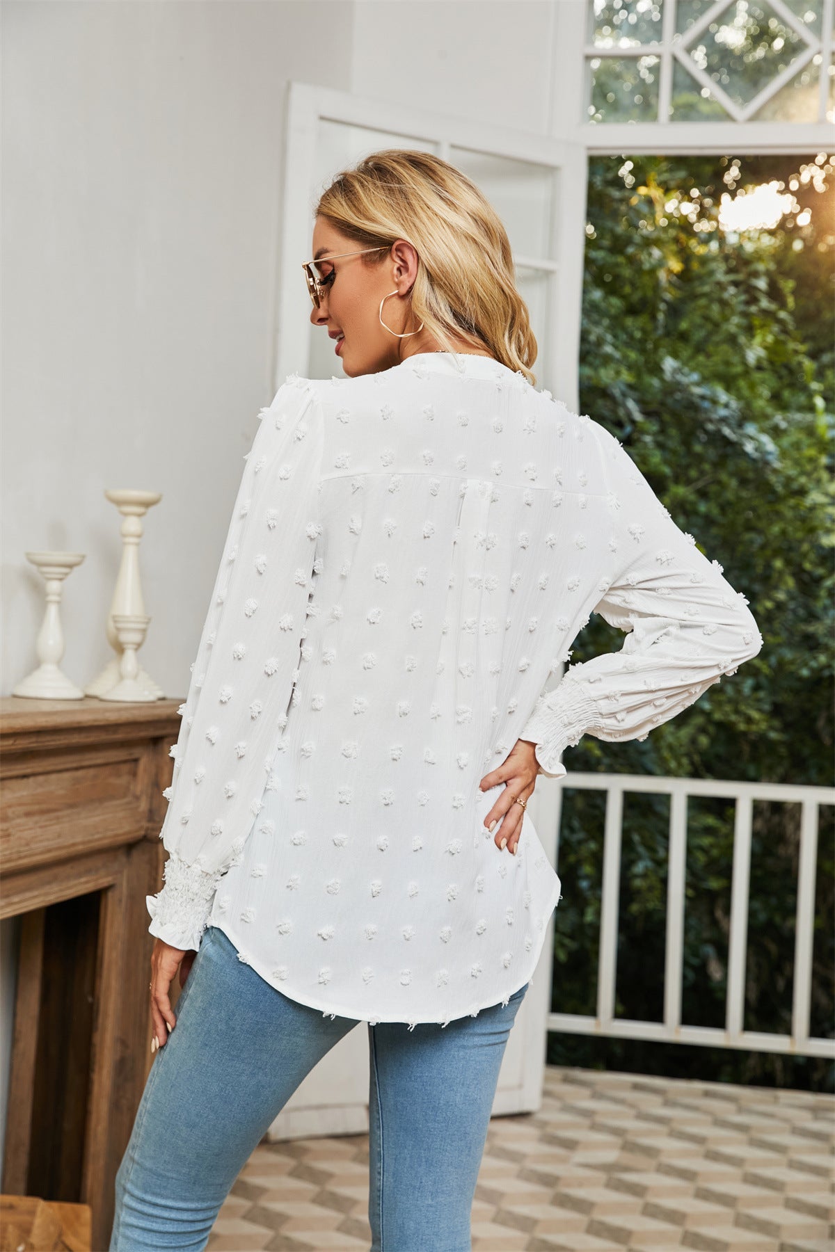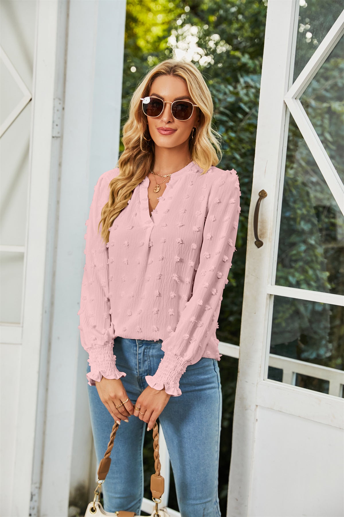 👚 Ta koszula ma wyjątkowe bufiaste rękawy w kropki i elegancki dekolt w kształcie litery V, ukazujący urok łączenia słodyczy i modowego smaku, pozwalający odmłodzić się przy różnych okazjach! 💐✨