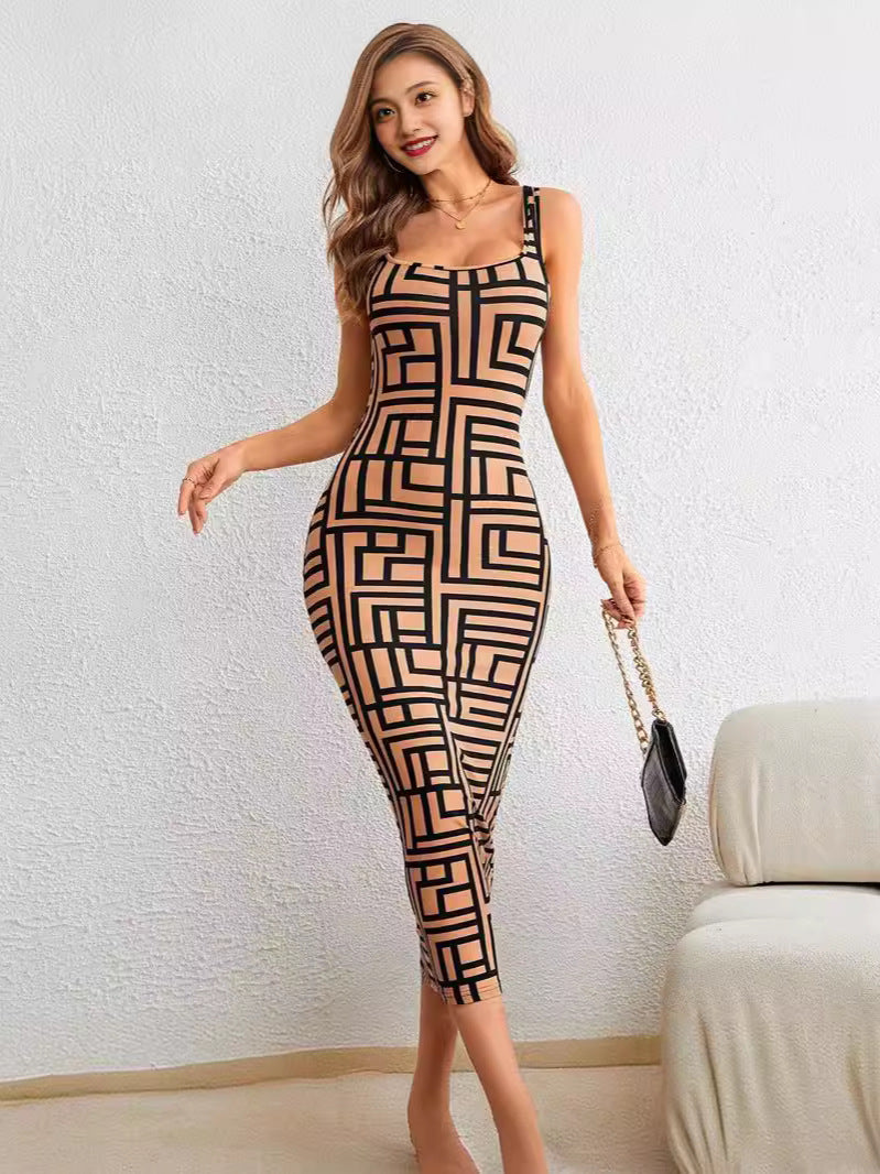 geo print tank dress elegant sleeveless bodycon dress for spring summer womens clothing details 1