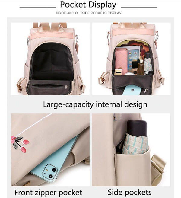 Posiada przednią kieszeń na zamek, kieszenie boczne, kieszenie wewnętrzne i dużą komorę wewnętrzną.