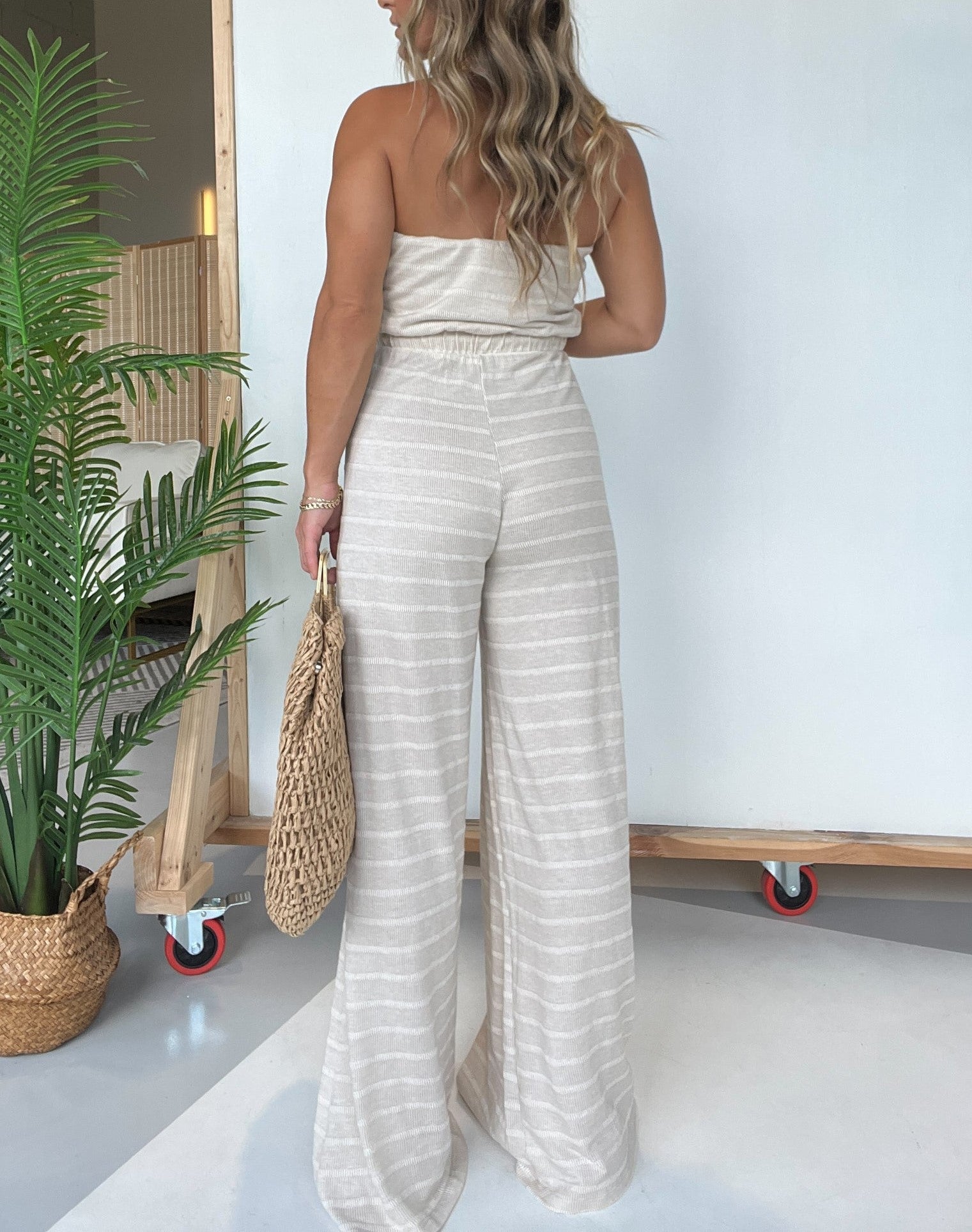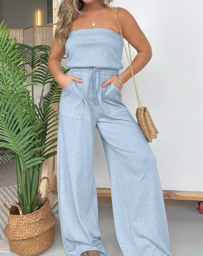 Bądź na czasie w tym sezonie z naszym nowym bez ramiączek, szerokim kombinezonem w paski! Szczególnie podoba nam się gładki materiał i myślimy, że ten element garderoby stanie się nowym ulubieńcem w Twojej szafie!