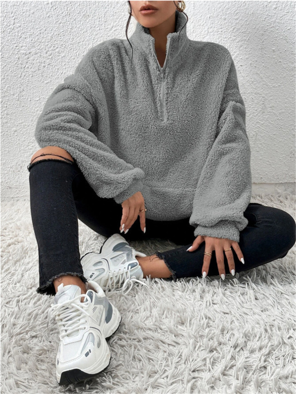 Kolor: morelowy, szary, czarny, pluszowa bluza ze stójką dostępna w magazynie