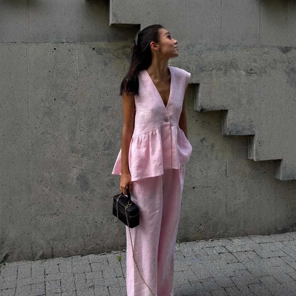 Ten stylowy dwuczęściowy zestaw składa się z topu bez rękawów z baskinką, głębokim dekoltem w serek i zapięciem na jeden guzik z przodu. Top ma luźny, zwiewny krój z marszczoną talią, co nadaje mu pochlebny i kobiecy charakter.