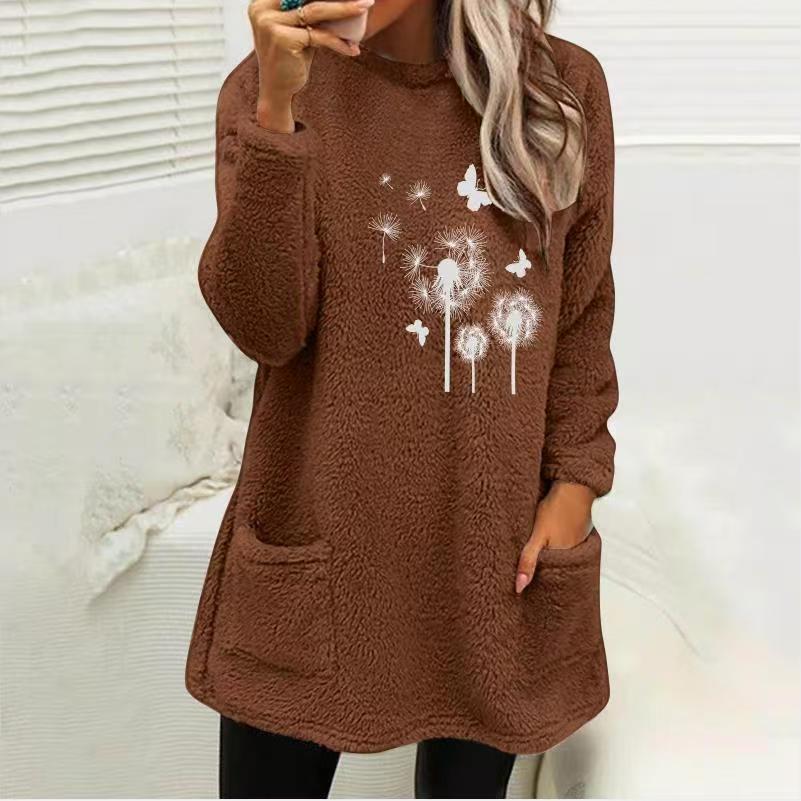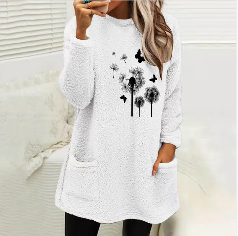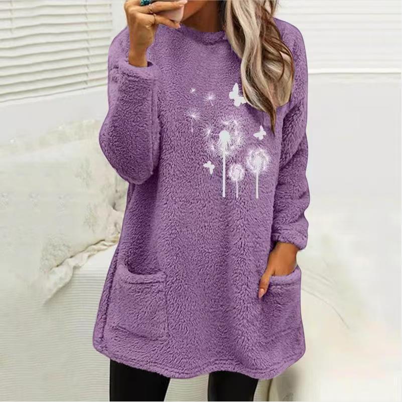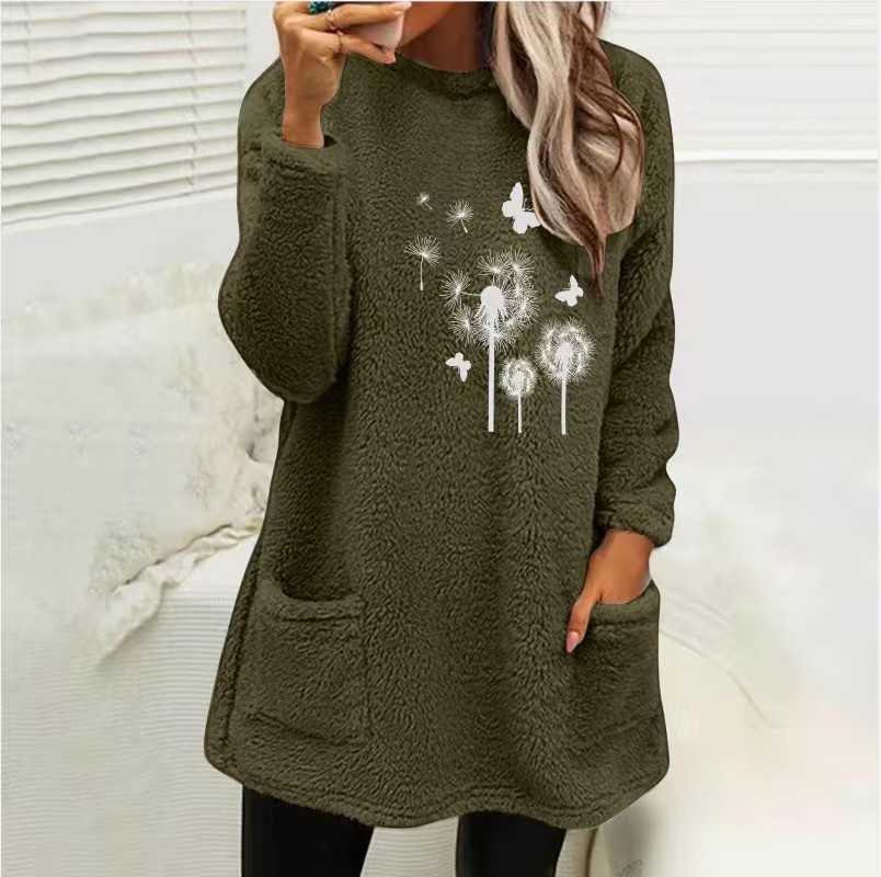 Damska bluza polarowa z okrągłym dekoltem, luźną kieszenią z długim rękawem i wytłoczonym mniszkiem