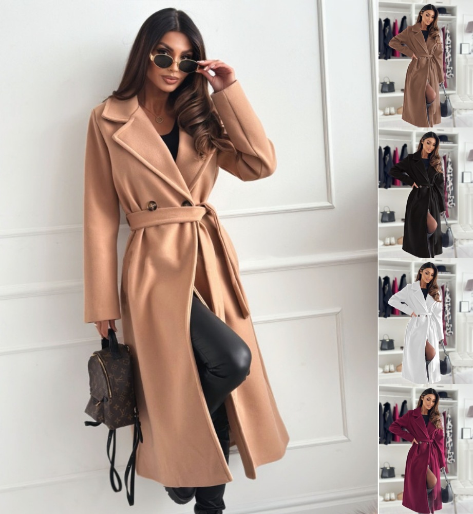 Prosty, jesienny i zimowy płaszcz wełniany w jednolitym kolorze z długimi rękawami i klapami