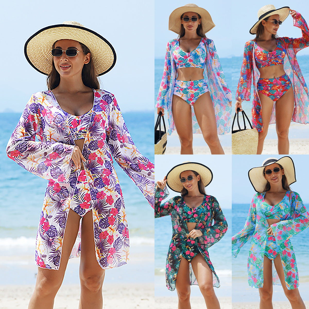 🌊🐚🌴Kwitnąca magia lata — trzyczęściowy damski siateczkowy kostium kąpielowy bikini