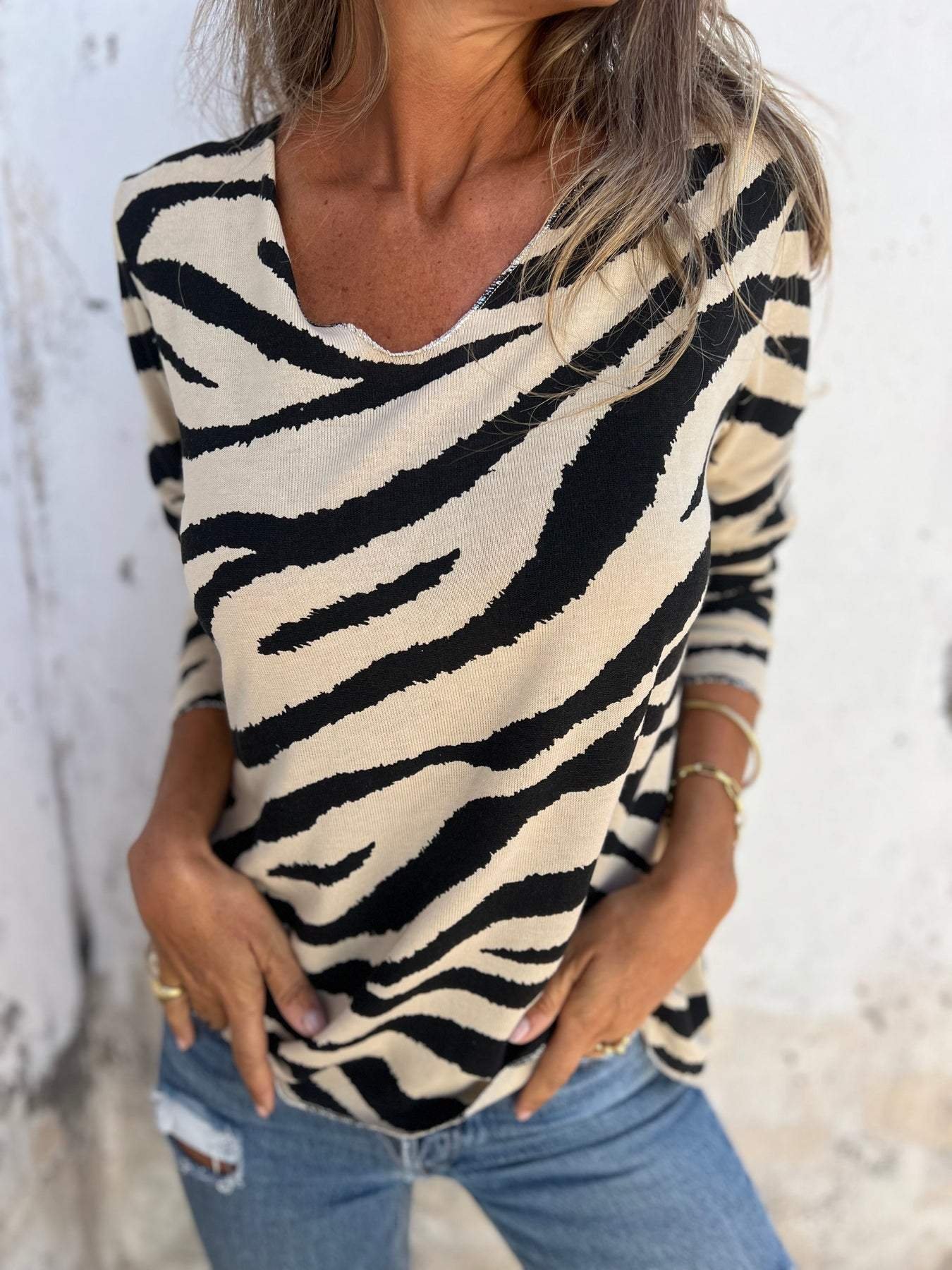 Dekolt w kształcie litery V podkreśla dekolt, a przyciągający wzrok nadruk zebry stanowi stylowy dodatek. Połącz ją z dżinsami lub legginsami, aby uzyskać elegancki, swobodny wygląd, który się wyróżnia.