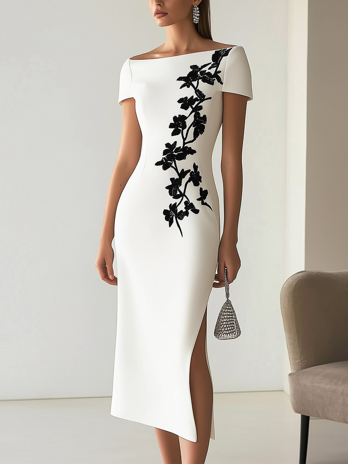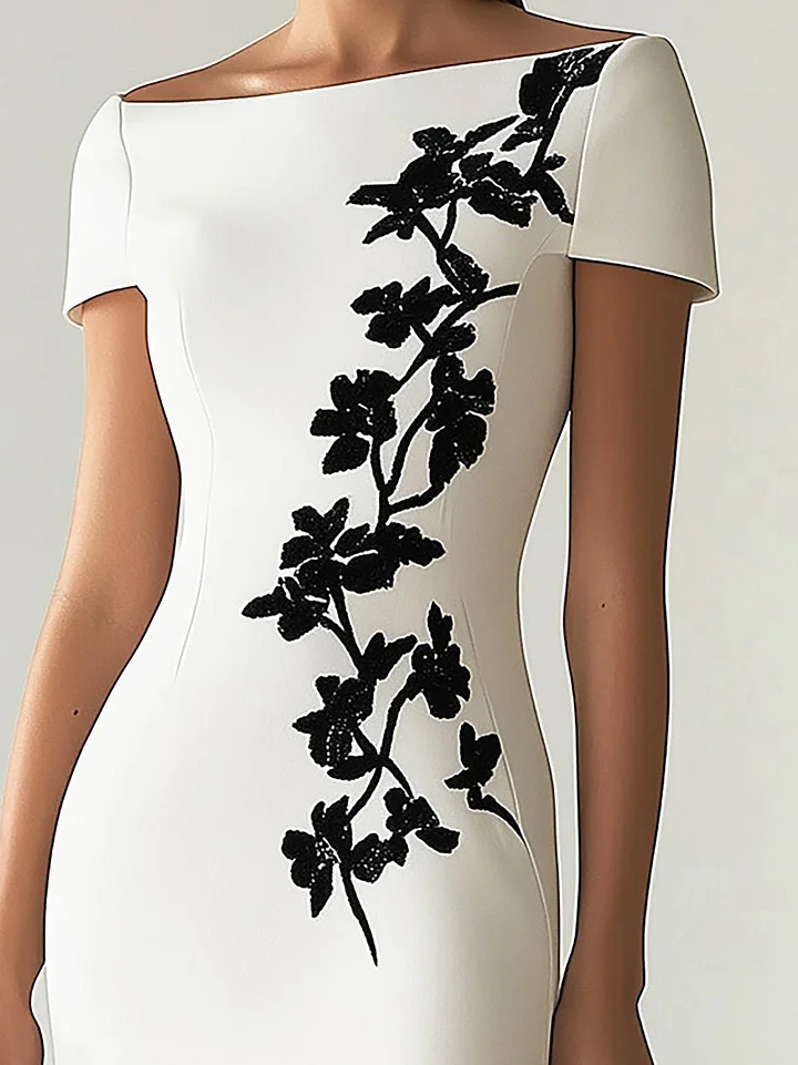 - Projekt: ma wyrafinowany dekolt łodzi i uderzający asymetryczny kwiatowy nadruk, który przyciąga oko, nadając sukience nowoczesny, ale artystyczny talent