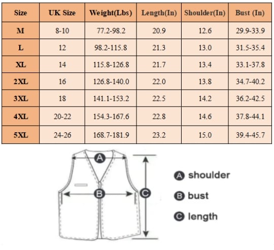 Notatka: Jeśli nie masz pewności co do rozmiaru biustu lub innych wymiarów, możesz zapoznać się z naszą zalecaną wagą, aby wybrać odpowiednią kamizelkę.