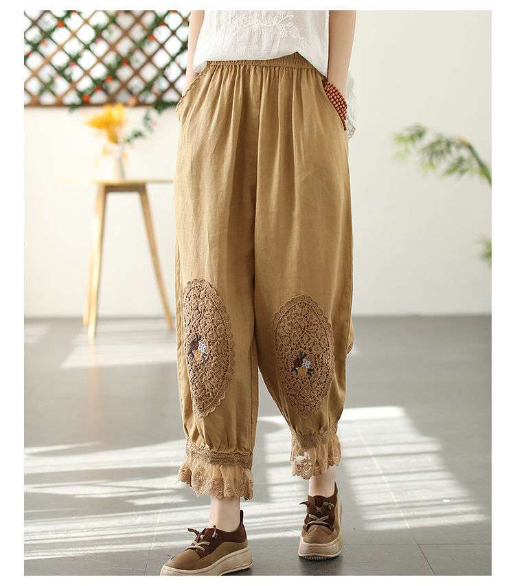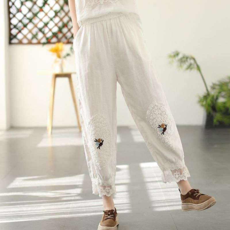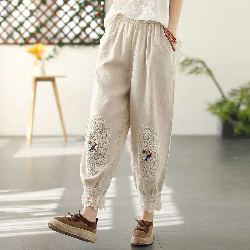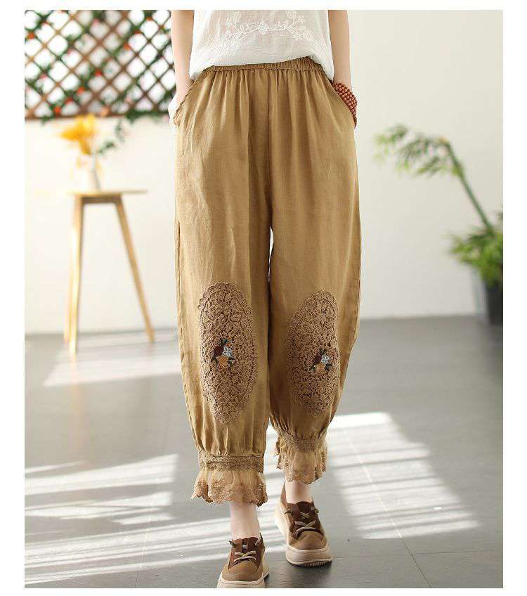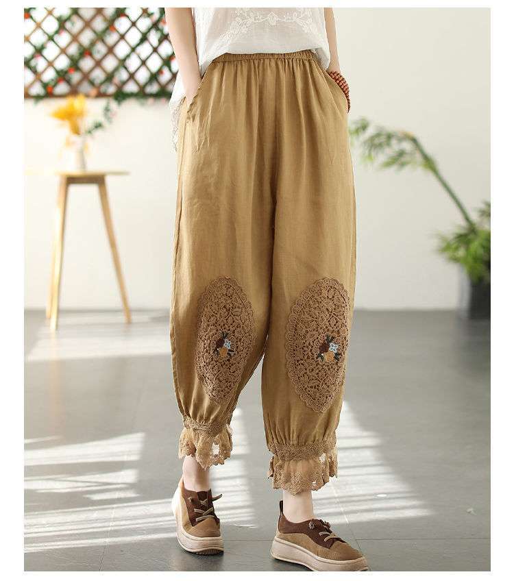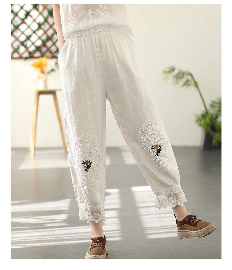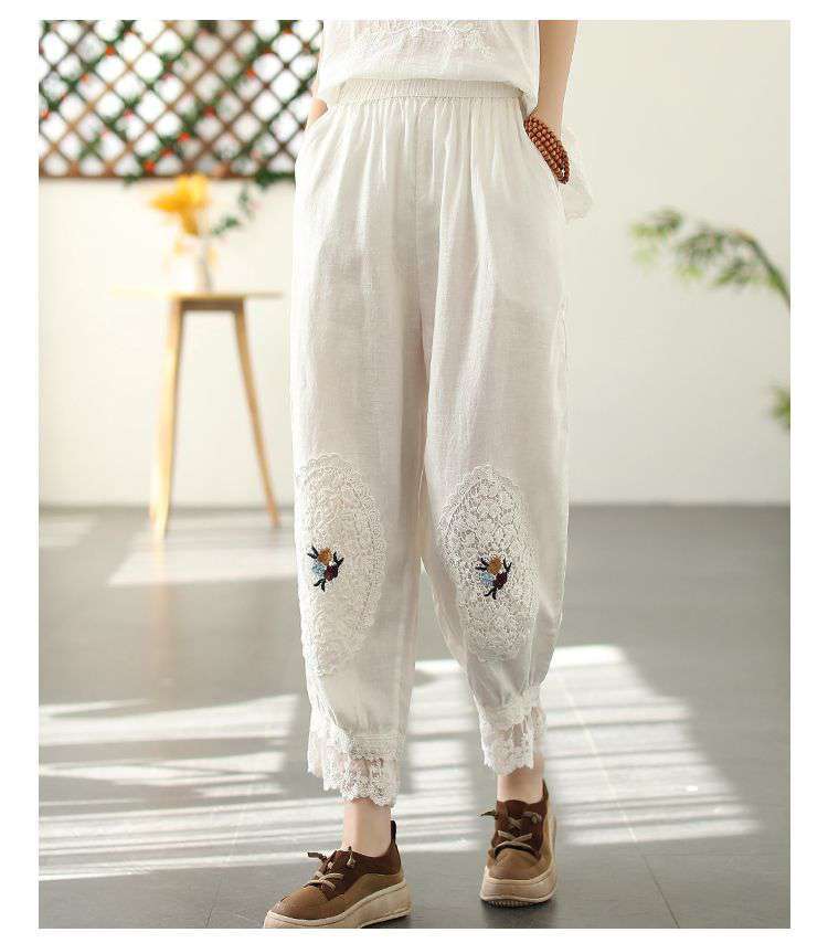 Te damskie koronkowe haftowane lniane bawełniane spodnie zwracają uwagę na szczegóły. Wykwintne hafty na kolanach spodni, koronkowe obszycia nogawek i boczne kieszenie sprawiają, że są one bardziej stylowe i wygodne. Idealne na każdą okazję, to obowiązkowy element garderoby.