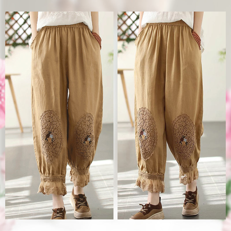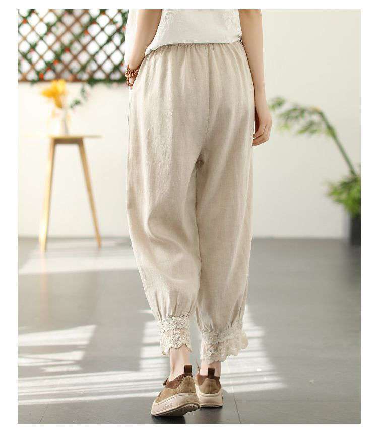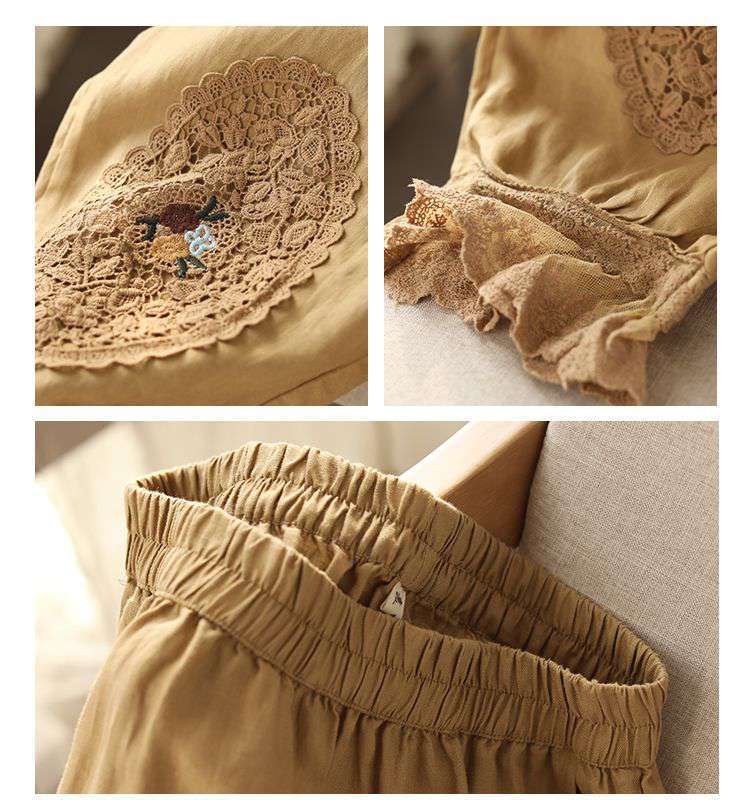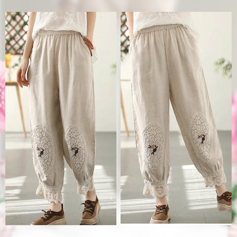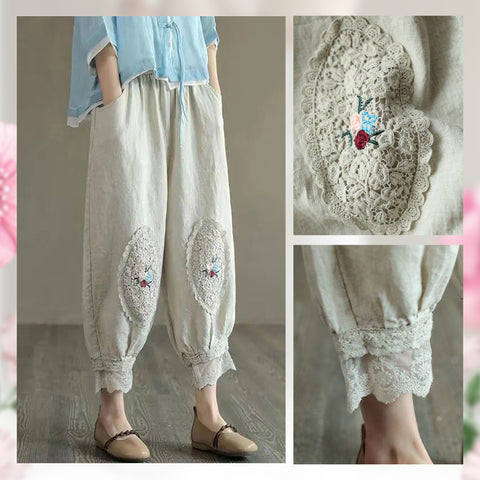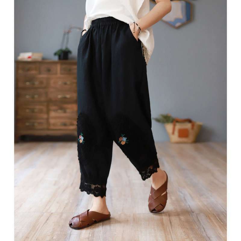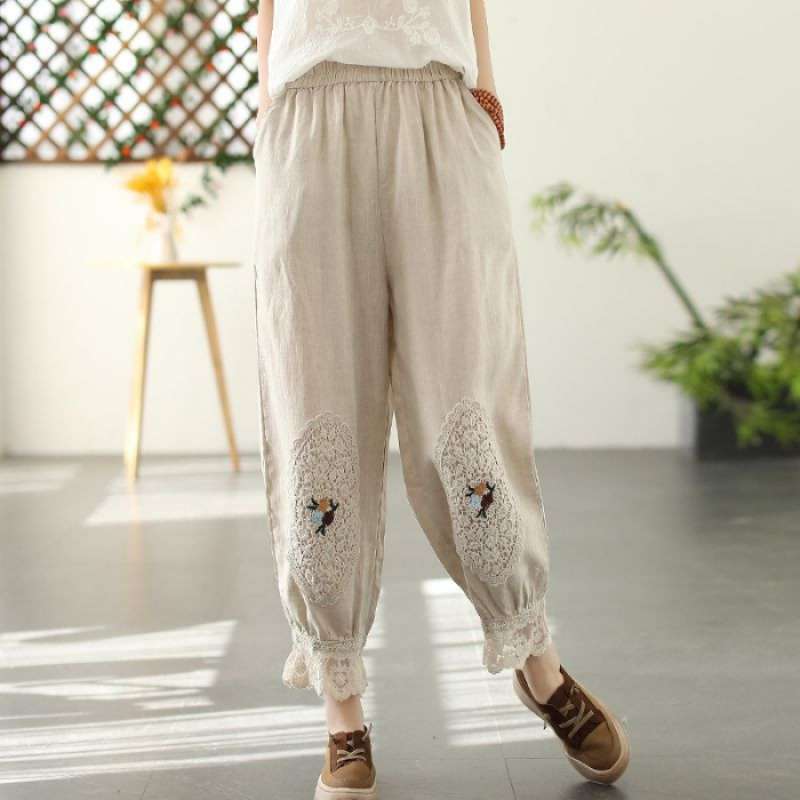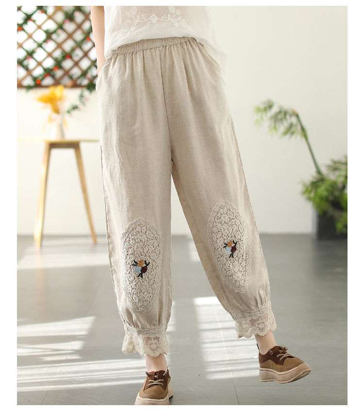 Te damskie koronkowe haftowane lniane bawełniane spodnie zwracają uwagę na szczegóły. Wykwintne hafty na kolanach spodni, koronkowe obszycia nogawek i boczne kieszenie sprawiają, że są one bardziej stylowe i wygodne. Idealne na każdą okazję, to obowiązkowy element garderoby.