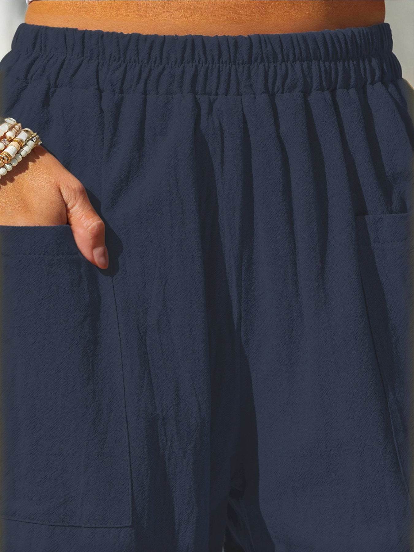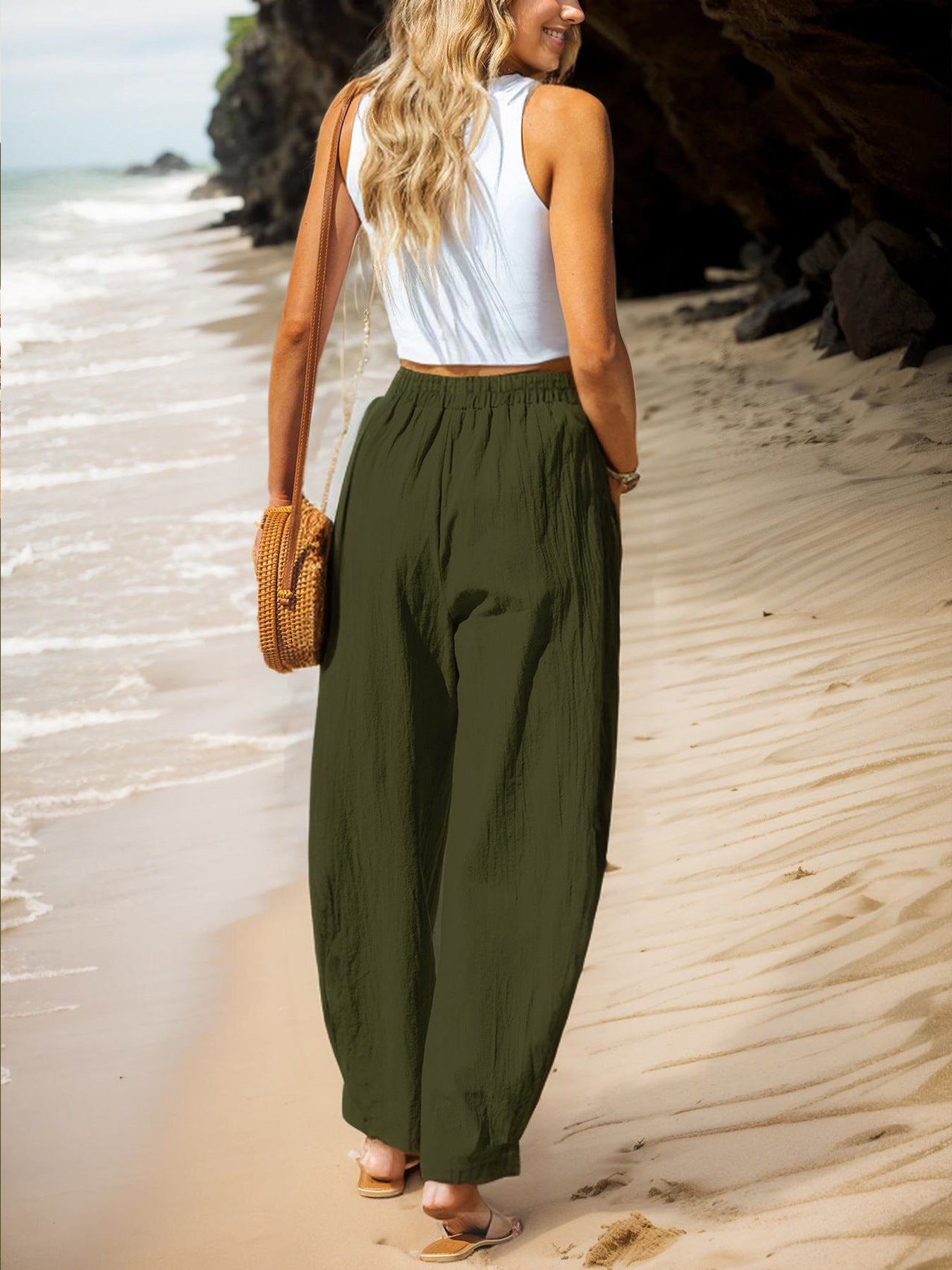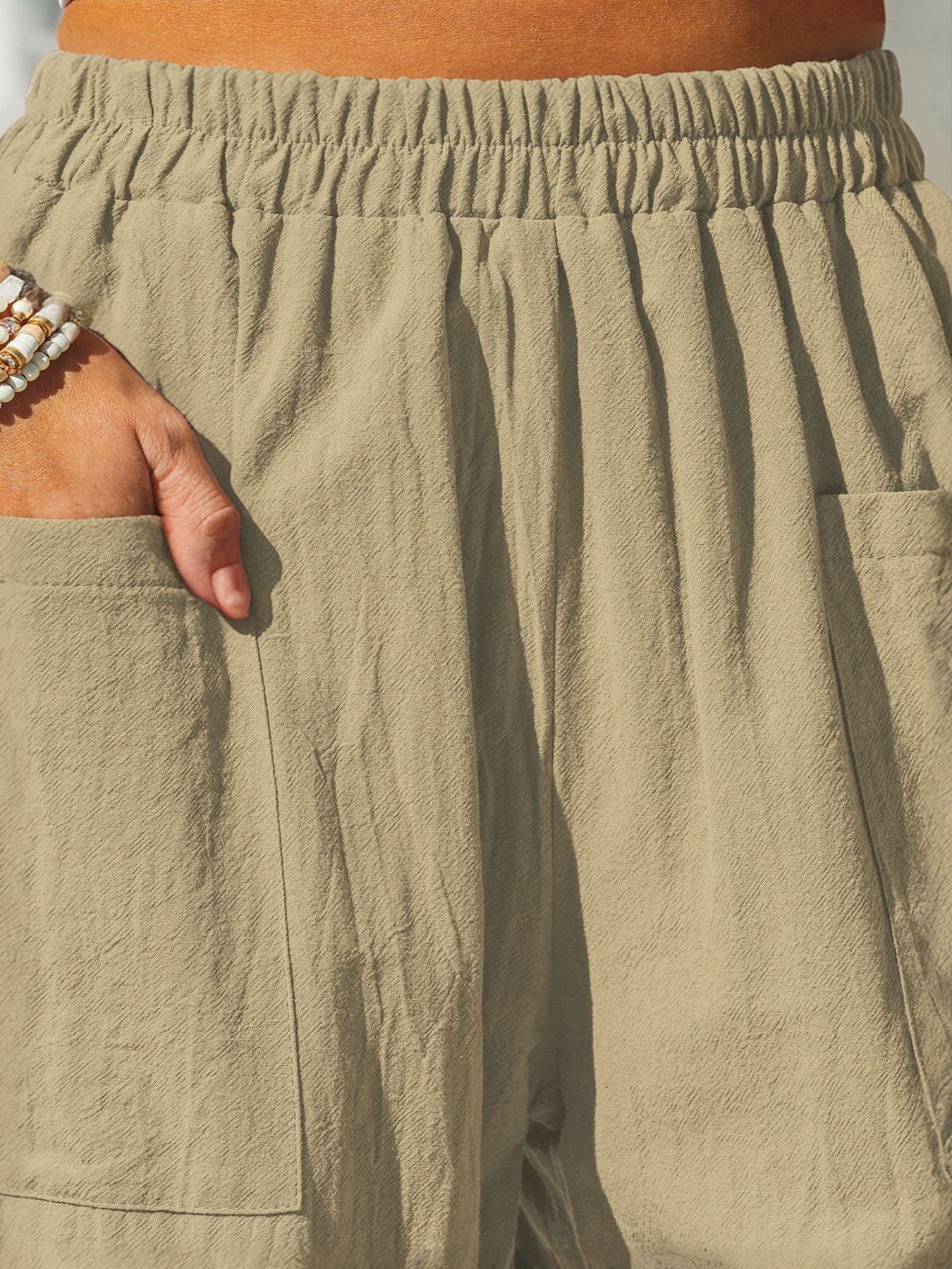 Wygodne tkaniny bawełniane i lniane, ukazujące luźną, wakacyjną stylizację.