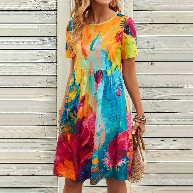 Materiał: Mieszanka Bawełny I Poliestru Długość Rękawów: Krótki Rękaw Długość Sukienki: Długość Do Kolan Dekolt: Dekolt Okrągły Wzór: Nadruk Sezon: Wiosna, Lato