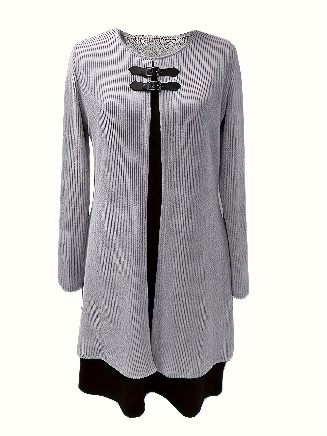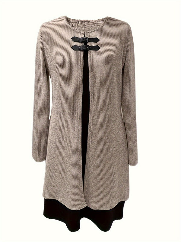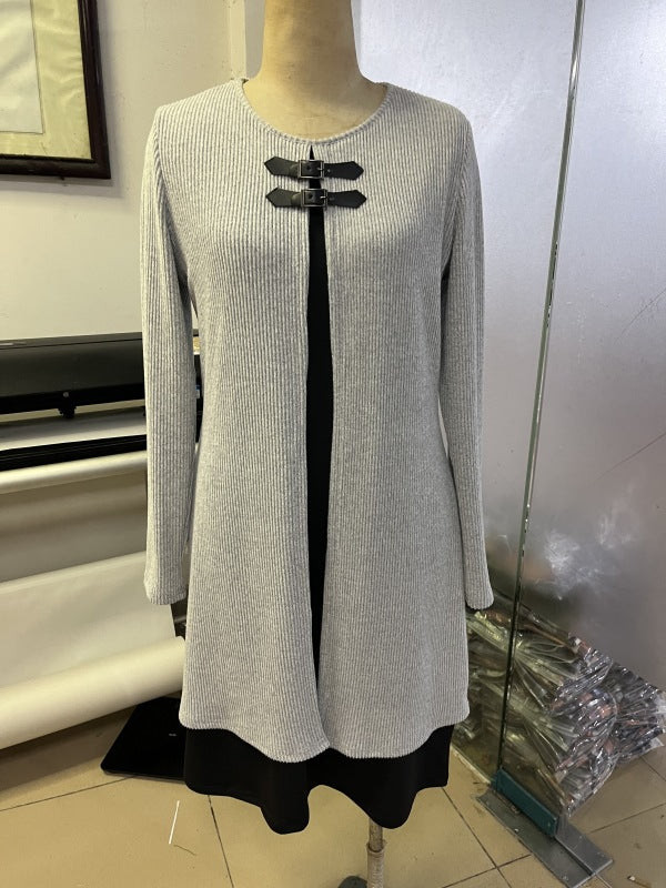 Fałszywy dwuczęściowy projekt łączy w sobie elementy swetra i sukienki, co jest jednocześnie ciepłe i modne, zapewniając warstwowy i modny wygląd.