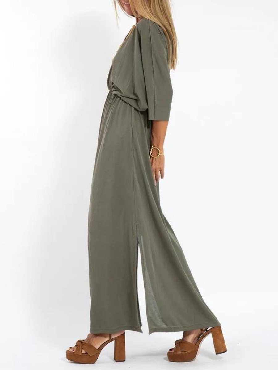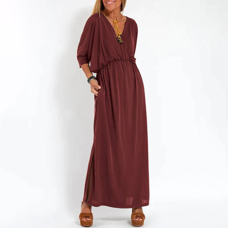 Wyróżnij się dzięki naszej sukience maxi z wysokim stanem i dekoltem w serek w jednolitym kolorze, która będzie ponadczasowym dodatkiem do Twojej garderoby.