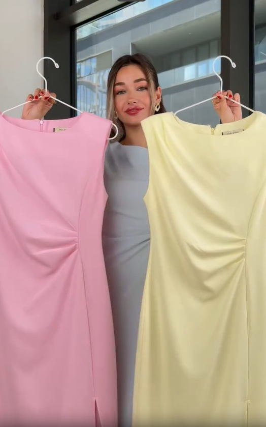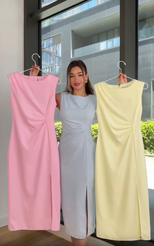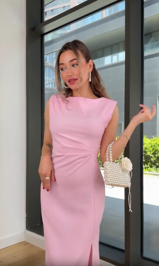 Ta sukienka bez rękawów jest wykonana z wysokiej jakości matowej satyny, z gładkim wzorem w kształcie litery H, który pomieści różne rodzaje ciała. Wewnętrzne cięcie w talii ukrywa mechanizm odchudzający. Podzielona konstrukcja pozwala na pojawienie się subtelnych linii nóg podczas chodzenia, a po sparowaniu z cienkim metalowym pasem, natychmiast podnosi ogólny wygląd.