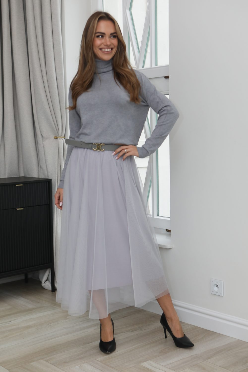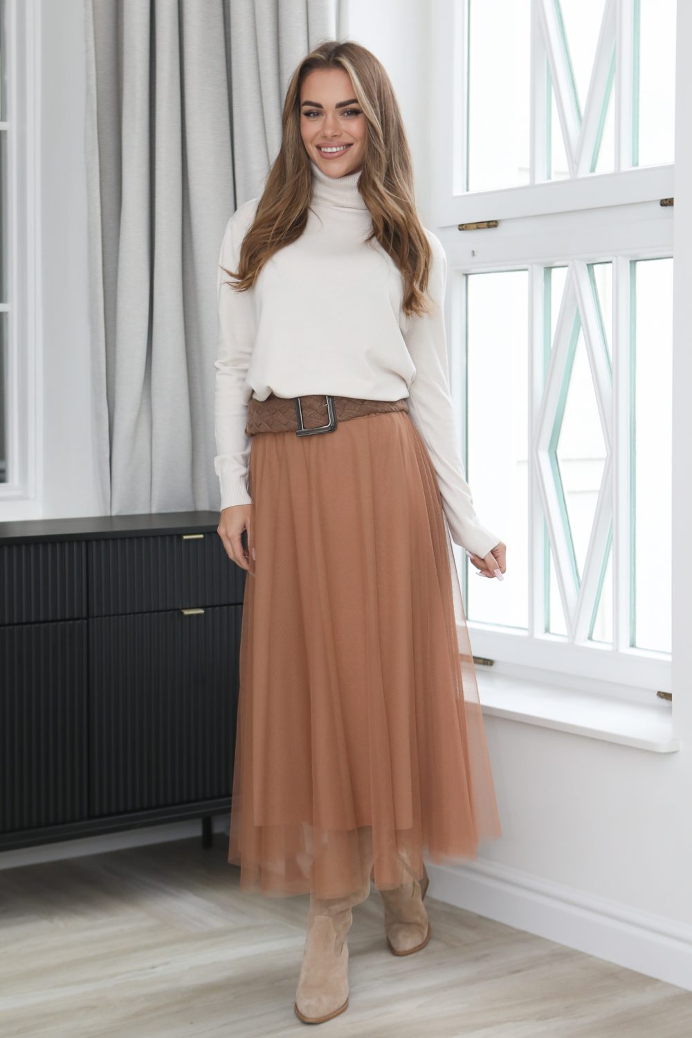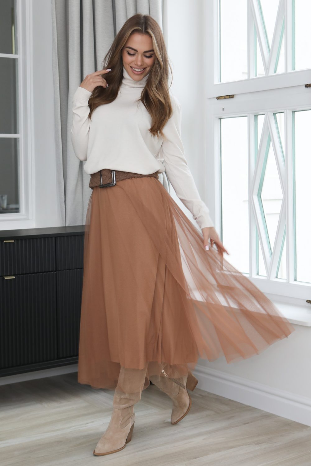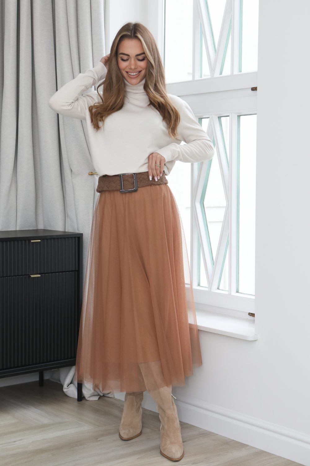 Tiulowa spódnica midi z szeroką gumką w pasie zapewniającą wygodę noszenia. Wykonana jest z miękkiego tiulu, dzięki czemu poczujesz się bardzo komfortowo, przytulnie i kobieco. Będzie pasować do wielu stylizacji, zarówno ze szpilkami, jak i ciężkimi butami – model spódnicy będzie odpowiedni na każdą porę roku. Zarówno na wielką noc, jak i na spacer po parku.