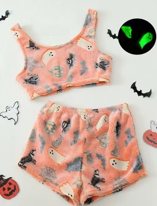 Idealny na świąteczne noce, ten przytulny zestaw piżamy ma zabawny wzór z motywem Halloween, który świeci w ciemności.
