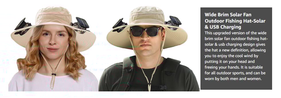 Ten ulepszony, szeroki kapelusz przeciwsłoneczny do użytku na zewnątrz z wentylatorem solarnym jest przeznaczony do noszenia na głowie, pozostawiając wolne ręce. Wbudowany mini wentylator z przodu ronda, chłodzący twarz.