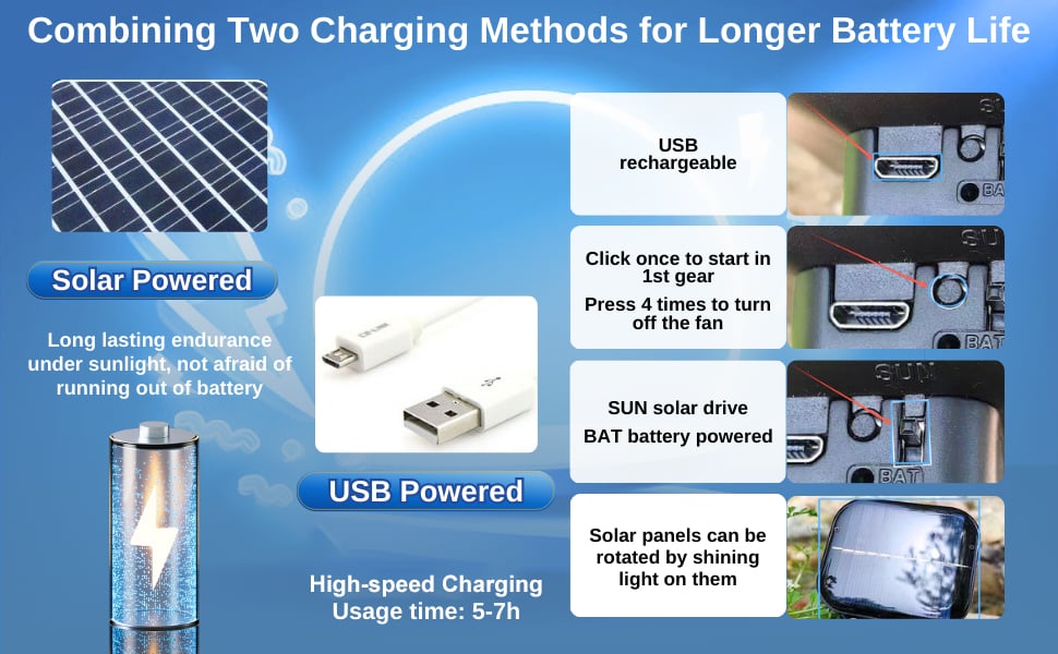 Ten kapelusz wentylatora ma dwa tryby zasilania, zasilanie słoneczne lub ładowanie przez USB,