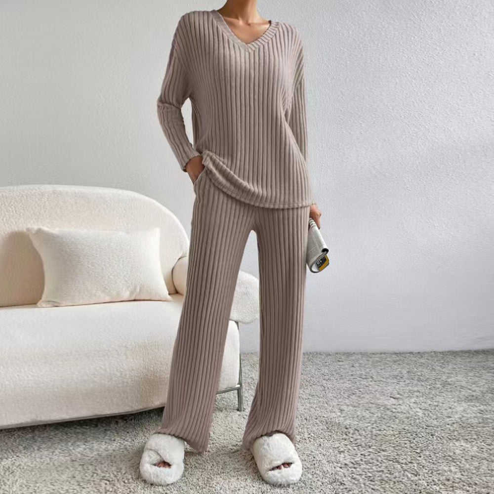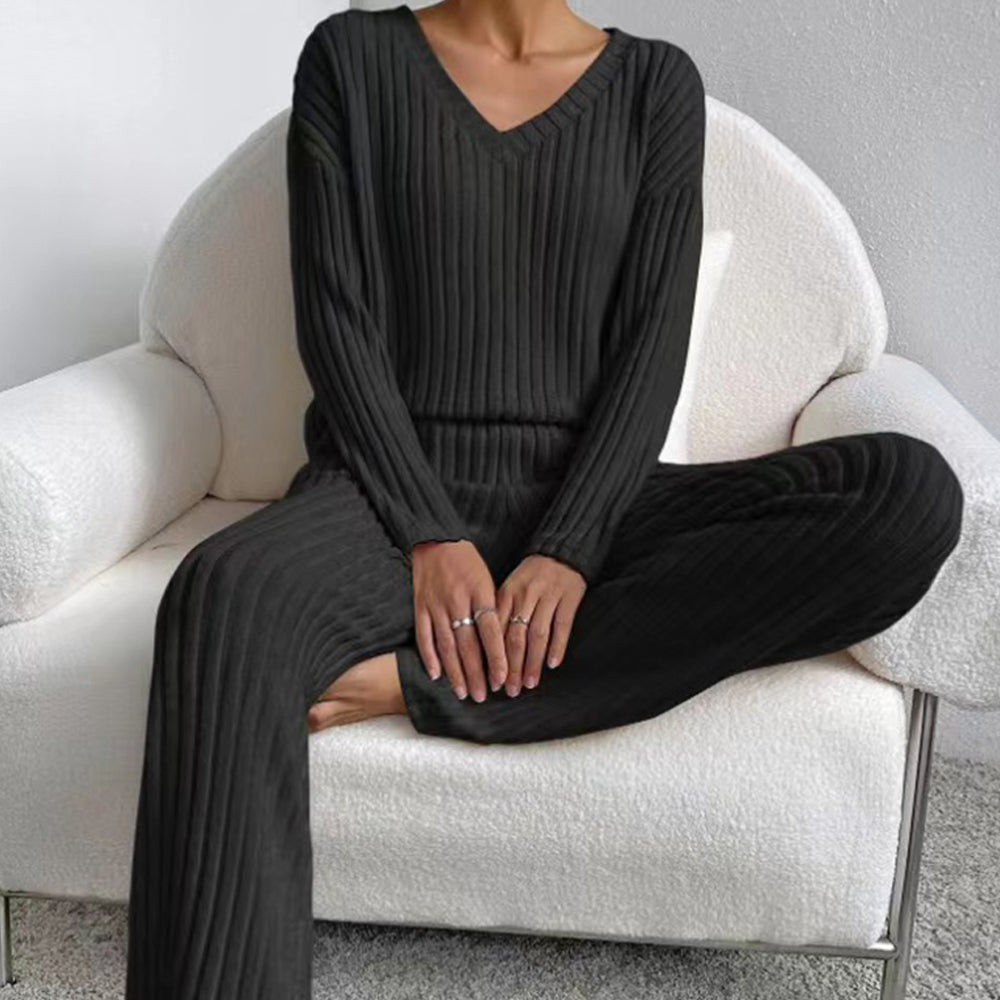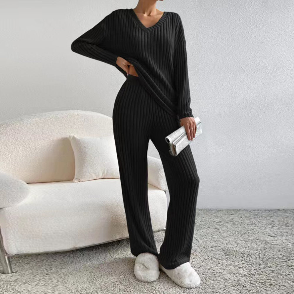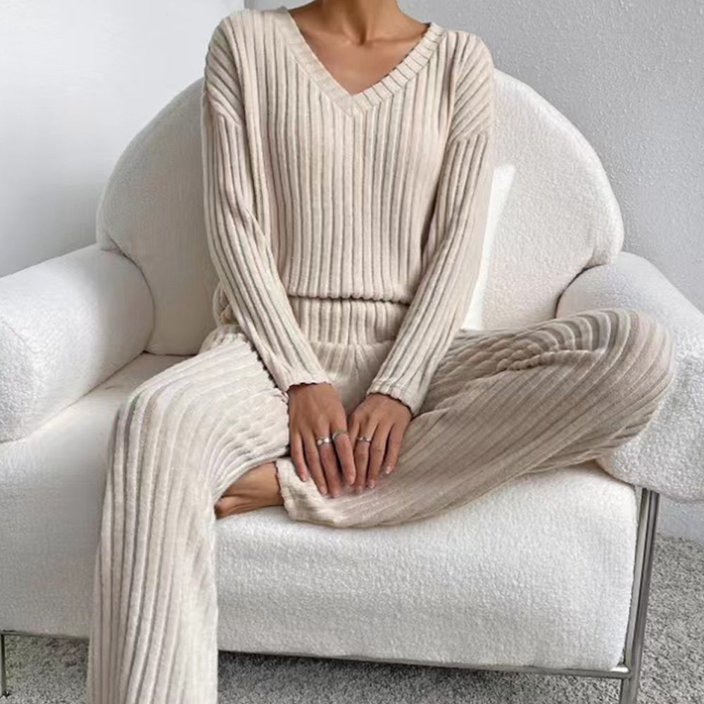 Ten damski garnitur z długim rękawem i spodniami, z dekoltem w kształcie litery V, z dzianiny to idealny wybór dla Ciebie, fashionistki! Nie tylko podkreśla Twój osobisty styl, ale także zapewnia wygodne dopasowanie, dzięki czemu możesz błyszczeć pewnie w każdej okazji.