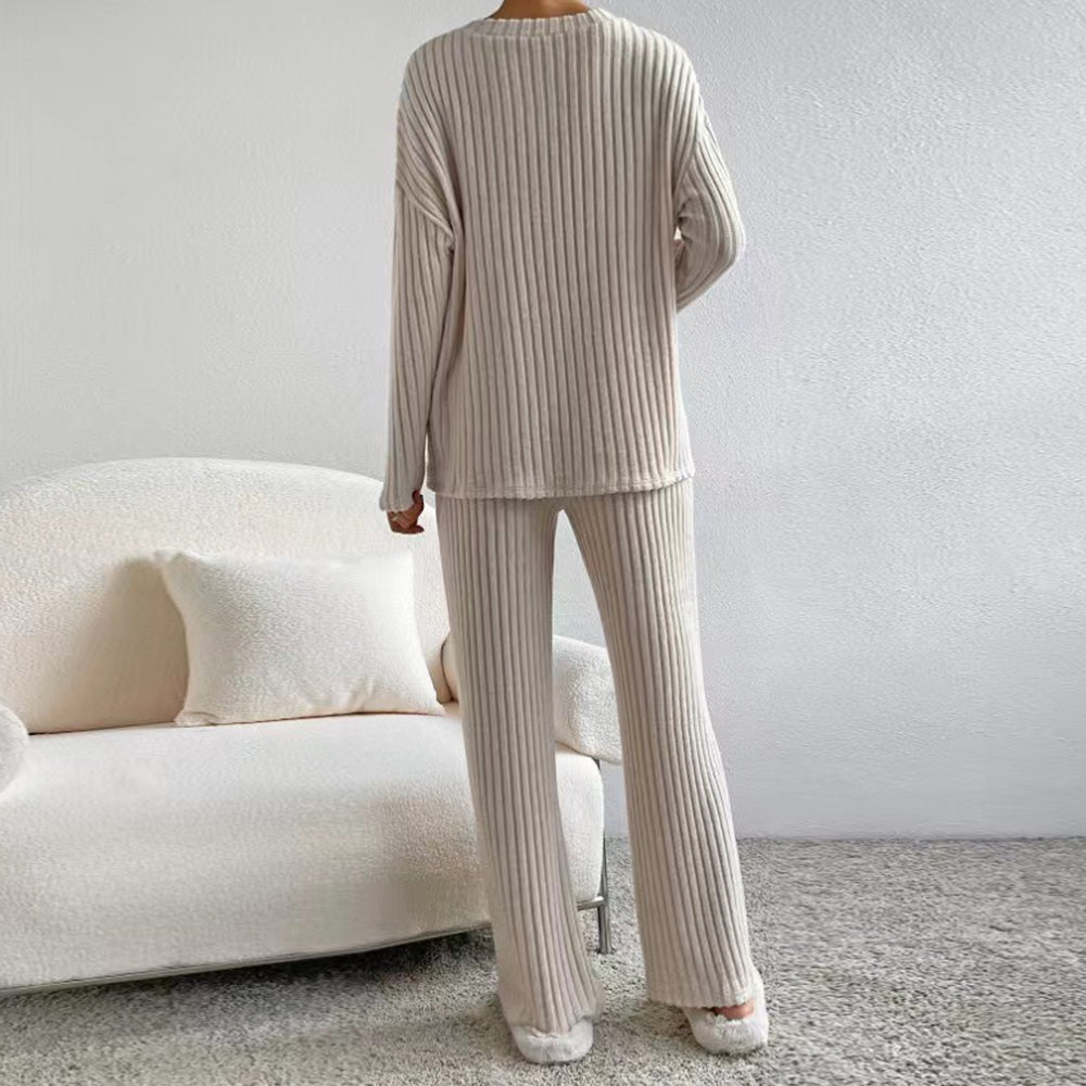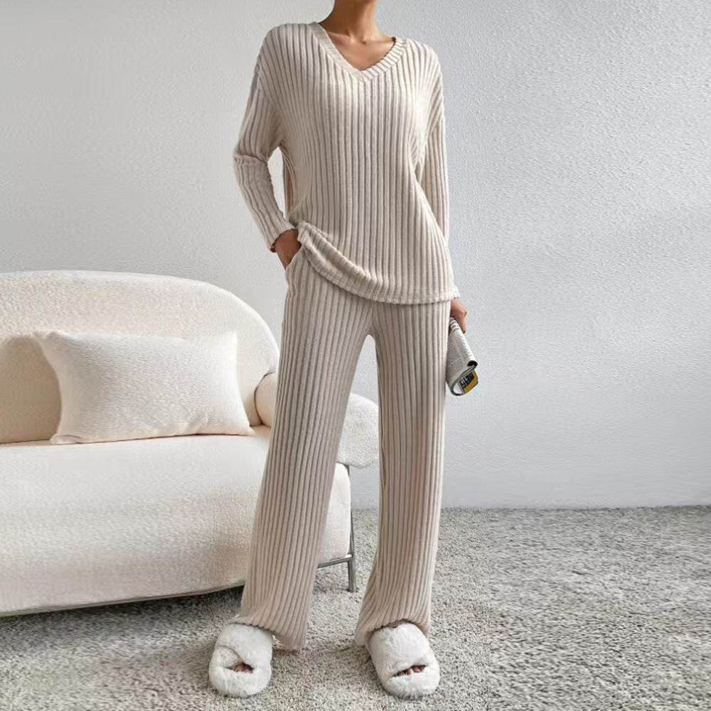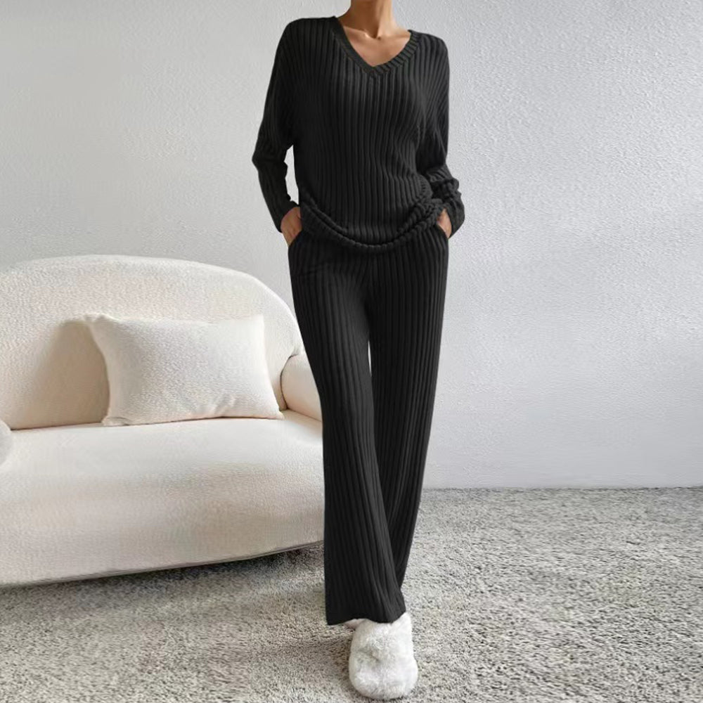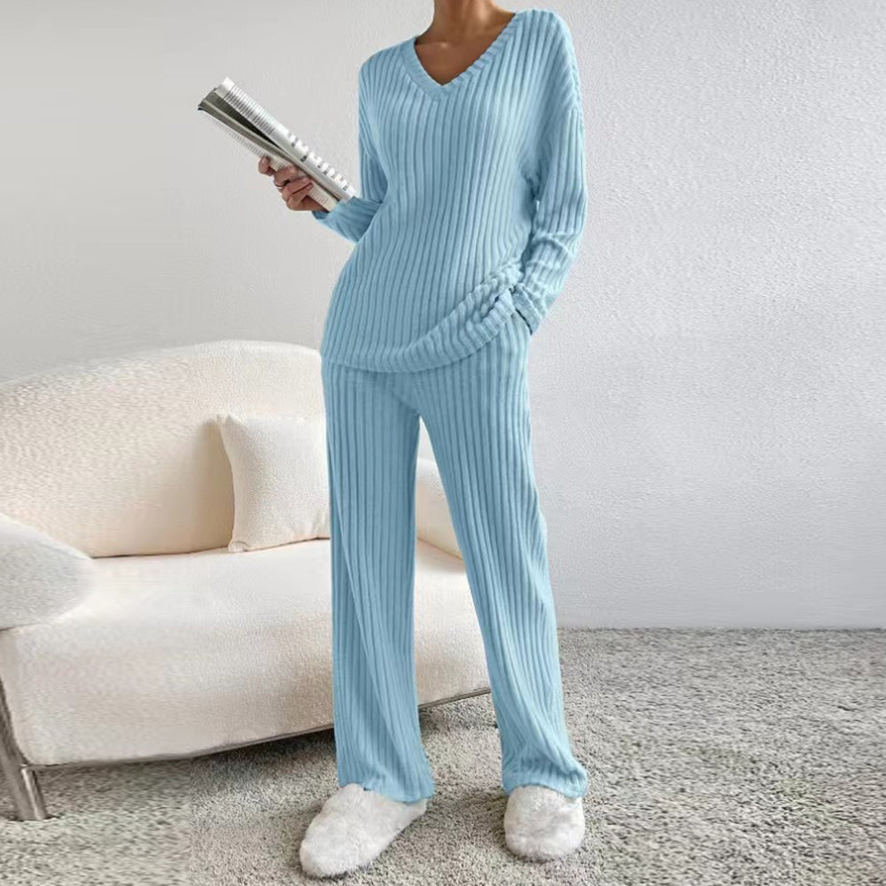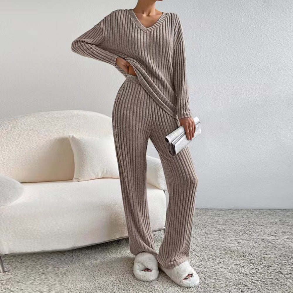 Ten damski garnitur z długim rękawem i spodniami, z dekoltem w kształcie litery V, z dzianiny to idealny wybór dla Ciebie, fashionistki! Nie tylko podkreśla Twój osobisty styl, ale także zapewnia wygodne dopasowanie, dzięki czemu możesz błyszczeć pewnie w każdej okazji.