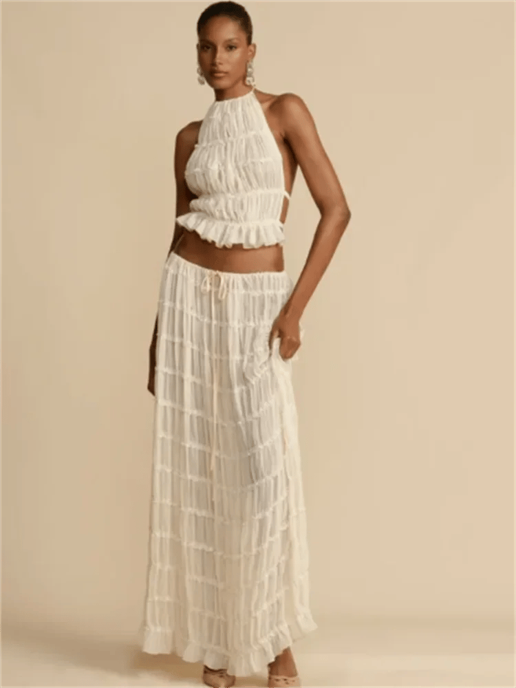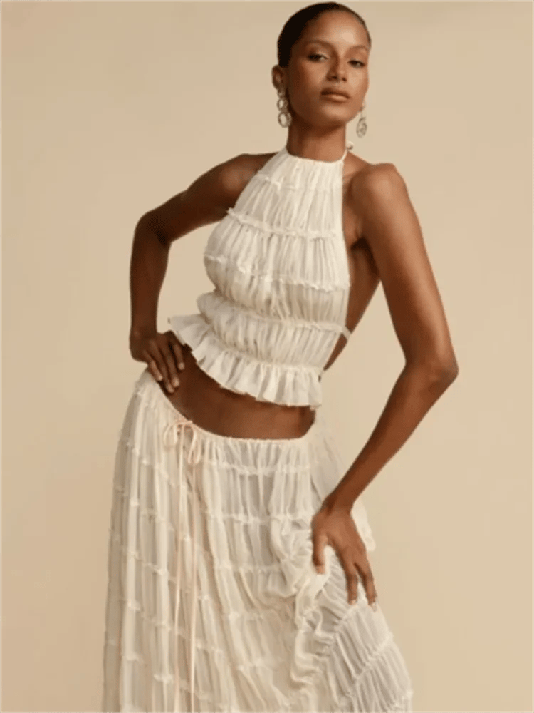 Krótkie topy wiązane na szyi i długie spódnice ze sznurkiem Dwuczęściowy zestaw to coś więcej niż tylko ubranie; to wyraz mody, który emanuje wdziękiem, stylem i wyrafinowaniem. Niezależnie od tego, czy wybierasz się na oficjalne wydarzenie, czy na specjalną uroczystość, ten dwuczęściowy zestaw z pewnością przyciągnie wzrok i pozostawi niezatarte wrażenie dzięki pięknemu wzornictwu i eleganckiemu wyglądowi.