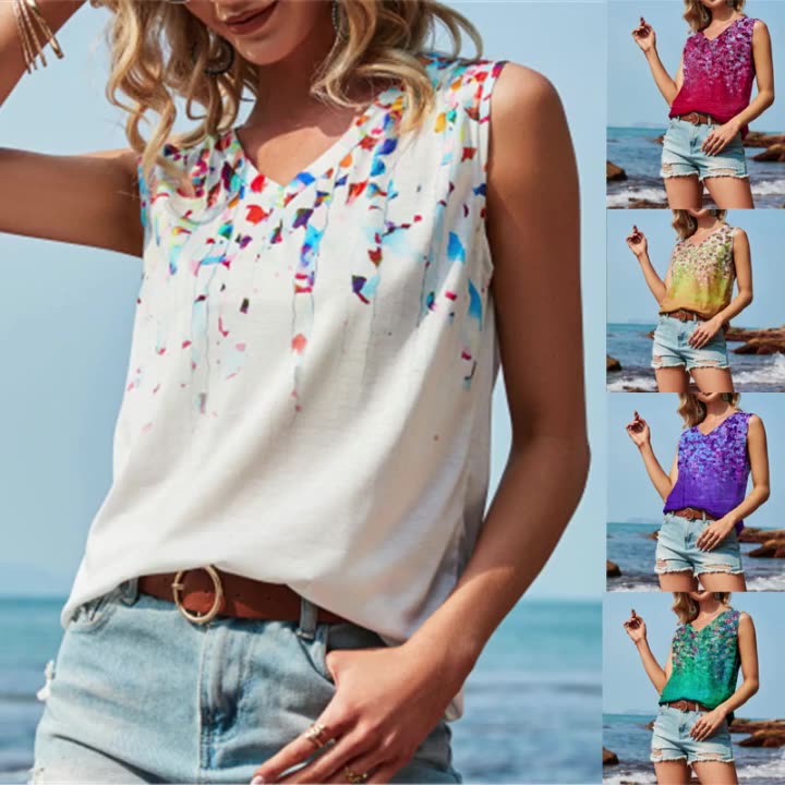 Projekt: topy w stylu vintage w kwiaty, bez rękawów, z dekoltem w kształcie litery V, luźna letnia kamizelka dla kobiet.