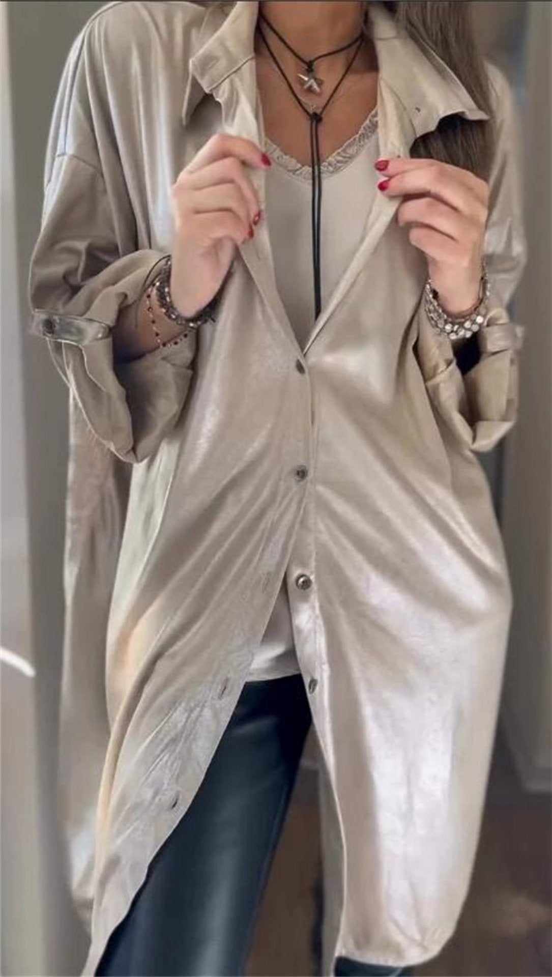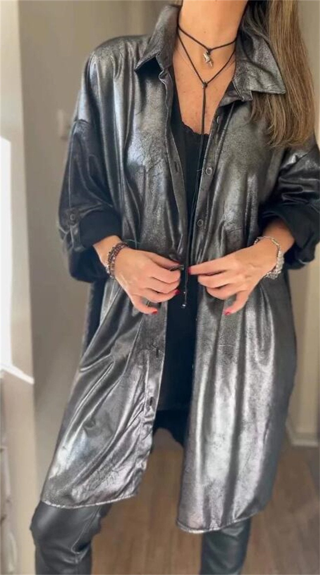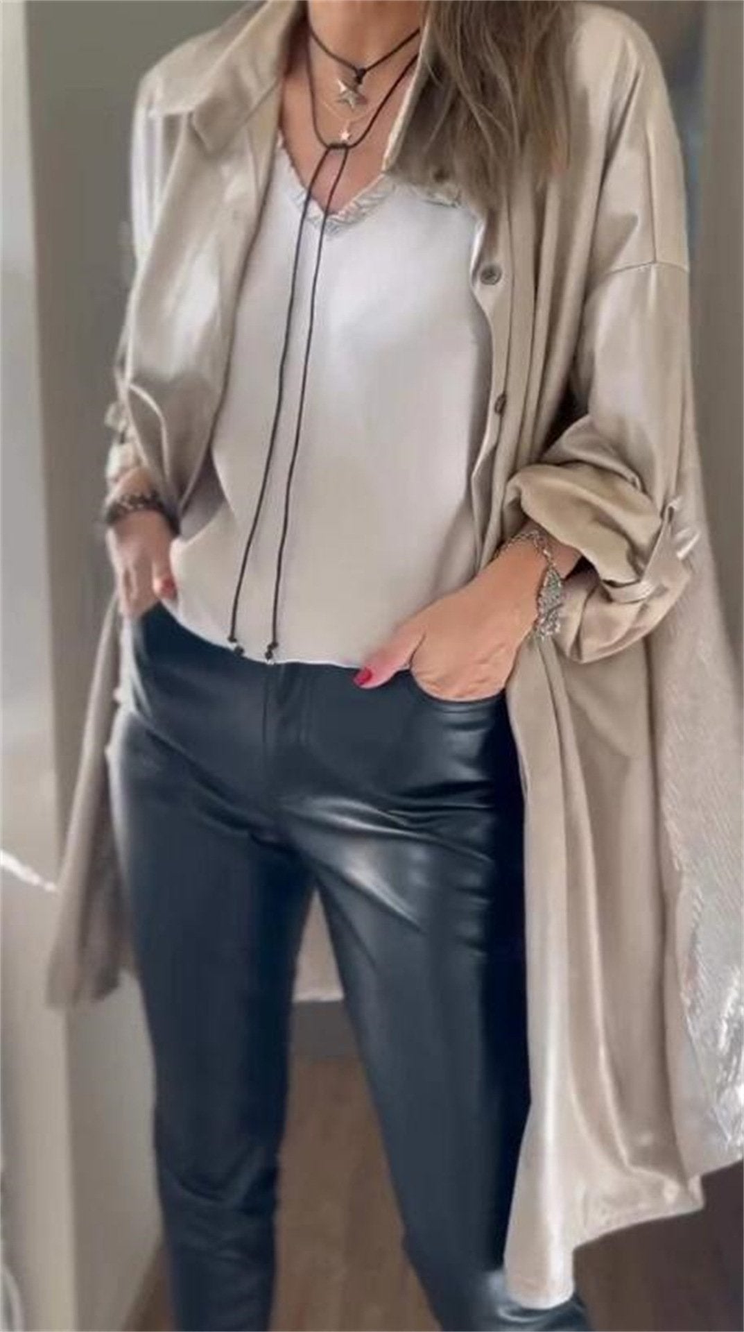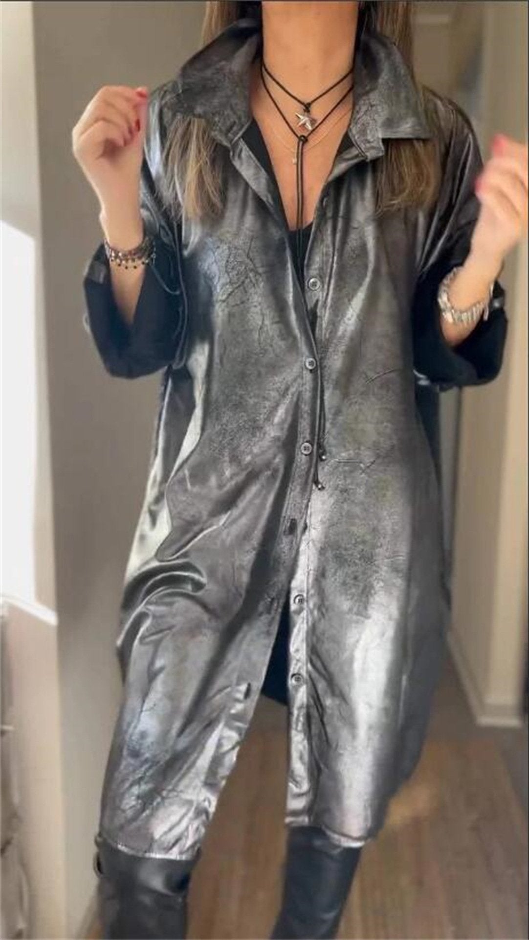 Ten oszałamiający długi trencz ma klasyczne klapy i zapinany na guziki przód, wykonany z wysokiej jakości skóry , co zapewnia wyrafinowany i dopracowany wygląd