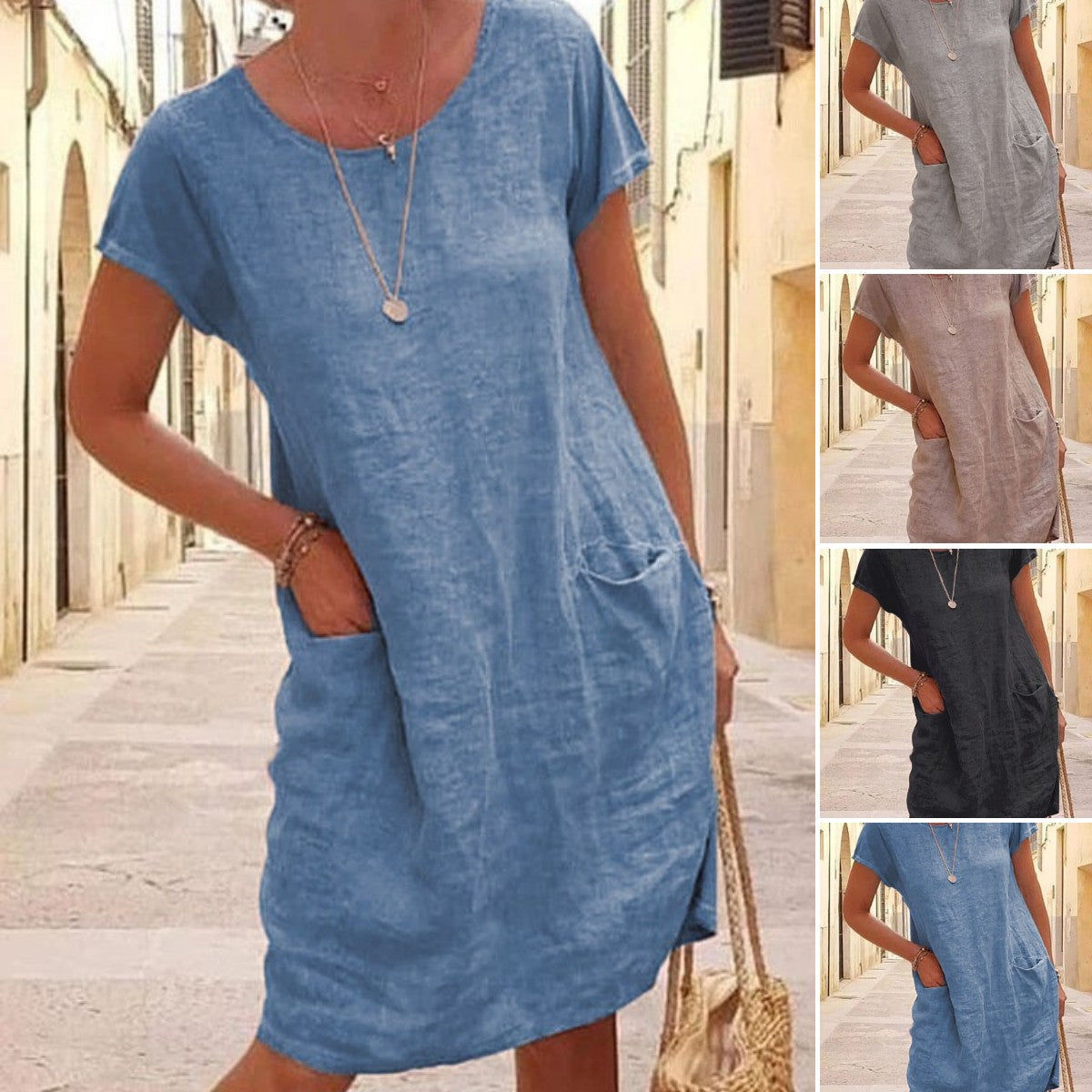 🌞 Fajna i wygodna: ta letnia, luźna, jednokolorowa, bawełniana i lniana sukienka dla kobiet z kieszeniami i krótkimi rękawami, okrągłym dekoltem jest wykonana z lekkiej bawełny i lnu o dobrej oddychalności, co zapewnia odświeżające i wygodne noszenie.