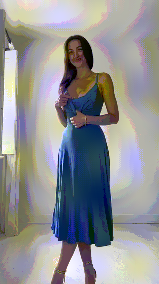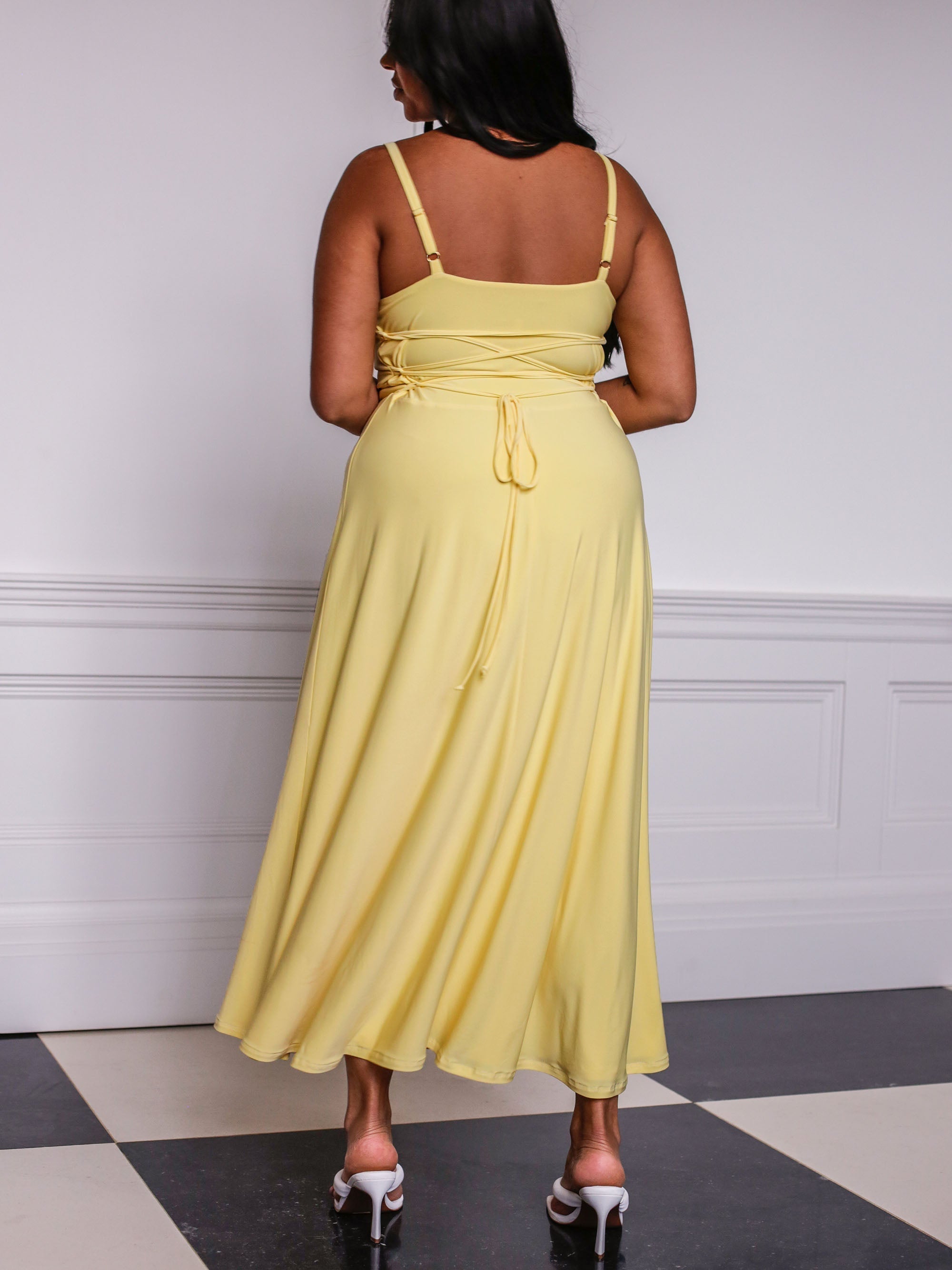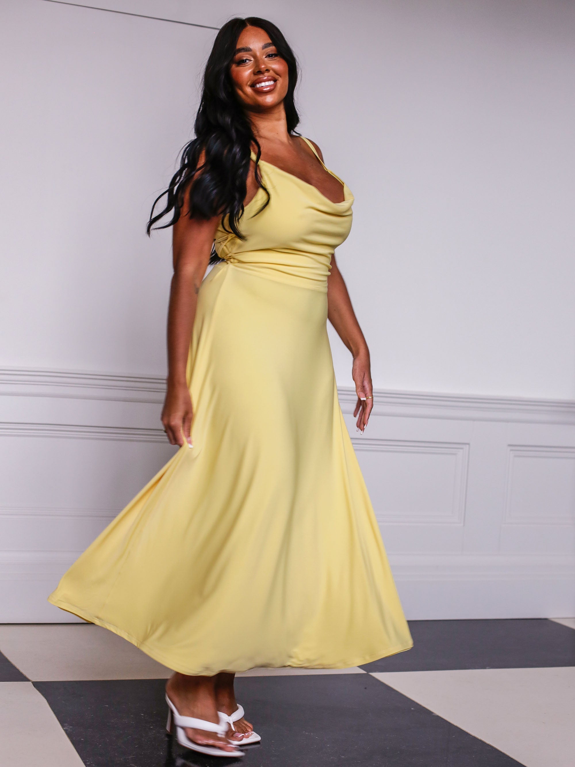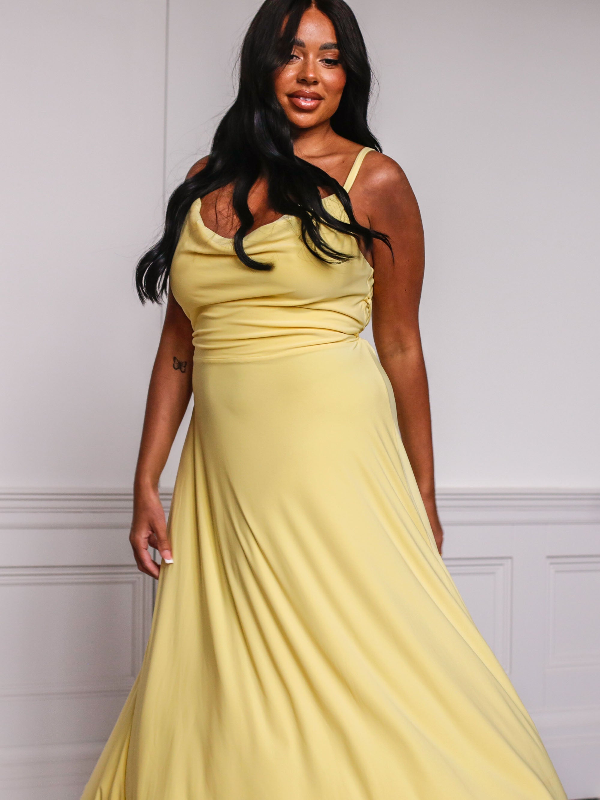 Wspaniała sukienka maxi z drapowanym przodem okalającym dekolt, zwiewną spódnicą i częścią sznurowaną dla regulowanego dopasowania w stylu gorsetu. Drapowana sukienka maxi „Lulah” emanuje elegancją, jednocześnie skromnie sugerując seksapil. Dwuwarstwowa tkanina zapewnia pełną ochronę przed prześwitywaniem, a wbudowany biustonosz ukryty pod drapowanym dekoltem zapewnia dodatkowy spokój.