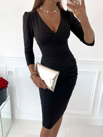 - Wizytowa, elegancka sukienka o klasycznym kroju, średniej długości, wykonana z elastycznej, przyjemnej w dotyku tkaniny. Sukienka ma bardzo kobiecy krój, który optycznie wysmukla sylwetkę - dekolt w kształcie litery V oraz ołówkowa spódnica z marszczeniami ukrywającymi niedoskonałości. Sukienka jest przepięknie wykonana z dbałością o każdy szczegół i ma podszewkę. Idealna na święta, wesela, chrzciny czy inne wyjątkowe okazje.