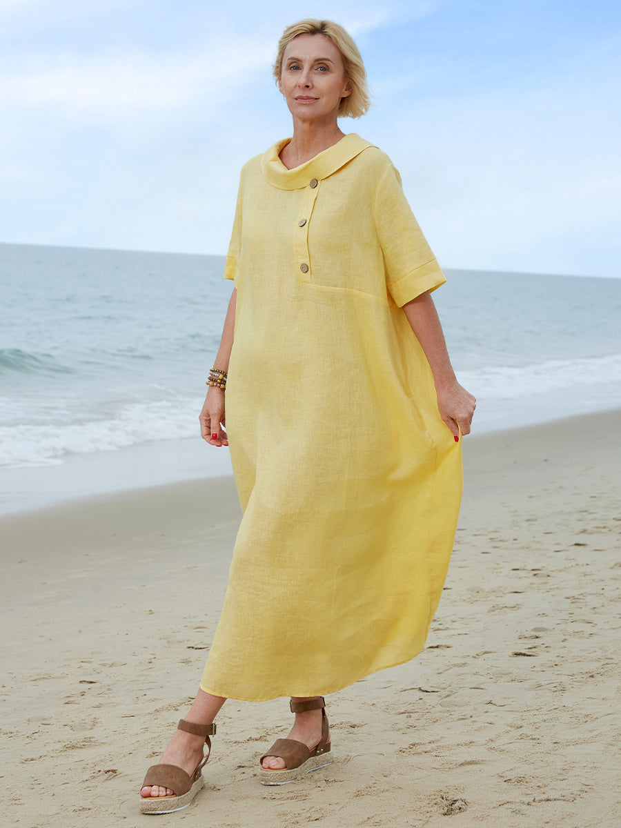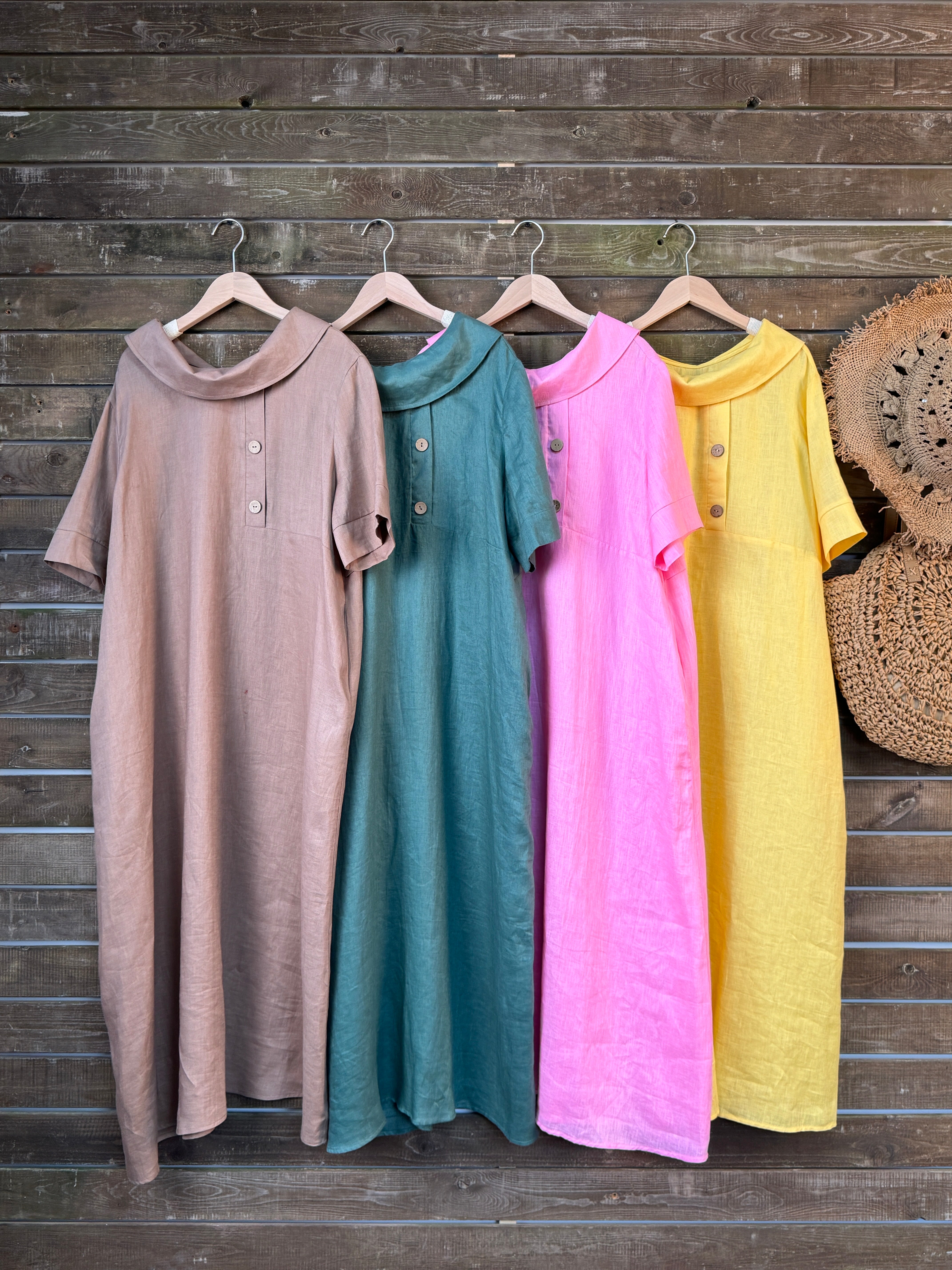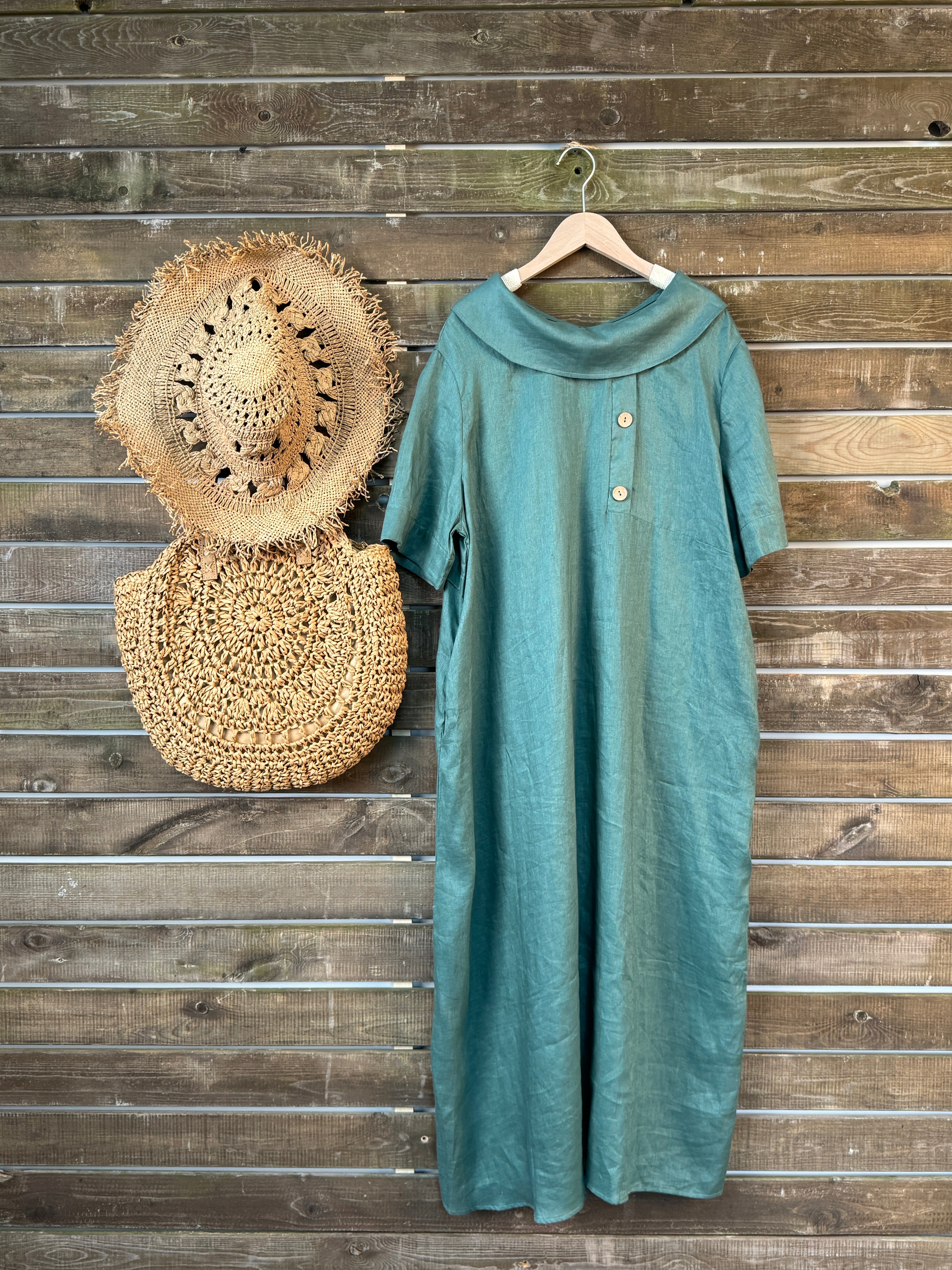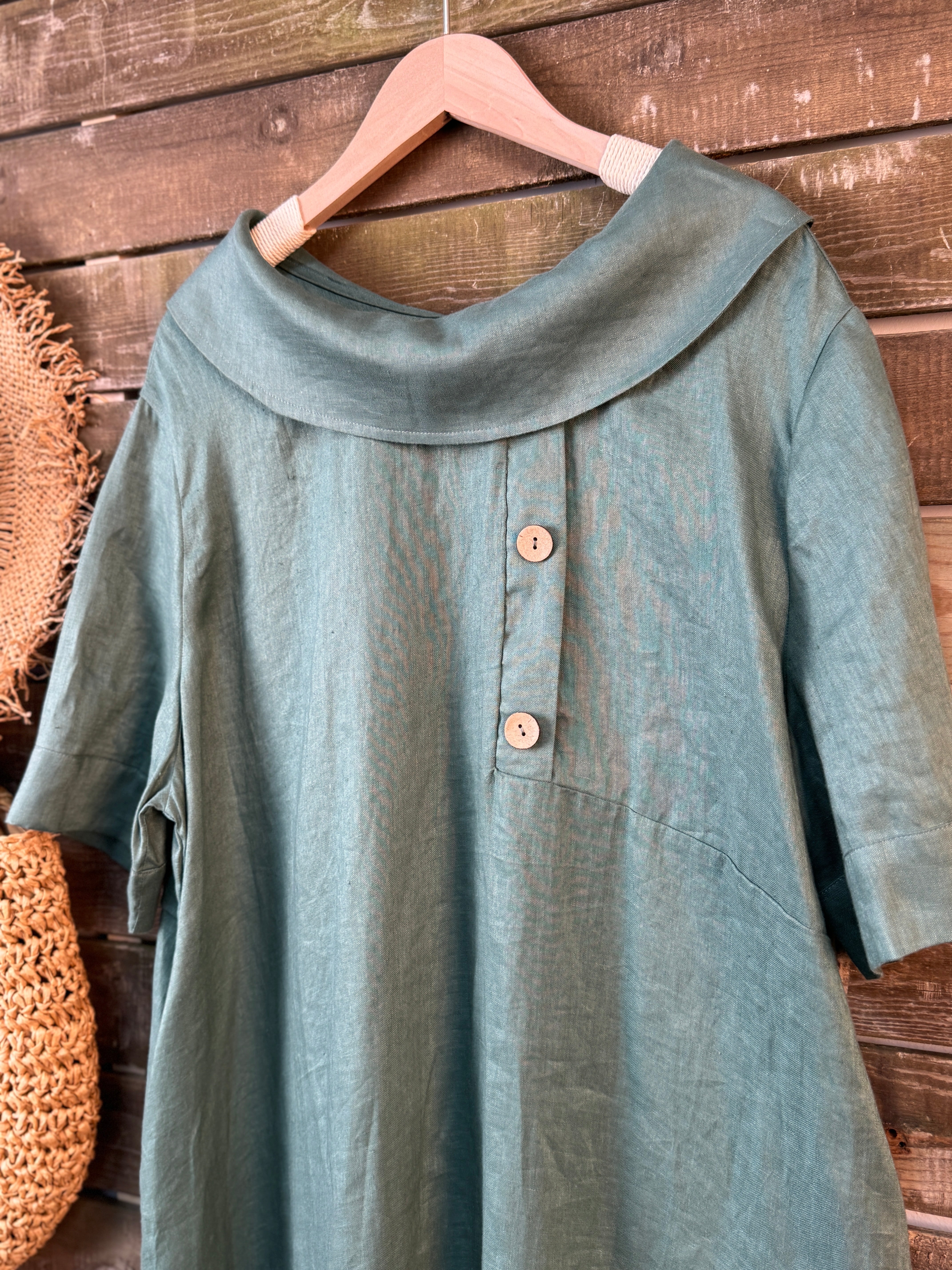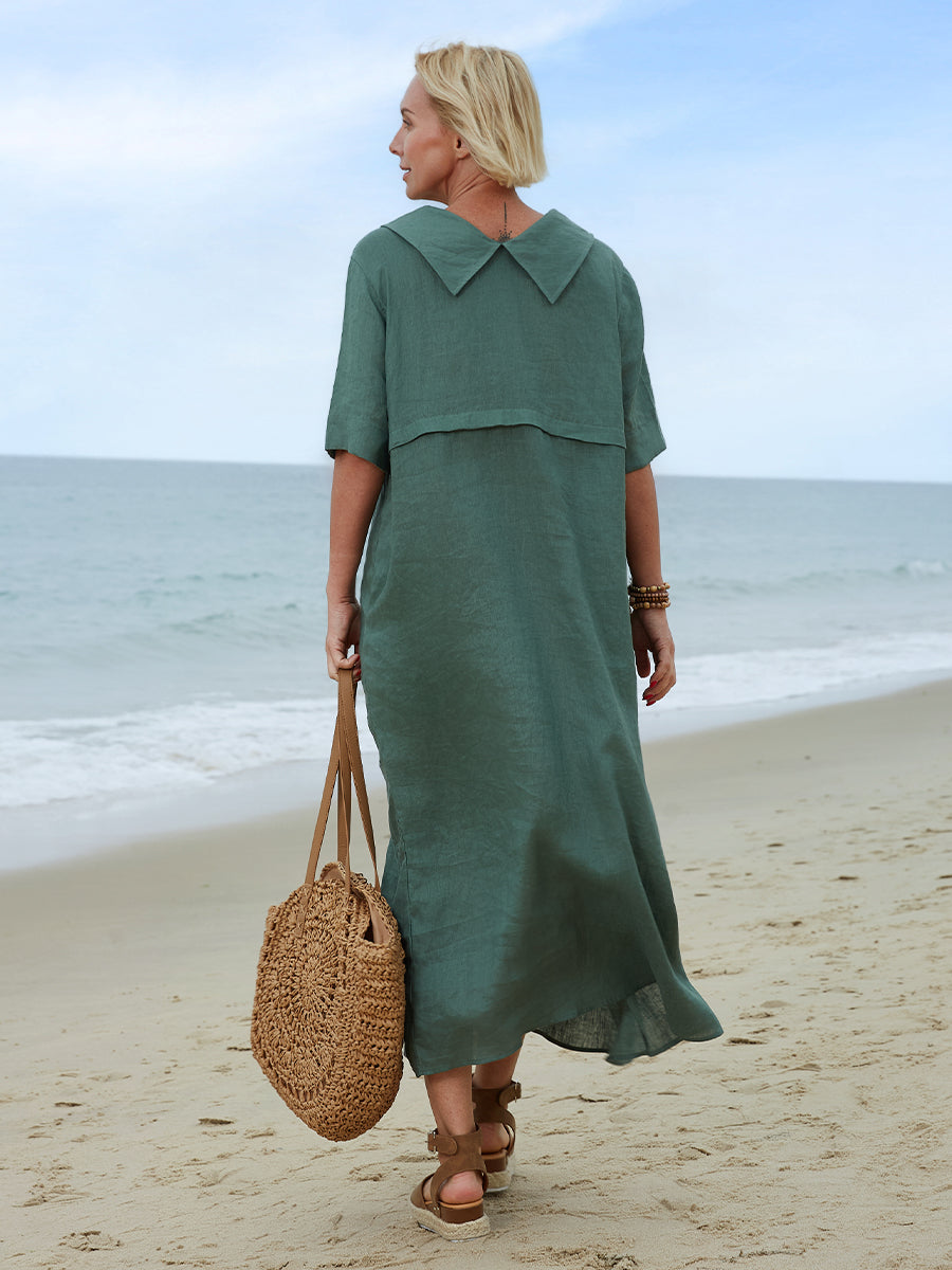 Lniana sukienka z kołnierzem Peter Pan i przednim guzikiem