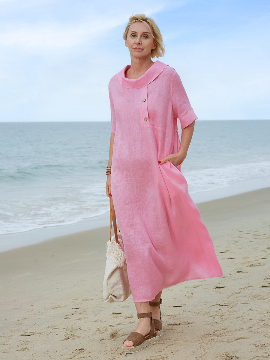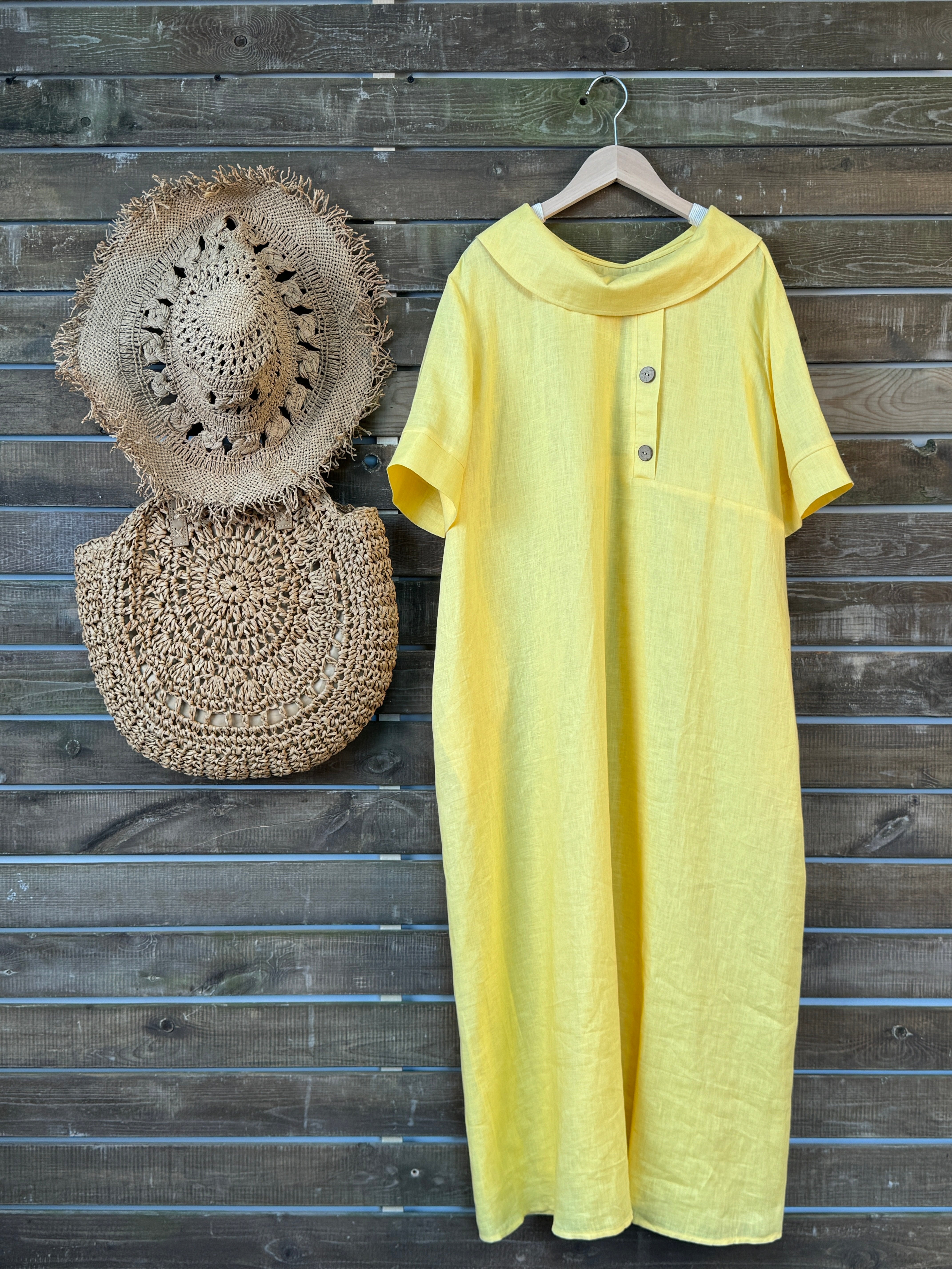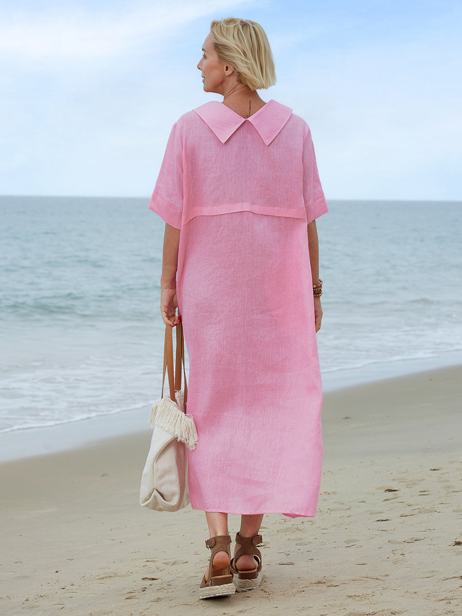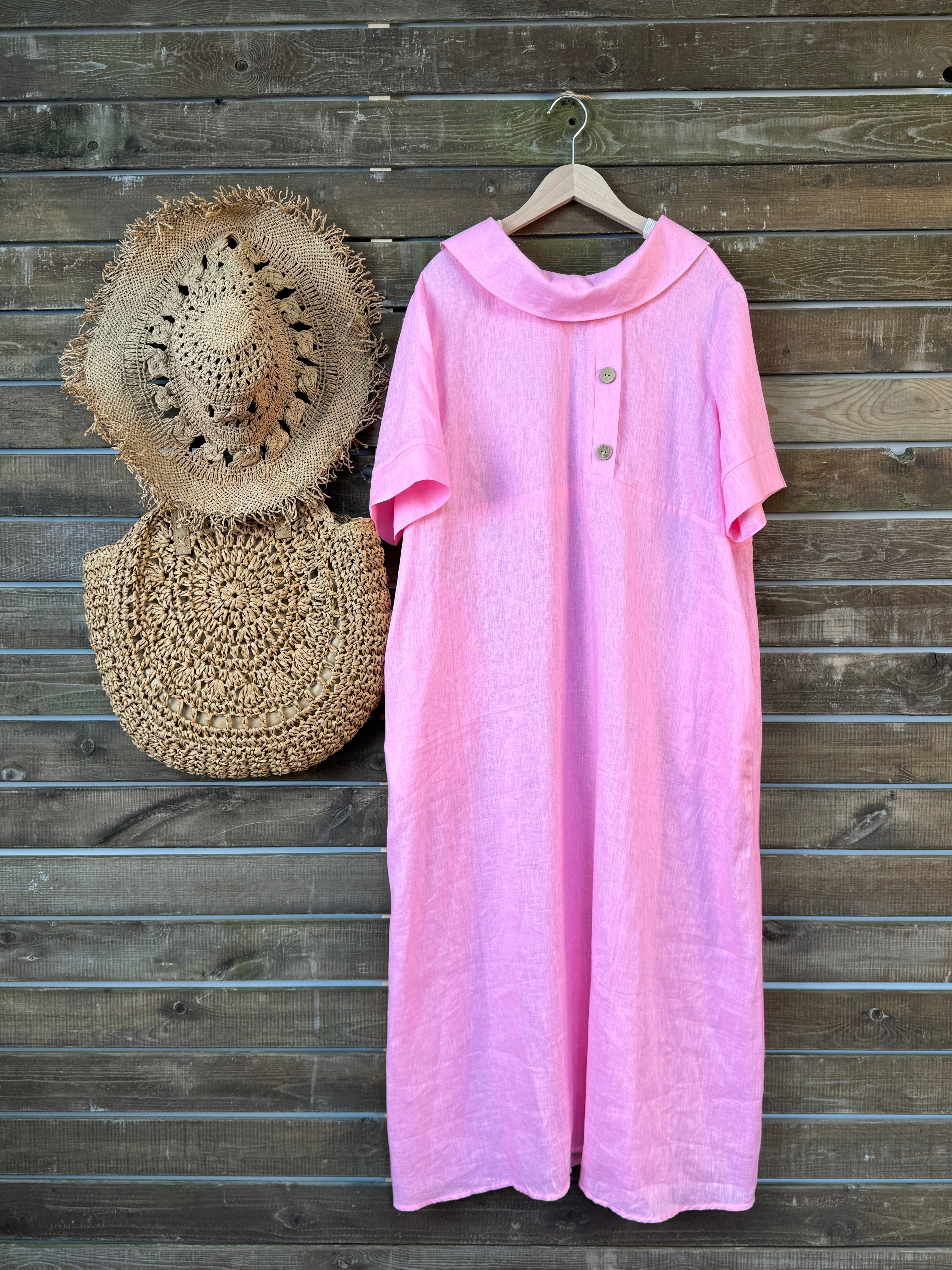 Lniana sukienka z kołnierzem Peter Pan i przednim guzikiem