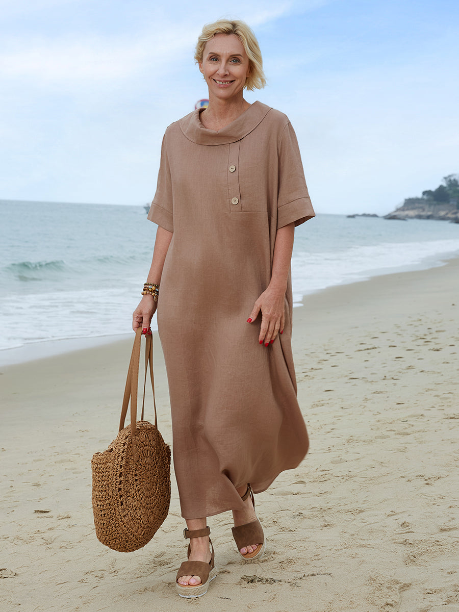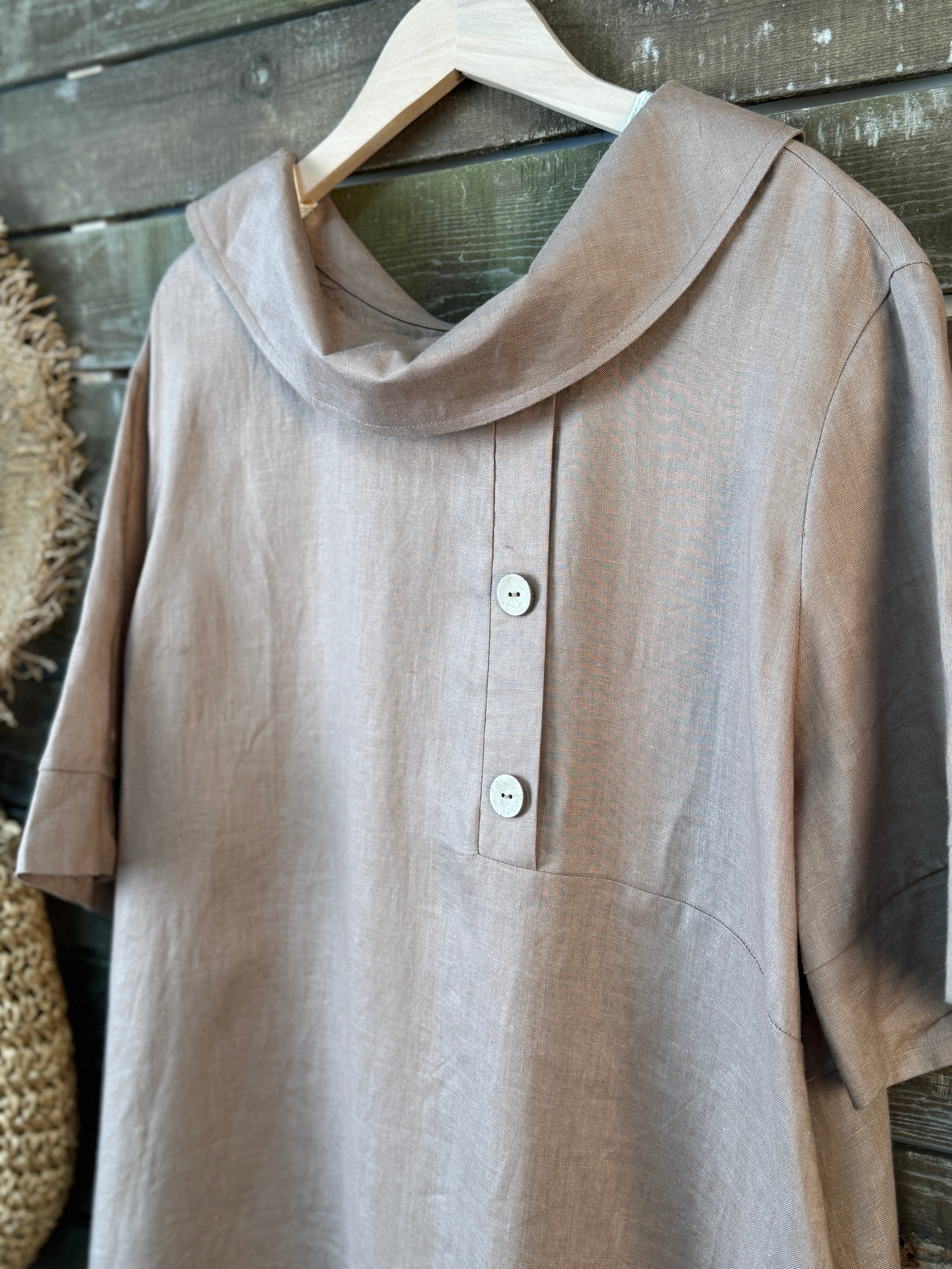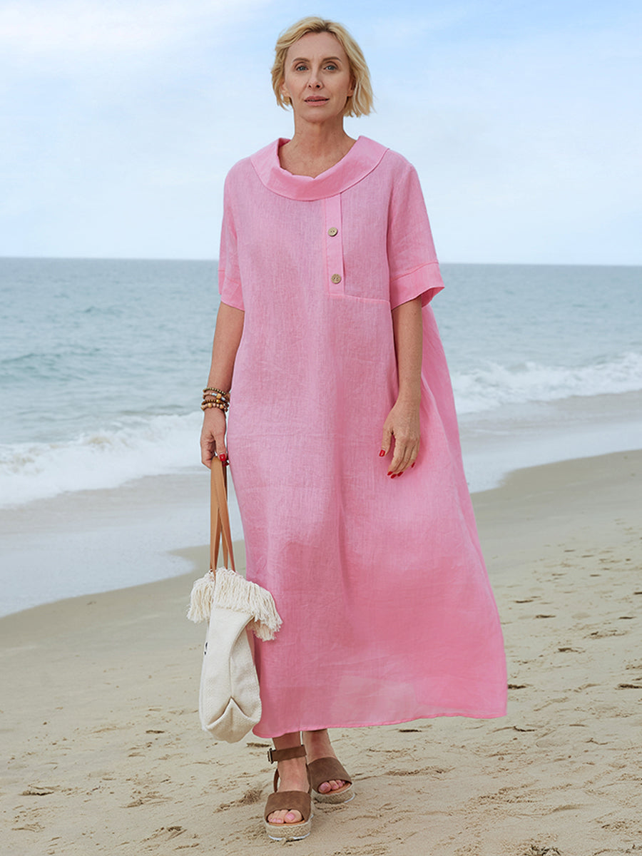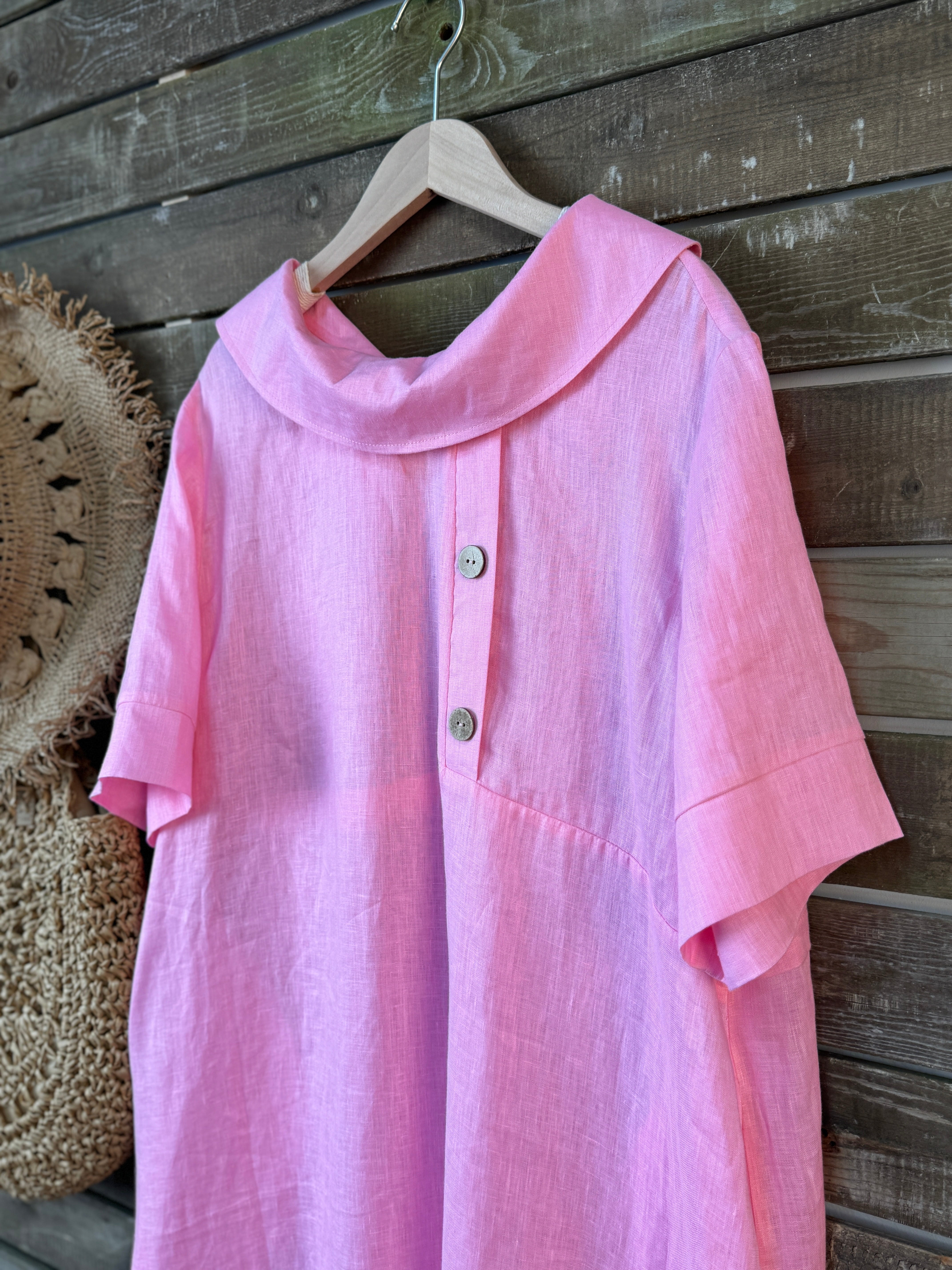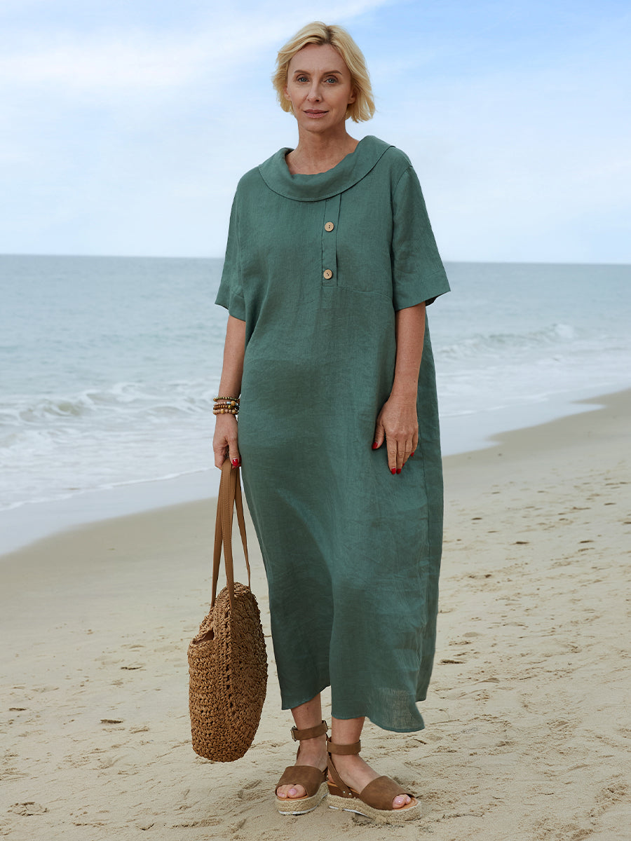 Lniana sukienka z kołnierzem Peter Pan i przednim guzikiem