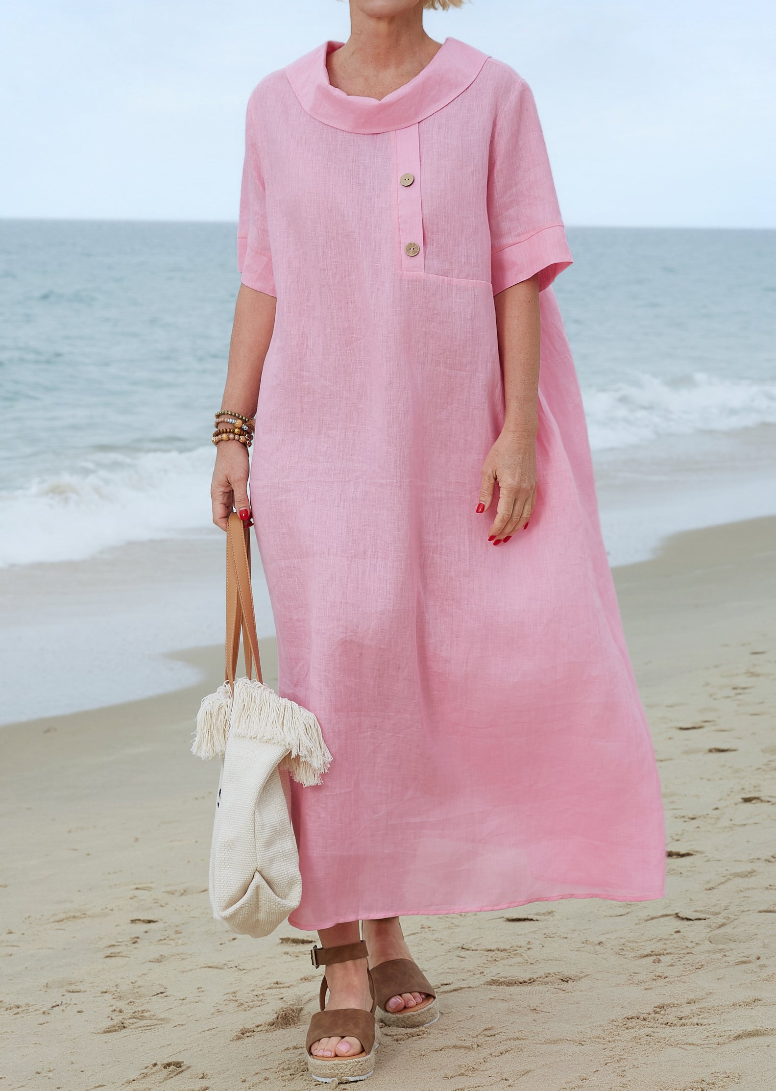 Ta urocza sukienka ma zrelaksowaną sylwetkę z krótkimi rękawami i klasyczny kołnierz Peter Pan, nadając jej odrobinę inspirowanej vintage elegancji. Dekoracyjne przyciski z przodu dodają wyrafinowany detal, a kieszenie boczne zwiększają jego praktyczność. Dostępny w miękkim różowym, słonecznym żółtym, świeżym zielonym i klasycznym khaki, jest to wszechstronny kawałek odpowiednio na przypadkowe, jak i półformalne okazje.