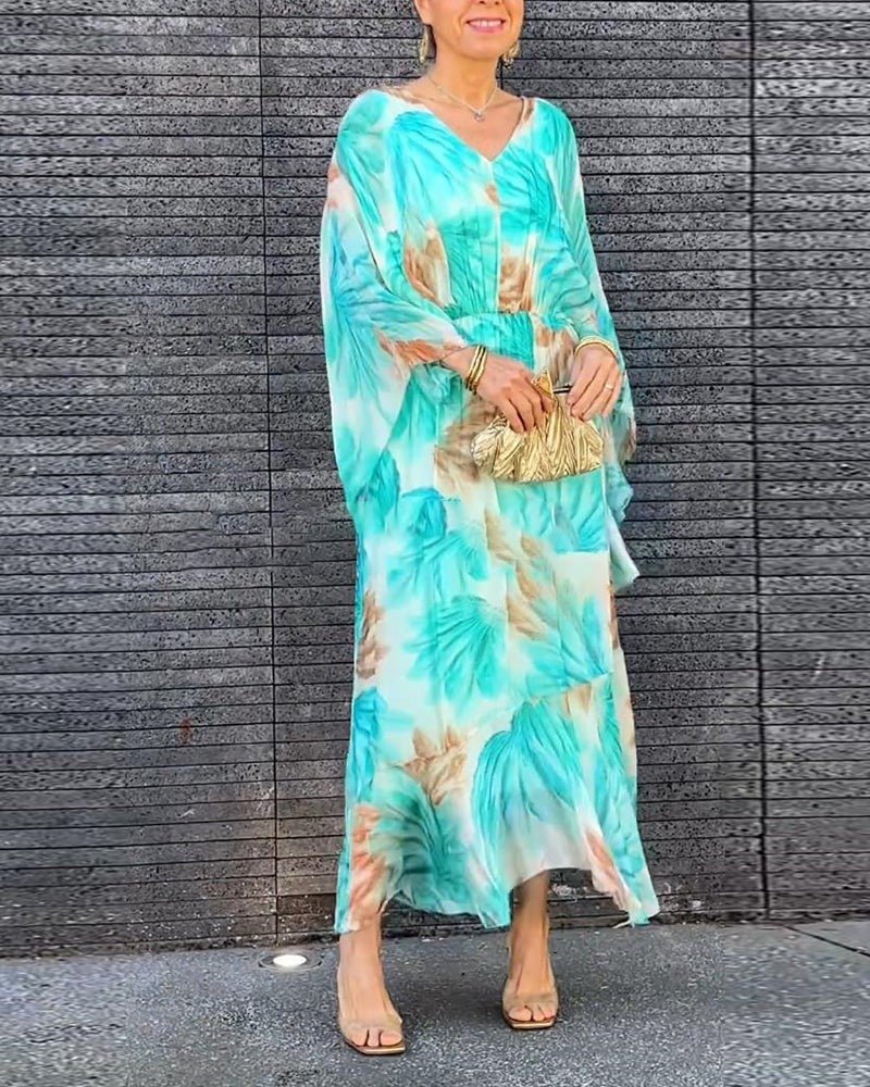 Elegancka, zwiewna sukienka z nadrukiem i dekoltem w kształcie litery V