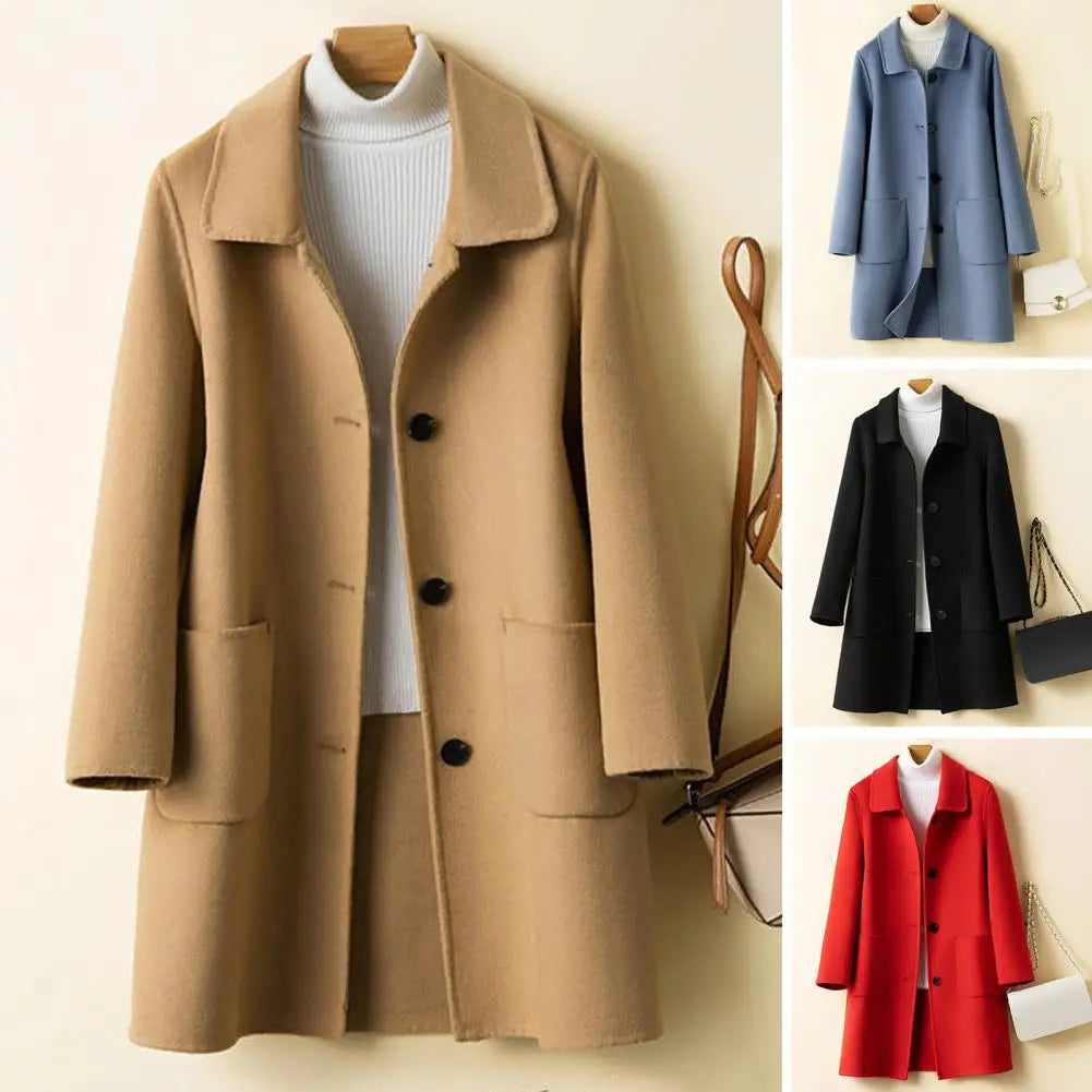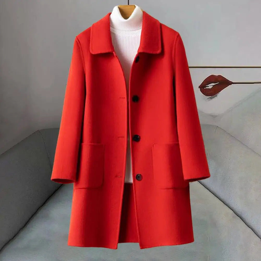 Ten wełniany płaszcz z długimi rękawami jest wykończony eleganckimi guzikami z przodu, gdzie ciepło spotyka się ze stylem.