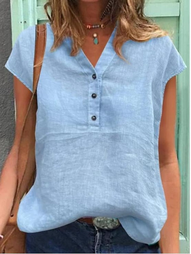 Długość rękawa: Krótki rękaw , Look After Me: pranie w pralce , na mokro i na sucho , dekolt: dekolt w kształcie litery V , materiał: bawełna , wzór: guzik , pora roku: lato , wzór: gładki , rodzaj dopasowania: regularny krój , okazja: codzienna , ulica , Rodzaj koszulki: Biała bawełniana bluzka , Biały bawełniany top , Długi bawełniany top , Koszula , Bluzka , Rodzaj nadruku: niedrukujący , Elastyczność: Mikroelastyczna , Styl: Moda , Grubość: Standardowa , Płeć: damska ,