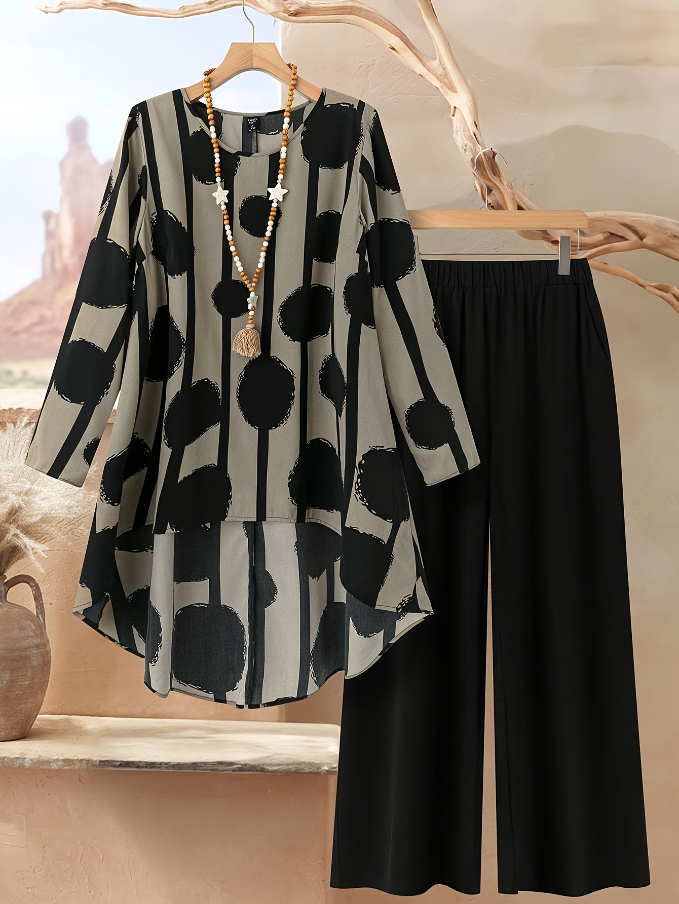 Who could resist this outfit with its "inherent retro art buff"? The ink-wash polka dot and striped print exudes a relaxed vibe, while the loose top and wide-leg pants offer comfort and ease, and the black and gray color scheme adds a touch of sophistication. Whether for casual loungewear or a casual outing, this outfit effortlessly captures a "casual yet elegant" aura.
