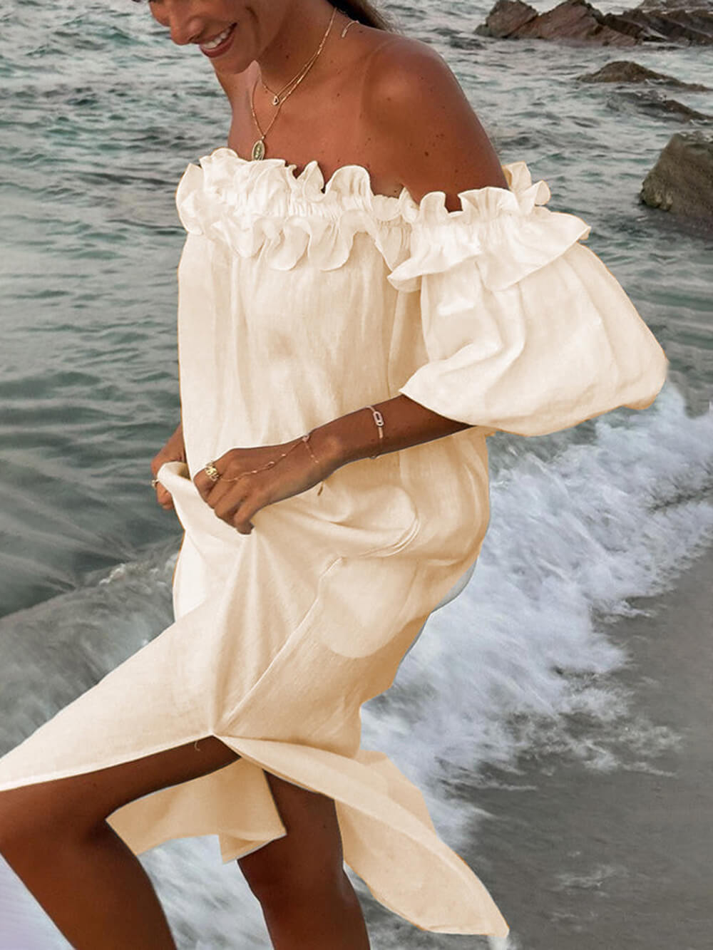 Przedstawiamy naszą sukienkę midi z bufiastymi rękawami i odkrytymi ramionami, ponadczasową i elegancką kreacją, która sprawi, że poczujesz się swobodnie i szykownie.