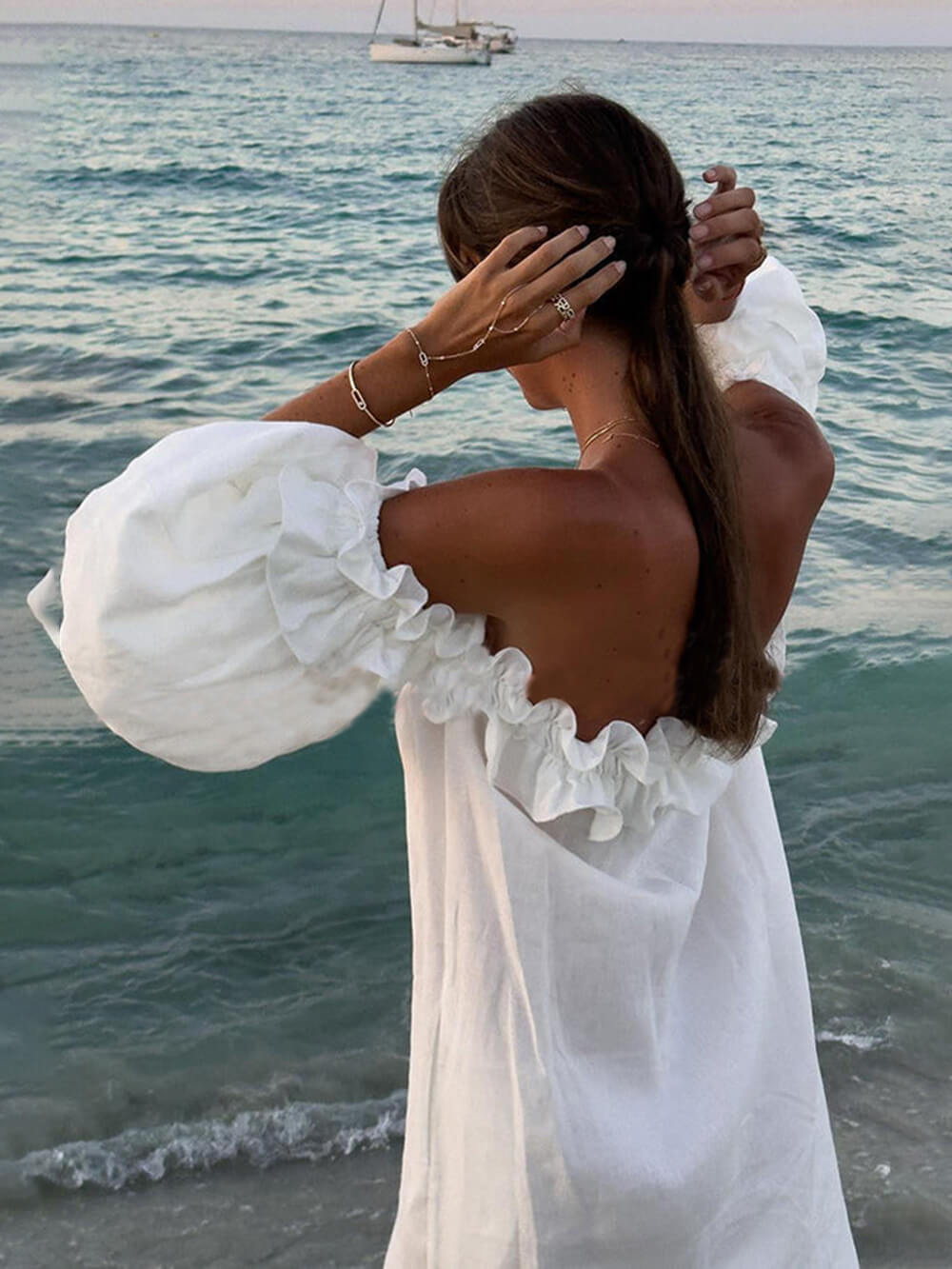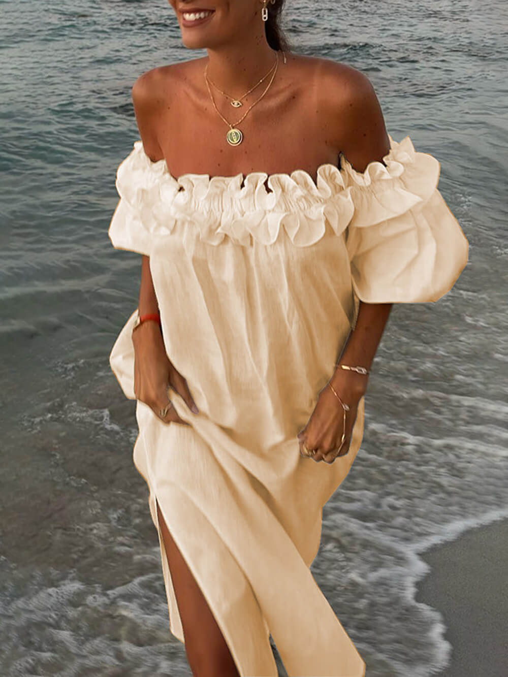 Połącz ją z sandałami na pasku i wyrazistymi kolczykami, aby uzyskać wyrafinowany wygląd na co dzień, lub ubierz ją w szpilki i kopertówkę na wieczorne wyjście. Dzięki wszechstronnemu krojowi sukienka midi z odkrytymi ramionami, bufiastymi rękawami i kieszeniami jest idealnym dodatkiem do każdej garderoby.