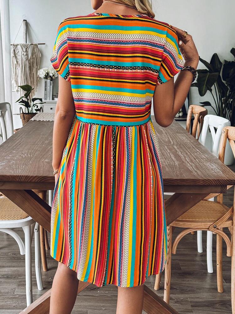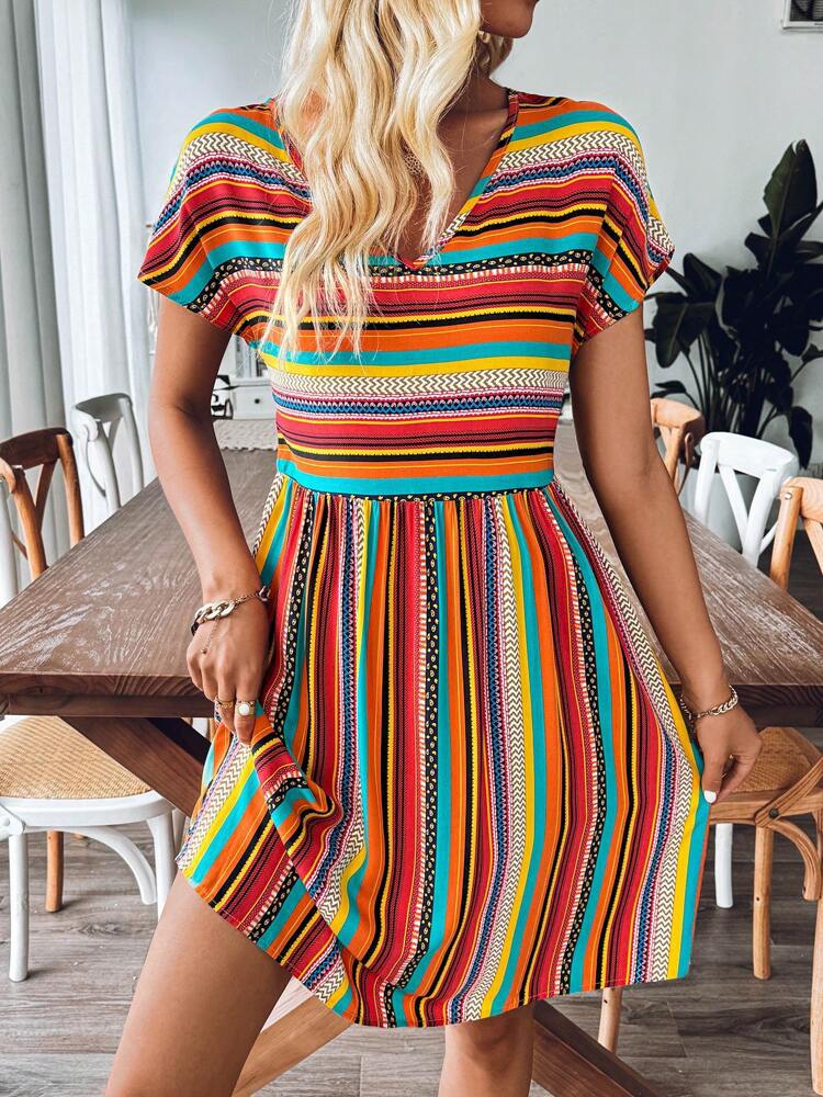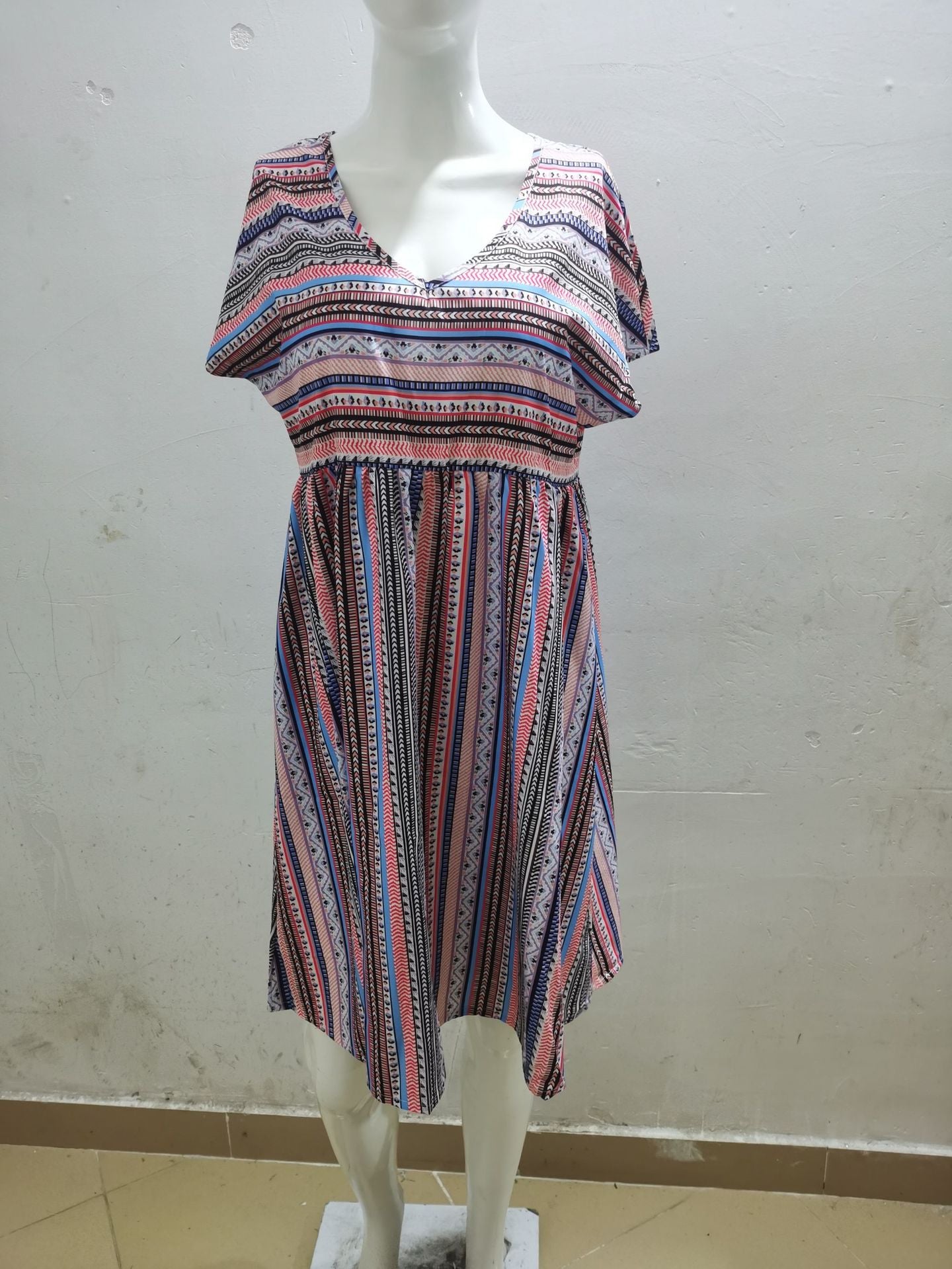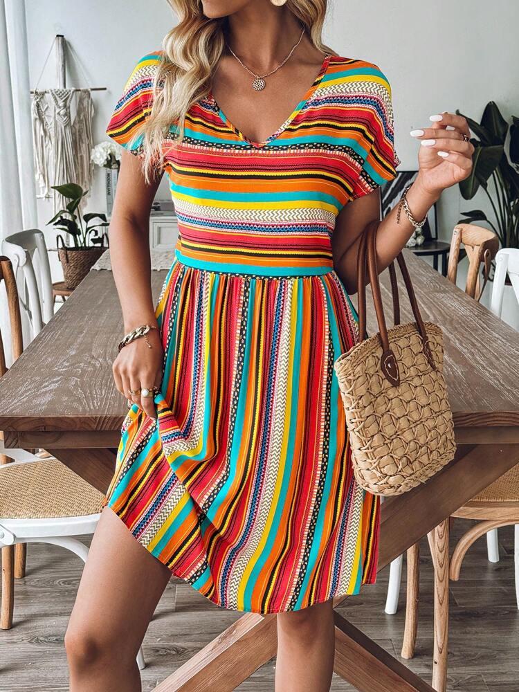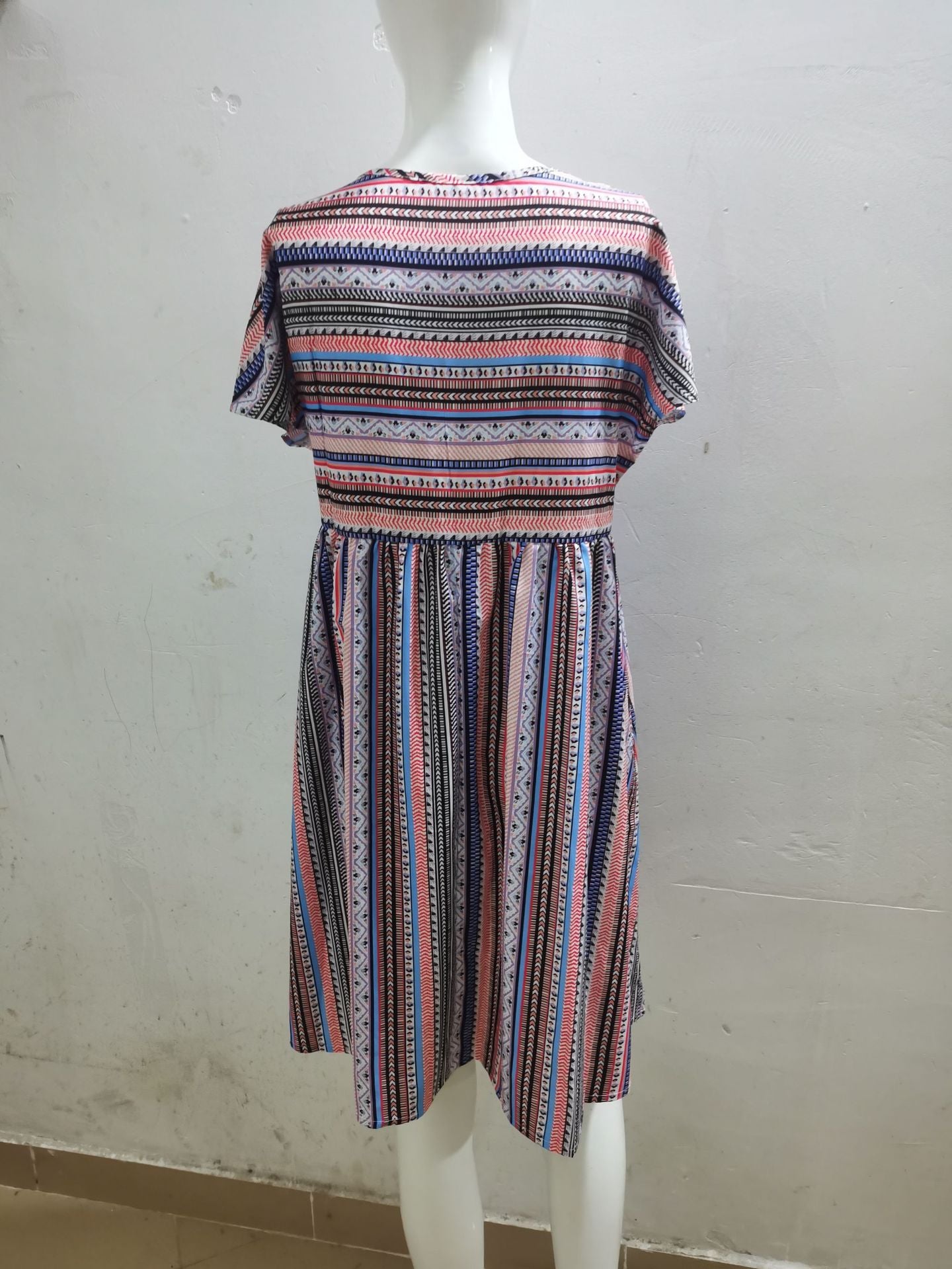 Cechy konstrukcyjne: modny nadruk w paski, dekolt w kształcie litery V ukazuje uroczą linię szyi, a rękaw nietoperzowy dodaje niepowtarzalnego stylu i dynamiki.