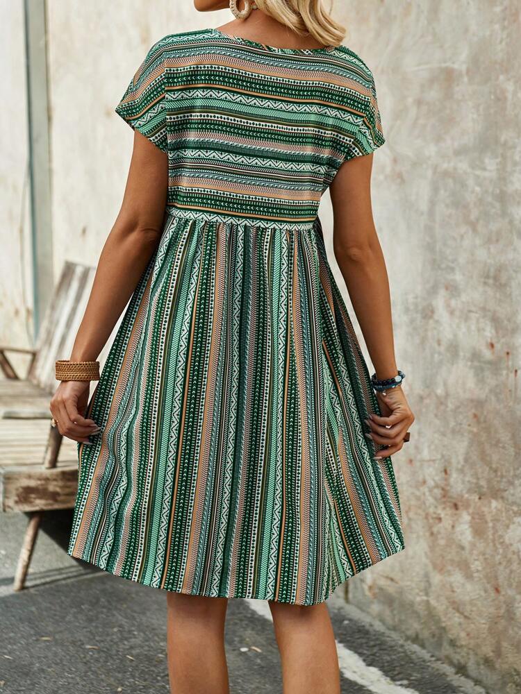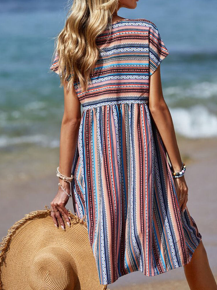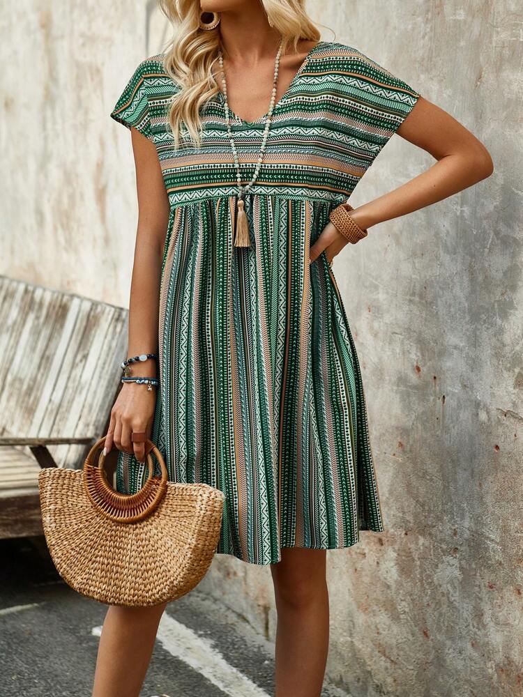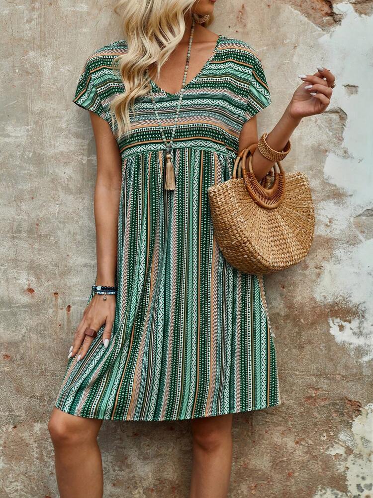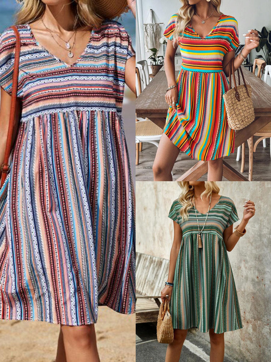 Cechy konstrukcyjne: modny nadruk w paski, dekolt w kształcie litery V ukazuje uroczą linię szyi, a rękaw nietoperzowy dodaje niepowtarzalnego stylu i dynamiki.
