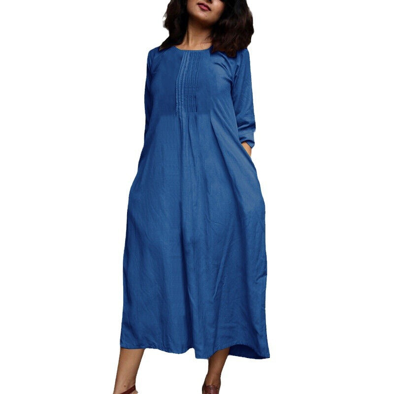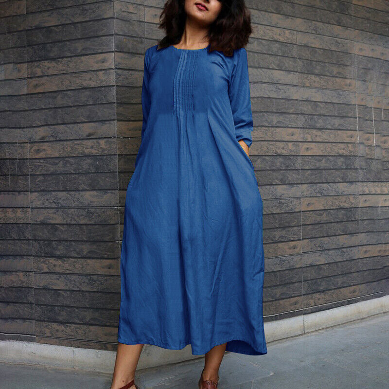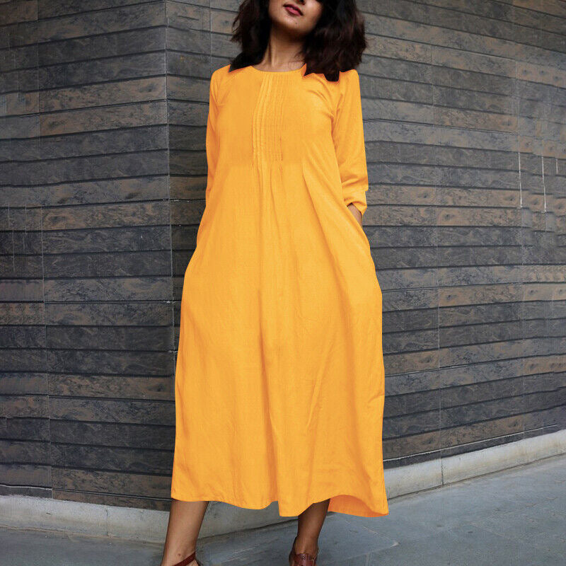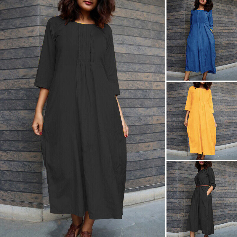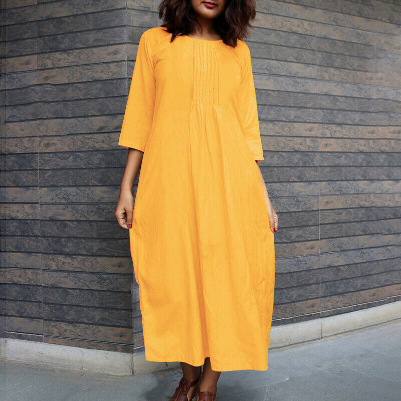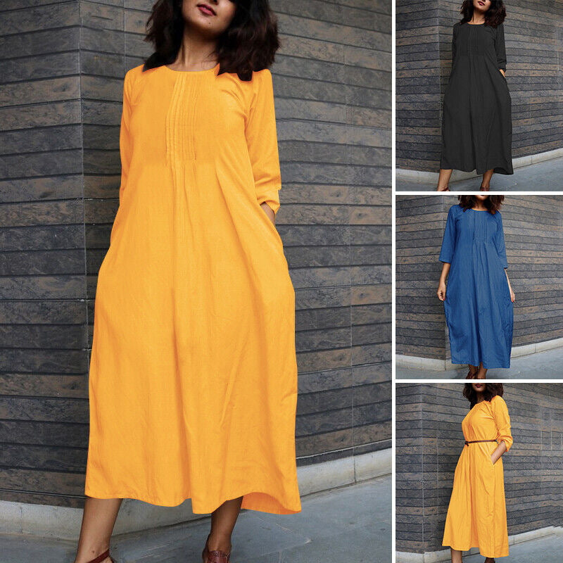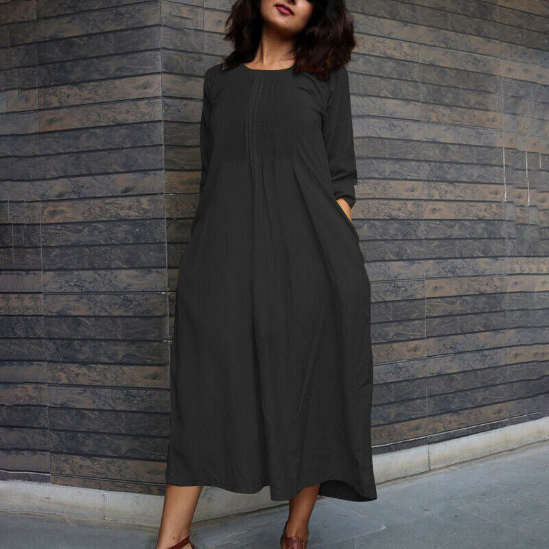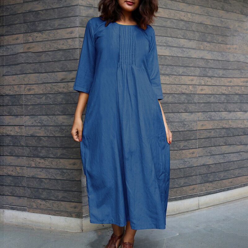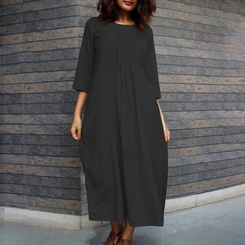 Modny krój z okrągłym dekoltem: ta bawełniana i lniana sukienka z długimi rękawami ma klasyczny krój z okrągłym dekoltem, który jest prosty, ale elegancki, wykazuje temperament i nadaje się na różne okazje! ✨