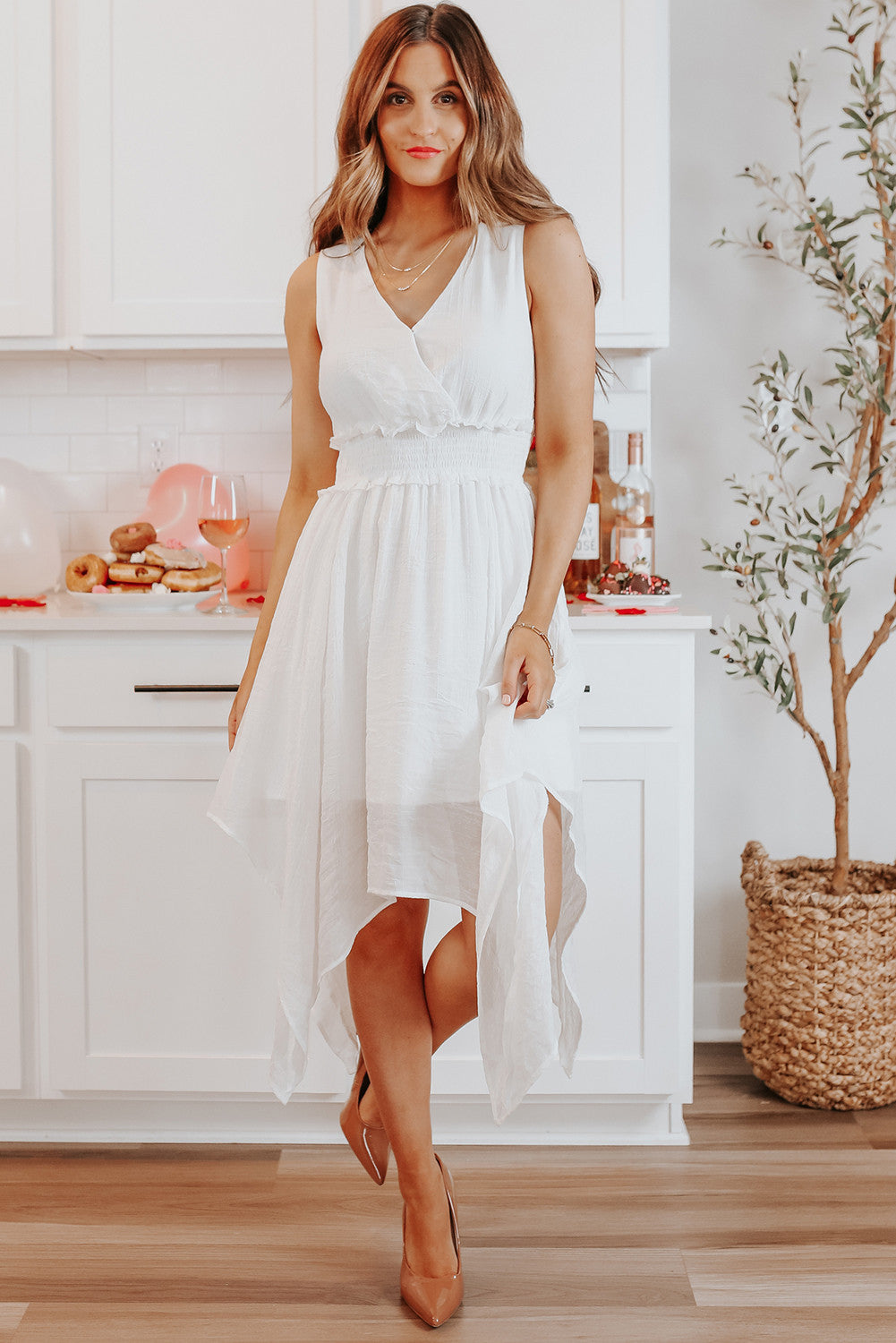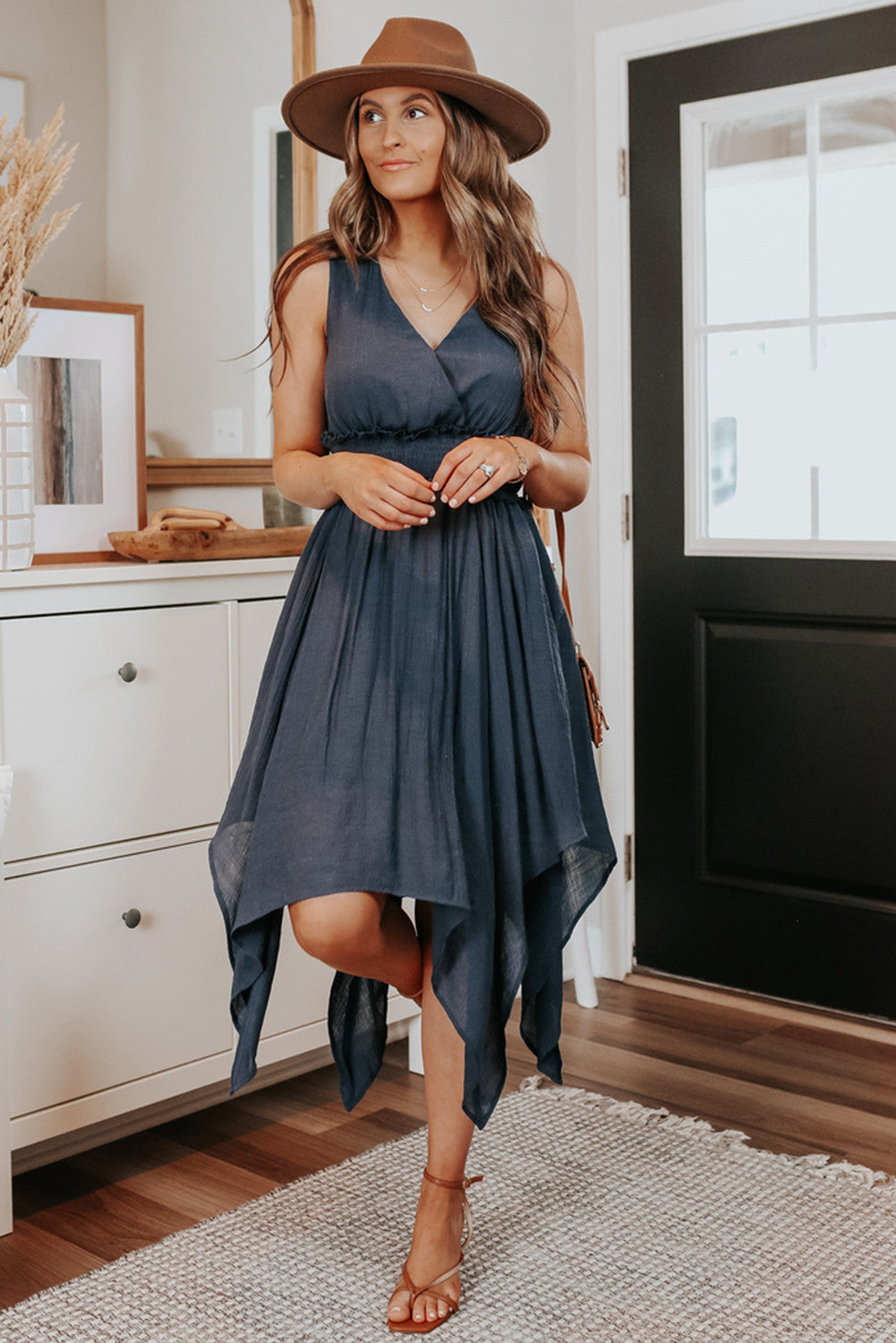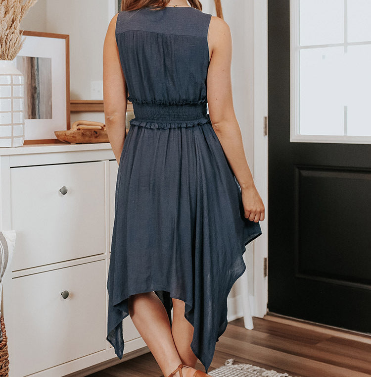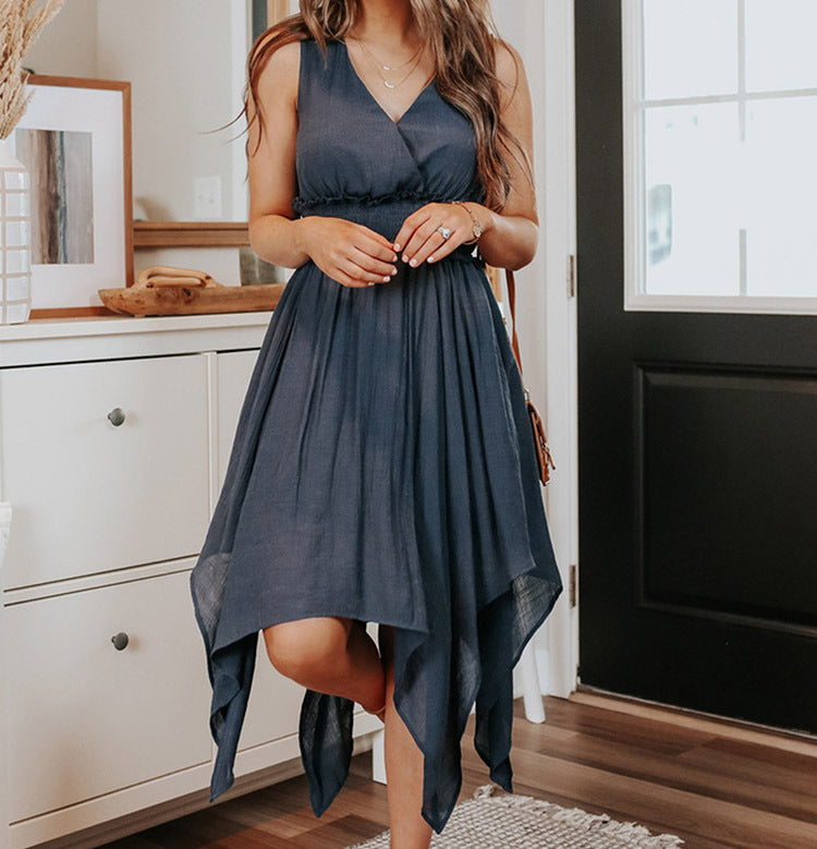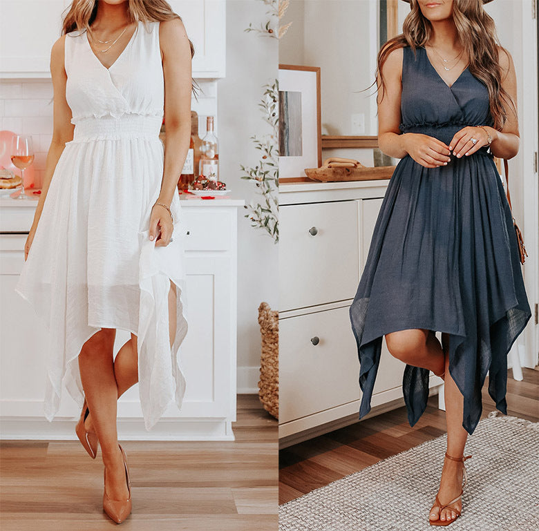 Modny krój z dekoltem w kształcie litery V 💃: Ta asymetryczna, marszczona gumowa sukienka midi z wysokim stanem i dekoltem w kształcie litery V, bez rękawów, łączy w sobie nowoczesny fason i elegancki design, dodając niepowtarzalnego uroku i sprawiając, że będziesz olśniewać przy każdej okazji.