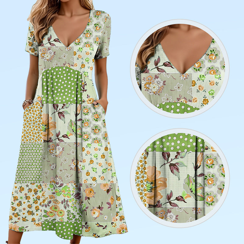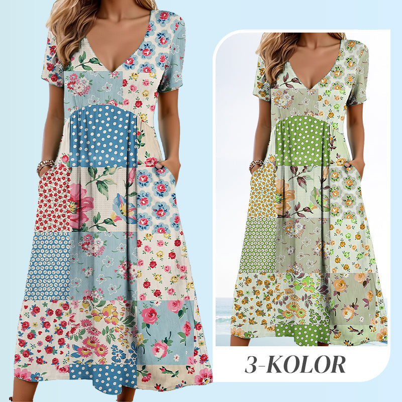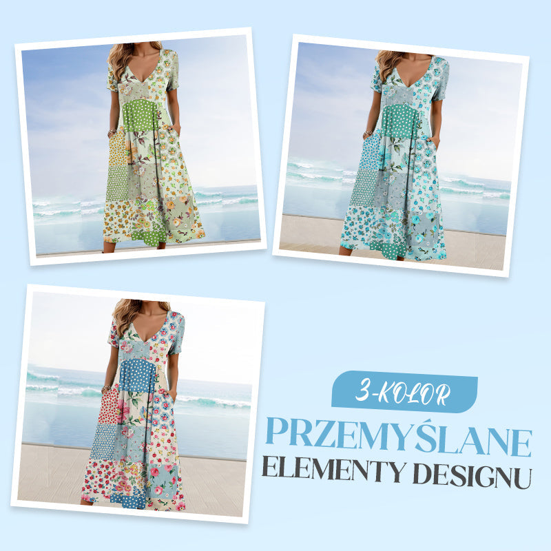 PRZEMYŚLANE ELEMENTY DESIGNU: Posiada korzystny dekolt w serek, który wydłuża tułów oraz praktyczne boczne kieszenie dla wygody. Krótkie rękawy oferują ochronę przed słońcem bez przegrzewania. Delikatne kwiatowe wzory i precyzyjne szwy świadczą o wysokiej jakości rzemiosła w każdym detalu.