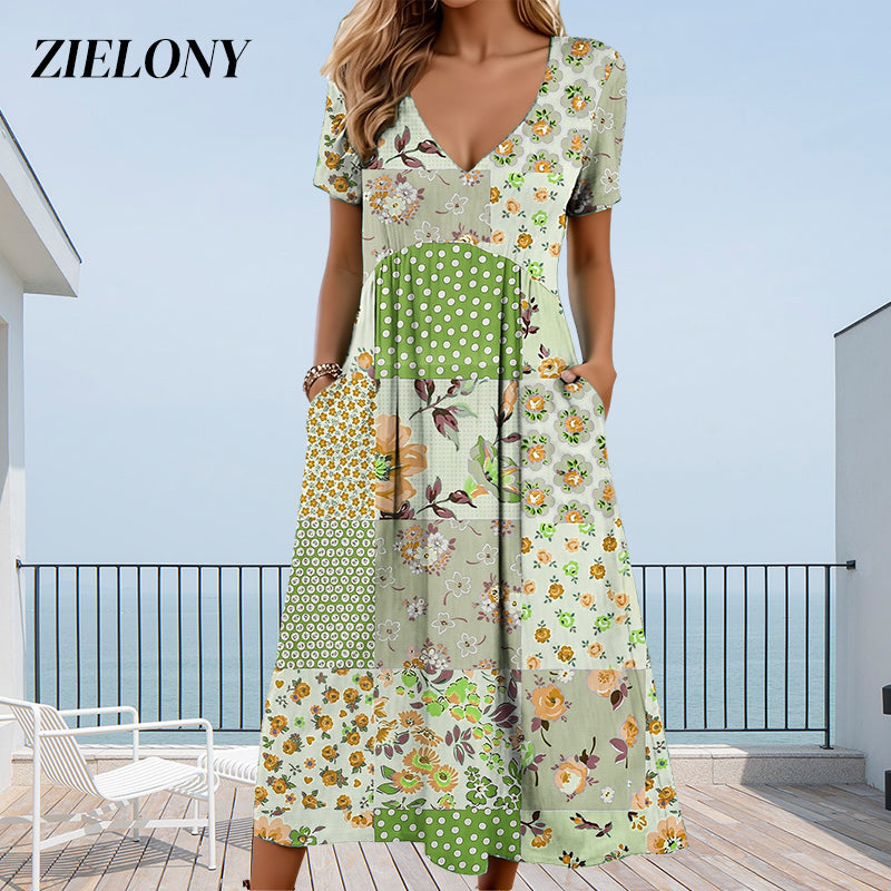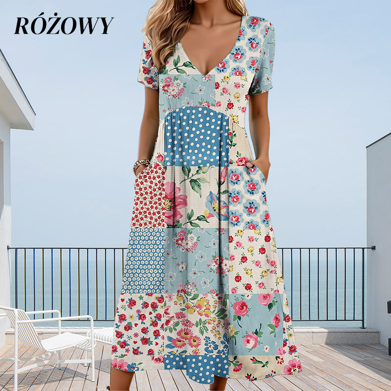 Zestaw zawiera: 1* Sukienki Kobiece z Dekoltem w Serek i Krótkim Rękawem w Wzory