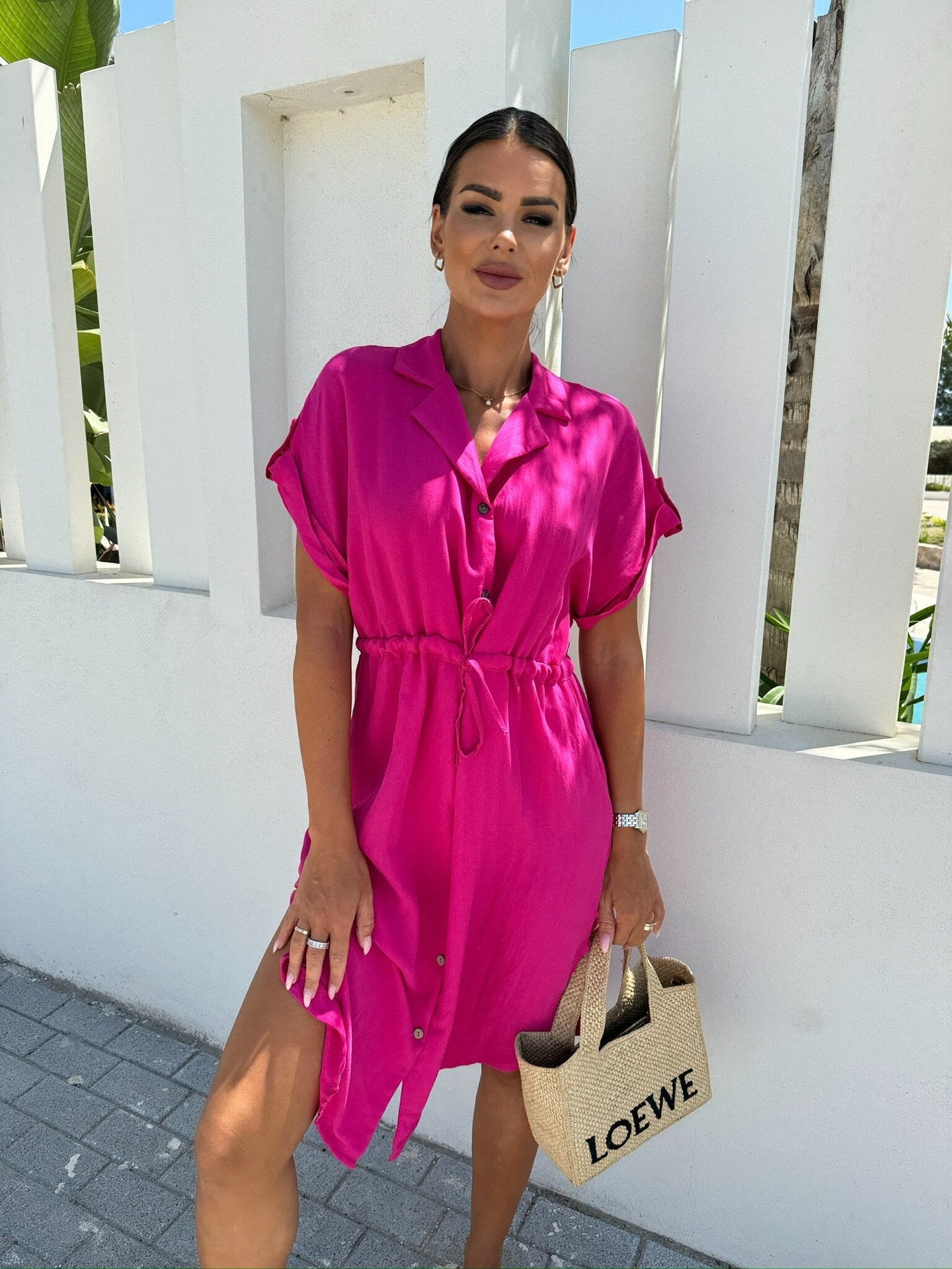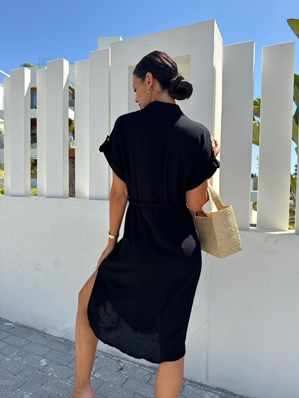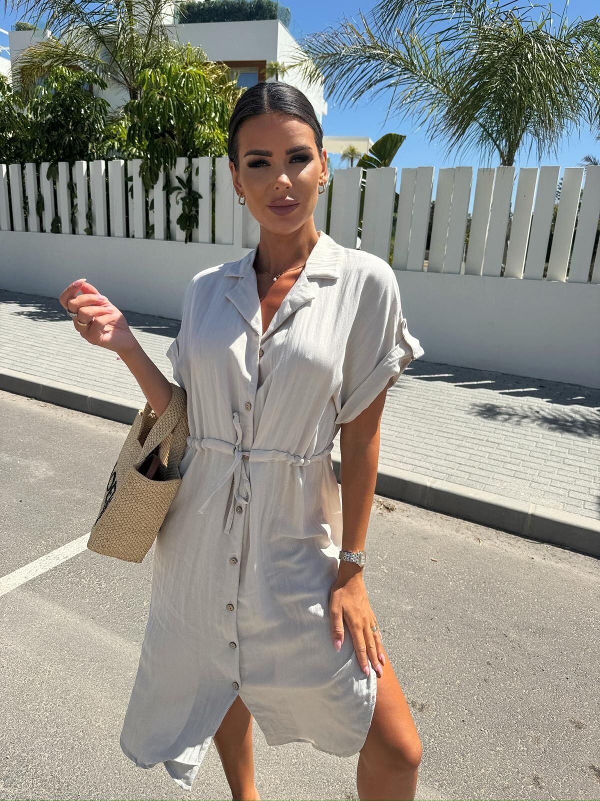 Uszyta z lekkiego i oddychającego materiału, ta sukienka z wdziękiem łączy klasyczną elegancję koszuli z klapami ze swobodnym urokiem sukienki.